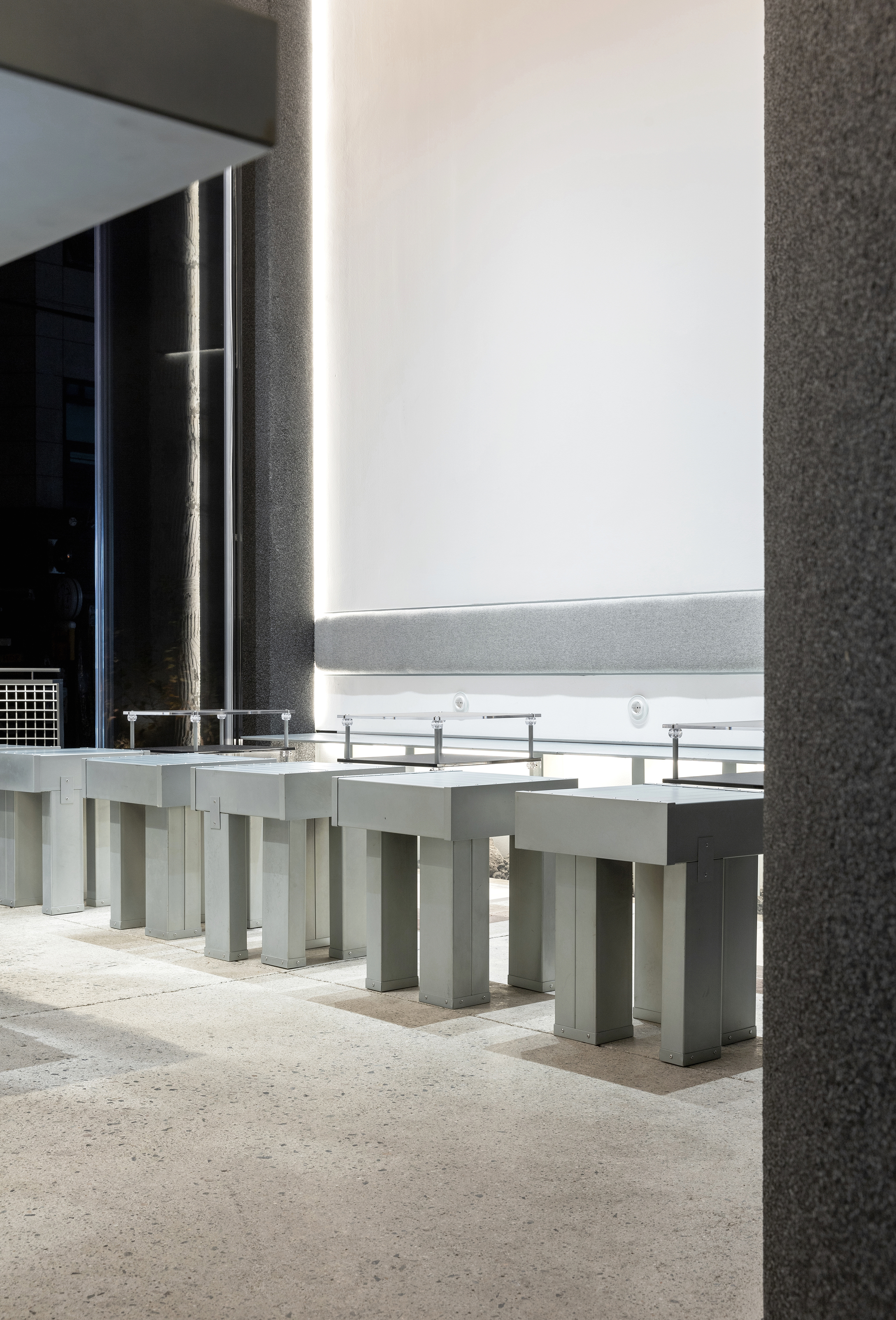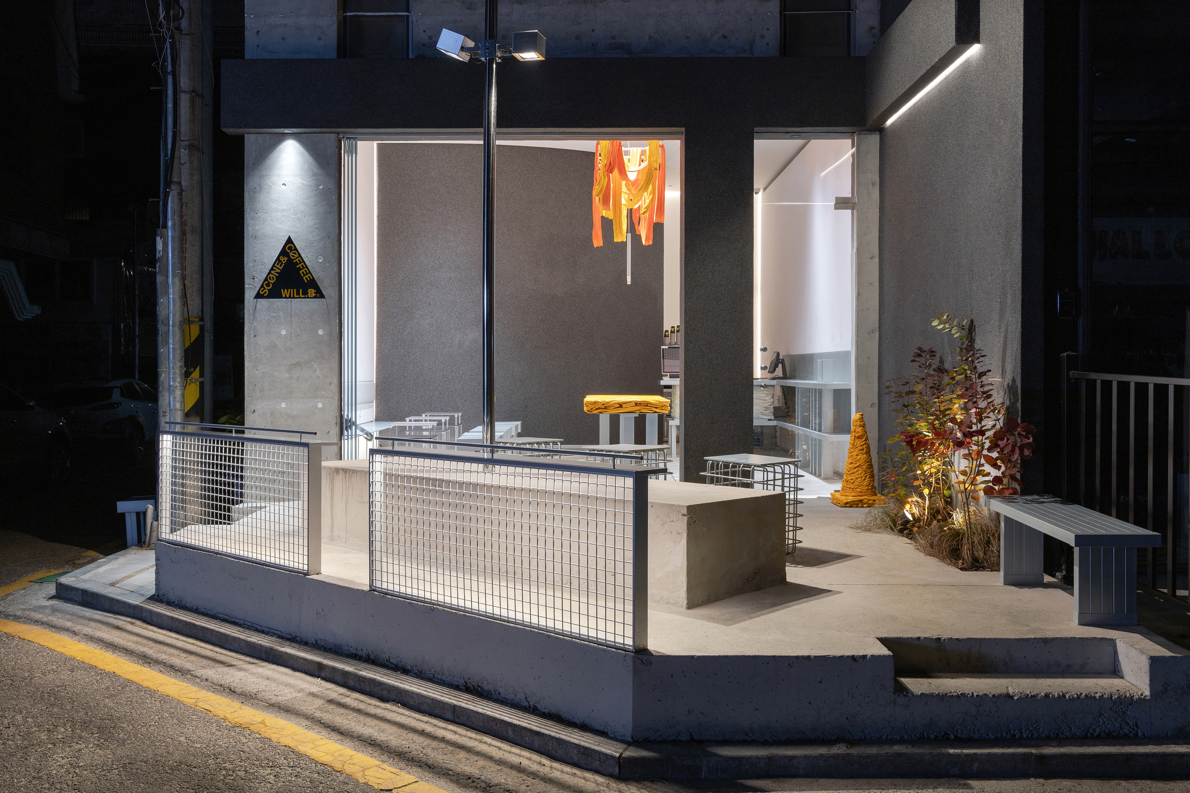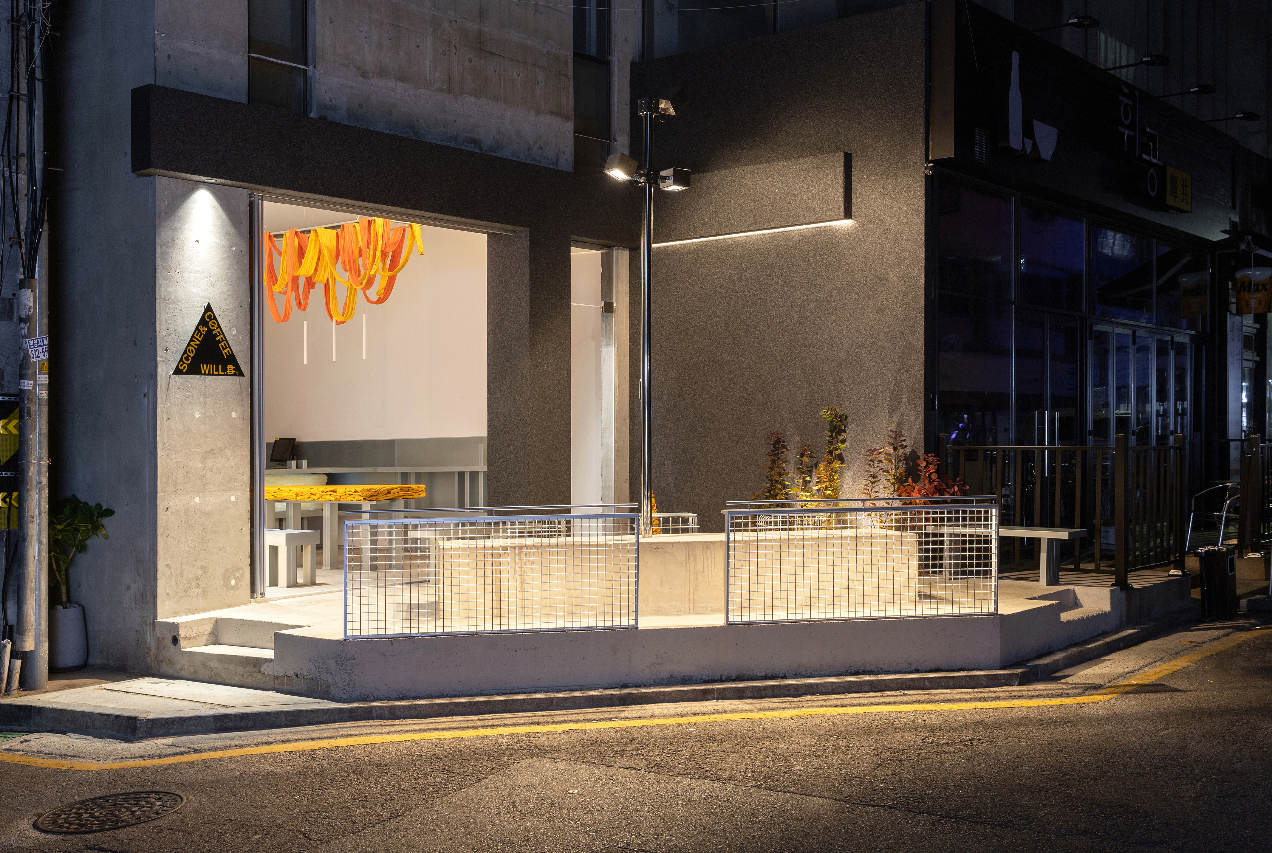Gangnam Market Alley, located behind Garosu-gil, is a place full of many restaurants, bars, and cafes, and a variety of commercial spaces are mixed together from old stores to trendy stores. In this street, where it seems difficult to breathe because of the high density of commercial spaces, we tried to approach it in a way that would give room to people on the road and reveal the presence of the building located. First, the faade was structured and organized so that the elevation structure of the concrete building could be revealed to the first floor, so that people passing by could feel the feeling of the building (a building with a scale rarely in the alley of Gangnam Market). Instead of taking a variety of tone and manners due to the nature of the narrow interior, the furniture was constructed with objects by artist Kang Young-min, who works using organic forms only where signature items, scones and bakery products, and through this, you can see the interior at a glance. Furniture such as stools and tables were also designed and produced by equating the external flow of the building, and it is intended that customers can feel the characteristics of artisan bakeries through the artist's objects and customized furniture. The terrace is outside, but when viewed from the inside, it has continuity and feels like an interior space. This is a point designed to feel the architectural scale even though it is a narrow space through the same finish use inside and outside.