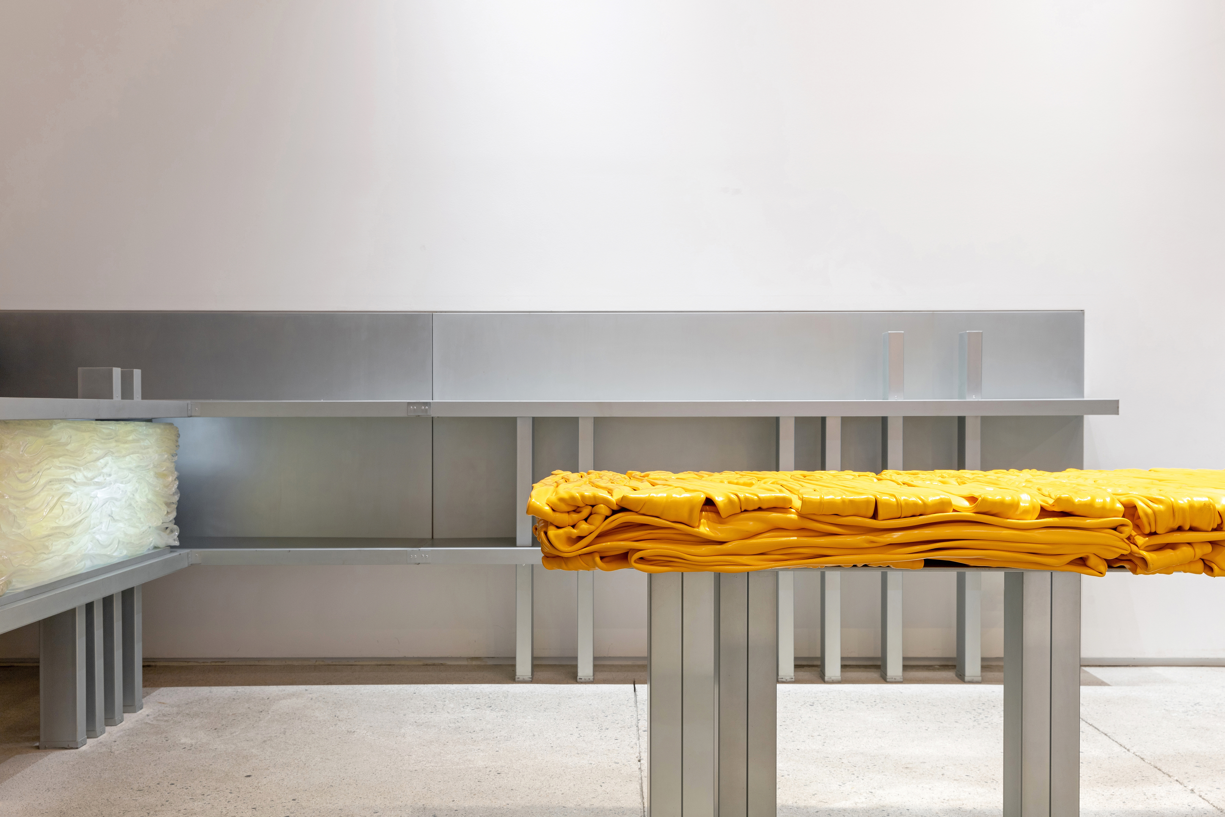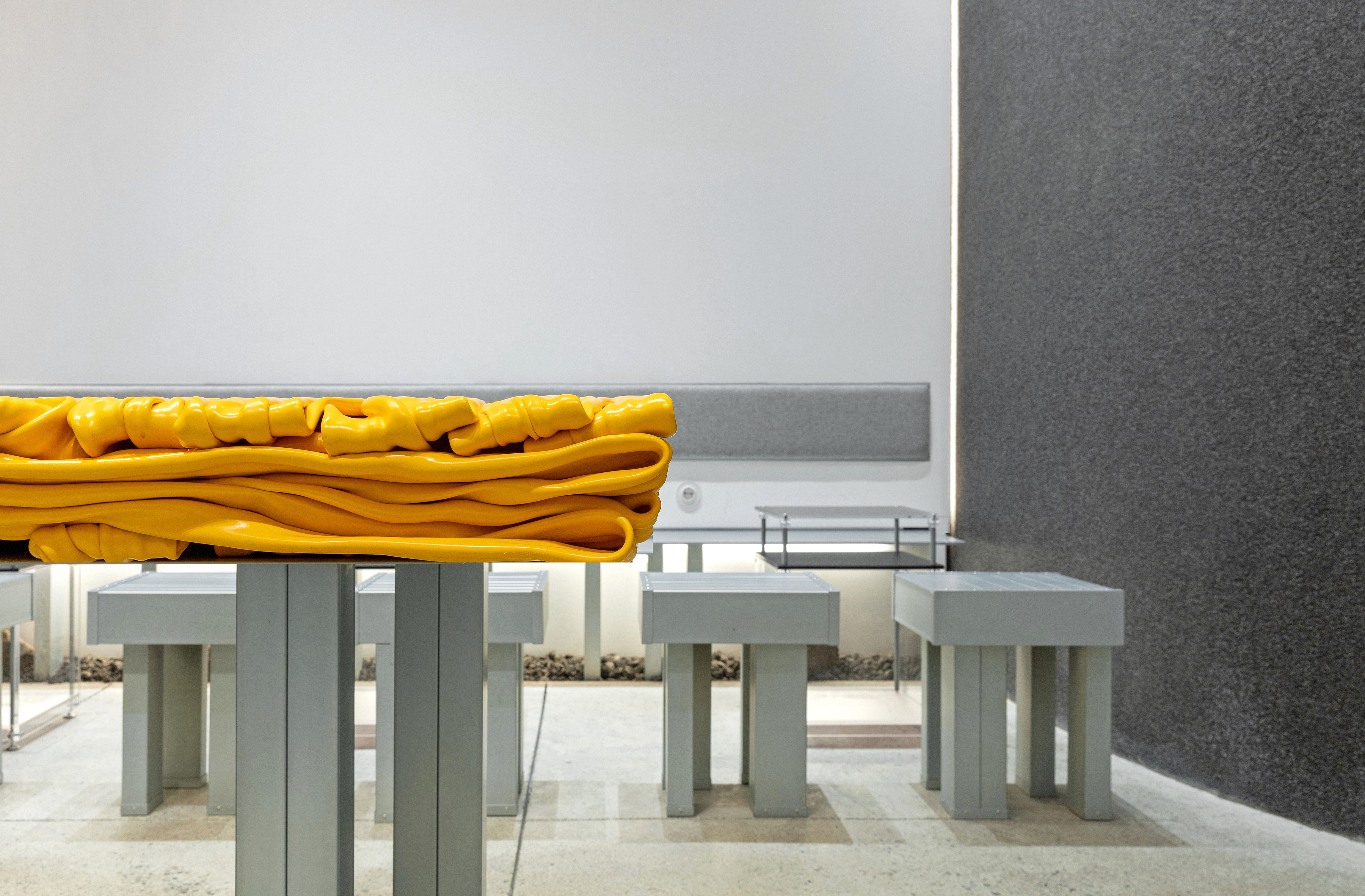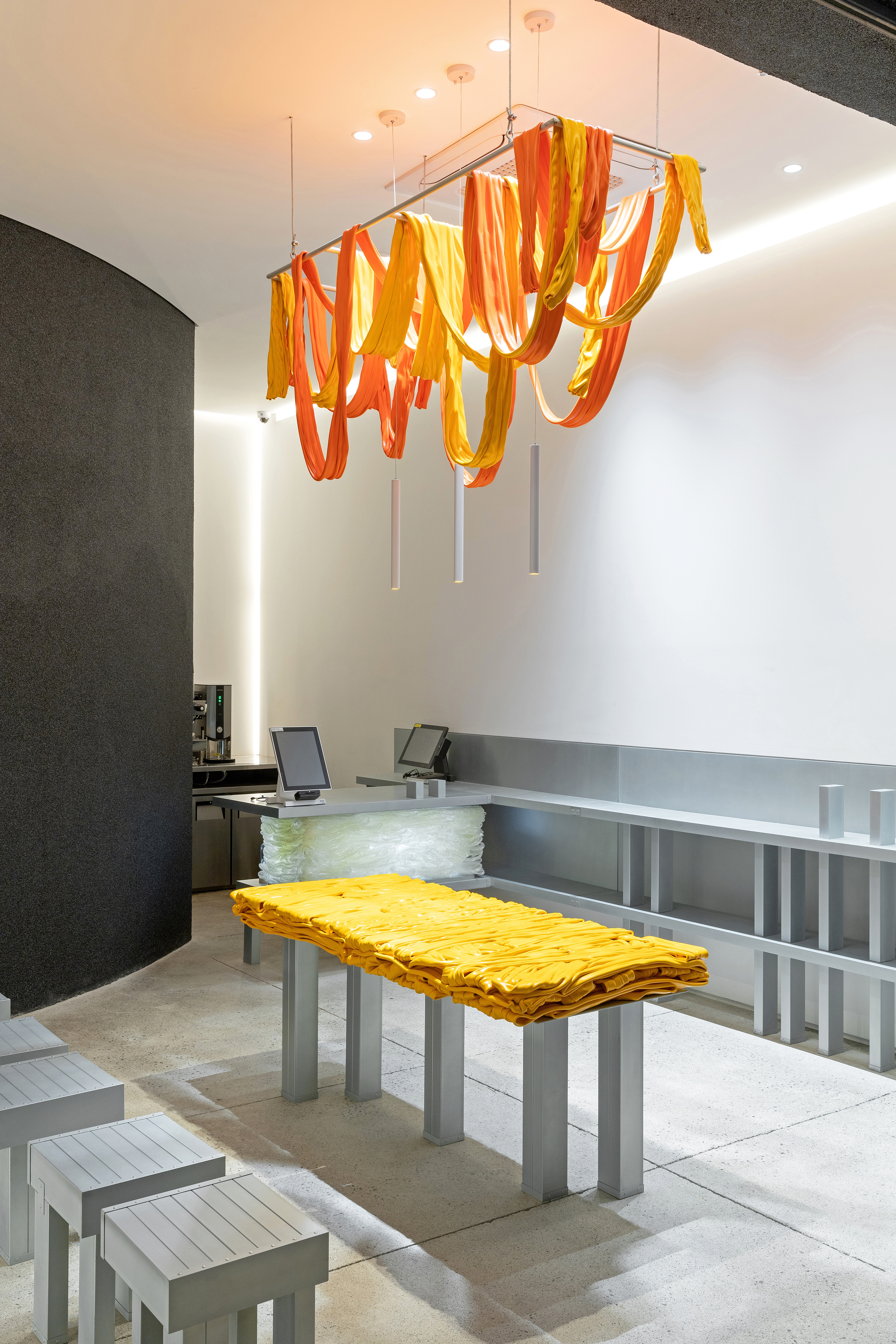 Gangnam Market Alley, located behind Garosu-gil, is a place full of many restaurants, bars, and cafes, and a variety of commercial spaces are mixed together from old stores to trendy stores. In this street, where it seems difficult to breathe because of the high density of commercial spaces, we tried to approach it in a way that would give room to people on the road and reveal the presence of the building located. First, the faade was structured and organized so that the elevation structure of the concrete building could be revealed to the first floor, so that people passing by could feel the feeling of the building (a building with a scale rarely in the alley of Gangnam Market). Instead of taking a variety of tone and manners due to the nature of the narrow interior, the furniture was constructed with objects by artist Kang Young-min, who works using organic forms only where signature items, scones and bakery products, and through this, you can see the interior at a glance. Furniture such as stools and tables were also designed and produced by equating the external flow of the building, and it is intended that customers can feel the characteristics of artisan bakeries through the artist's objects and customized furniture. The terrace is outside, but when viewed from the inside, it has continuity and feels like an interior space. This is a point designed to feel the architectural scale even though it is a narrow space through the same finish use inside and outside.