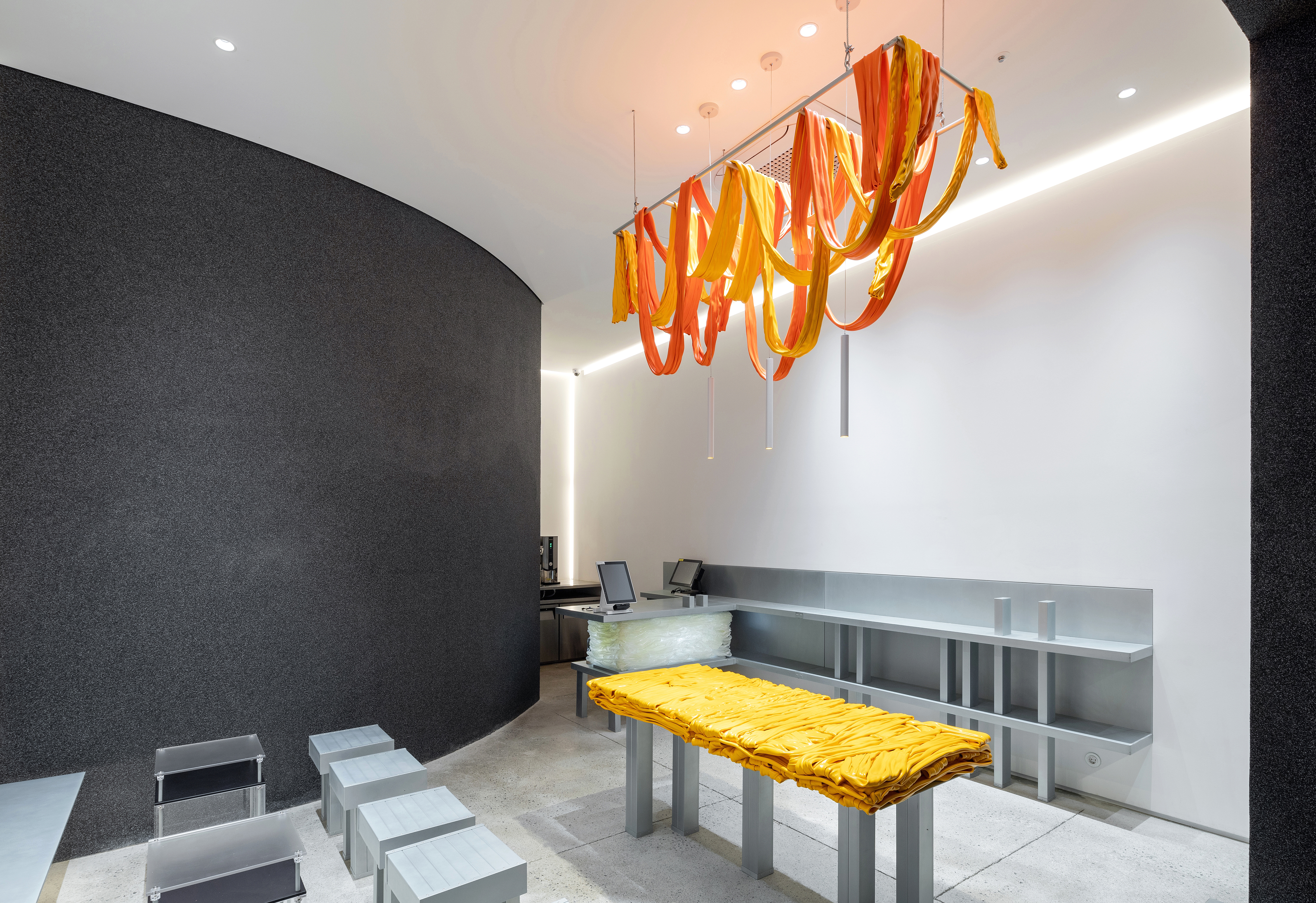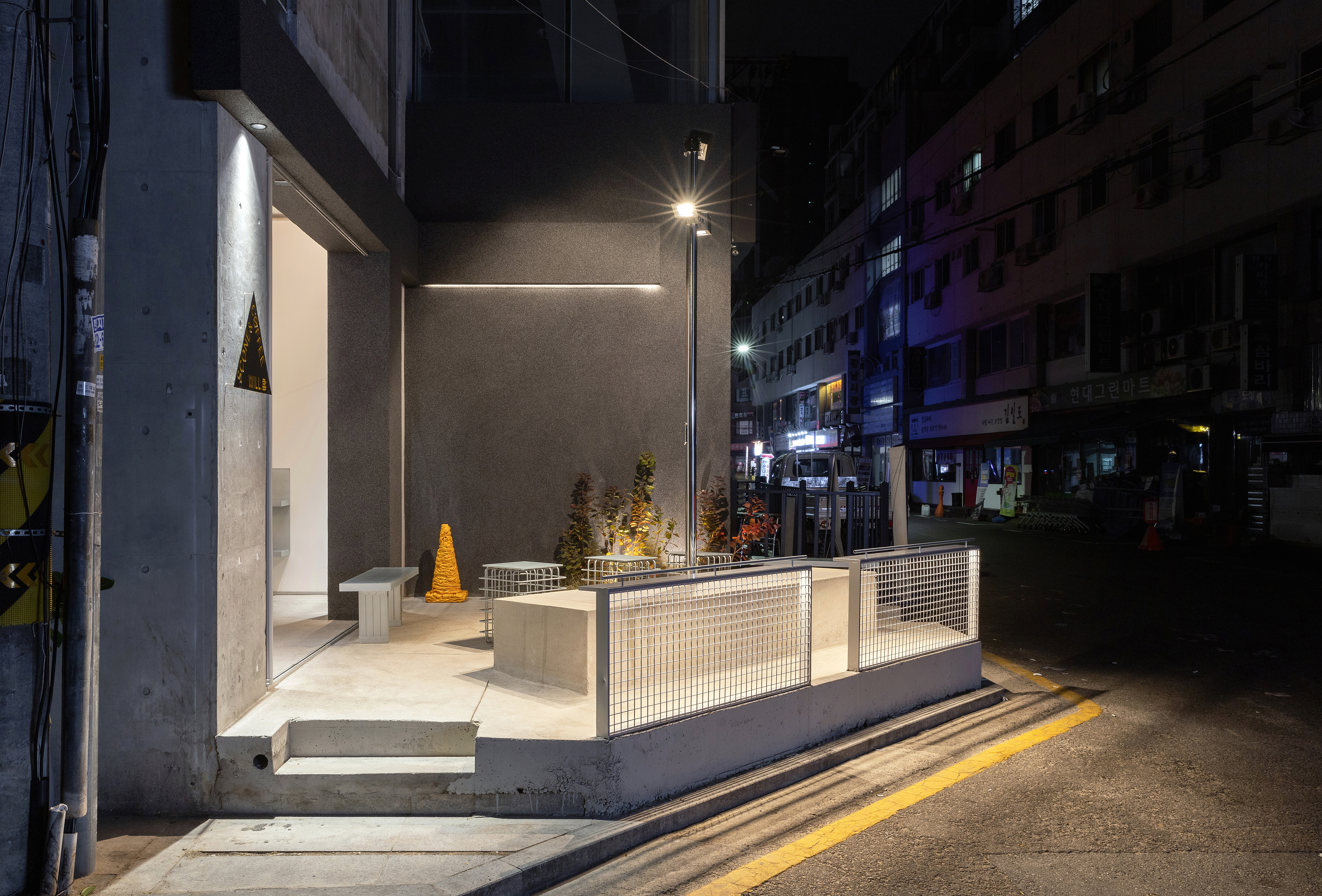 Gangnam Market Alley, located behind Garosu-gil, is a place full of many restaurants, bars, and cafes, and a variety of commercial spaces are mixed together from old stores to trendy stores. In this street, where it seems difficult to breathe because of the high density of commercial spaces, we tried to approach it in a way that would give room to people on the road and reveal the presence of the building located. First, the faade was structured and organized so that the elevation structure of the concrete building could be revealed to the first floor, so that people passing by could feel the feeling of the building (a building with a scale rarely in the alley of Gangnam Market). Instead of taking a variety of tone and manners due to the nature of the narrow interior, the furniture was constructed with objects by artist Kang Young-min, who works using organic forms only where signature items, scones and bakery products, and through this, you can see the interior at a glance. Furniture such as stools and tables were also designed and produced by equating the external flow of the building, and it is intended that customers can feel the characteristics of artisan bakeries through the artist's objects and customized furniture. The terrace is outside, but when viewed from the inside, it has continuity and feels like an interior space. This is a point designed to feel the architectural scale even though it is a narrow space through the same finish use inside and outside.