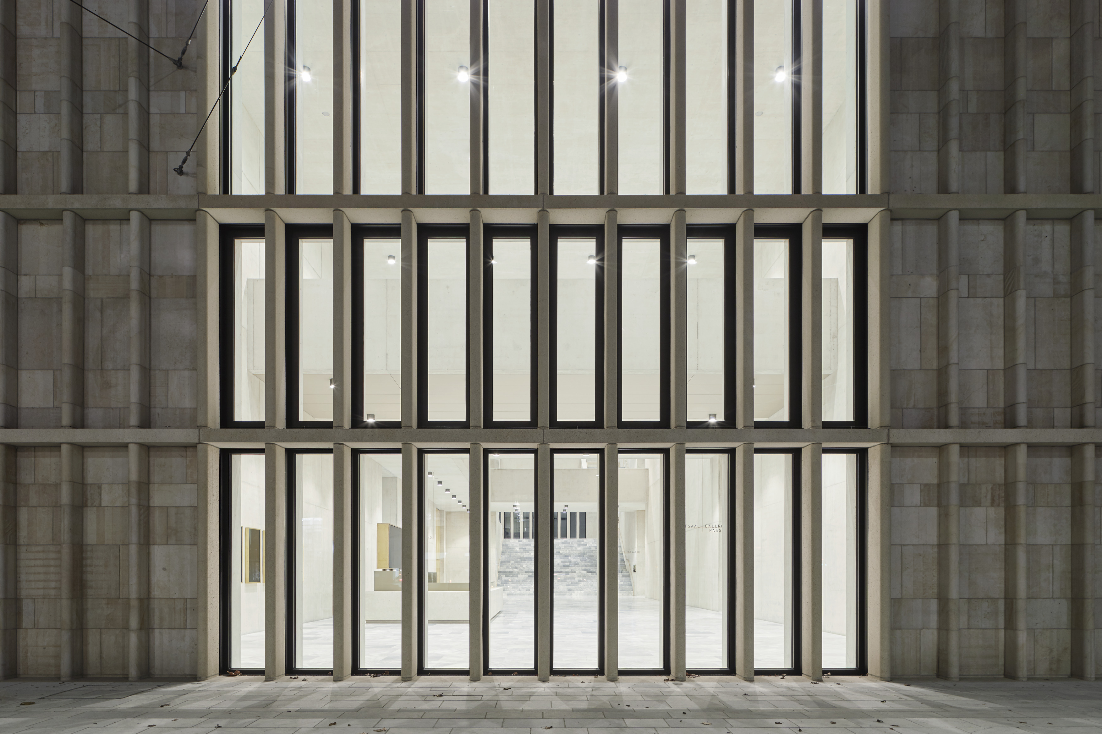 The urban concept for the extension envisaged the placement of a clear geometric volume on the northern edge of the square. The building form takes inspiration from the old cantonal school, built in 1842 to the north of the site, which defines the urban frame with its architectural clarity. The urban plan defines two new external spaces: the urban square to the south, framed on all four sides by buildings and the new Garden of Art to the north as an open and permeable natural environment. An expansive entrance hall, spanning the full length of the building, creates a link between these two new urban spaces. Due to its low-threshold accessibility it likewise acts as a public link between the institution and the city. A visitor passageway running underneath the square connects the new building with the existing Kunsthaus, creating one institutional entity. The architectural identity is modelled on traditional stone façades, as found in the existing Kunsthaus and many other significant public buildings in Zurich. The extension is therefore embedded in a building culture that is an expression of an enlightened civil society. The new building combines tradition and innovation through slender vertical fins crafted from local Jurassic limestone with sawn surfaces and placed at regular intervals in the façade, embedding the building it its urban and cultural context in a contemporary manner.