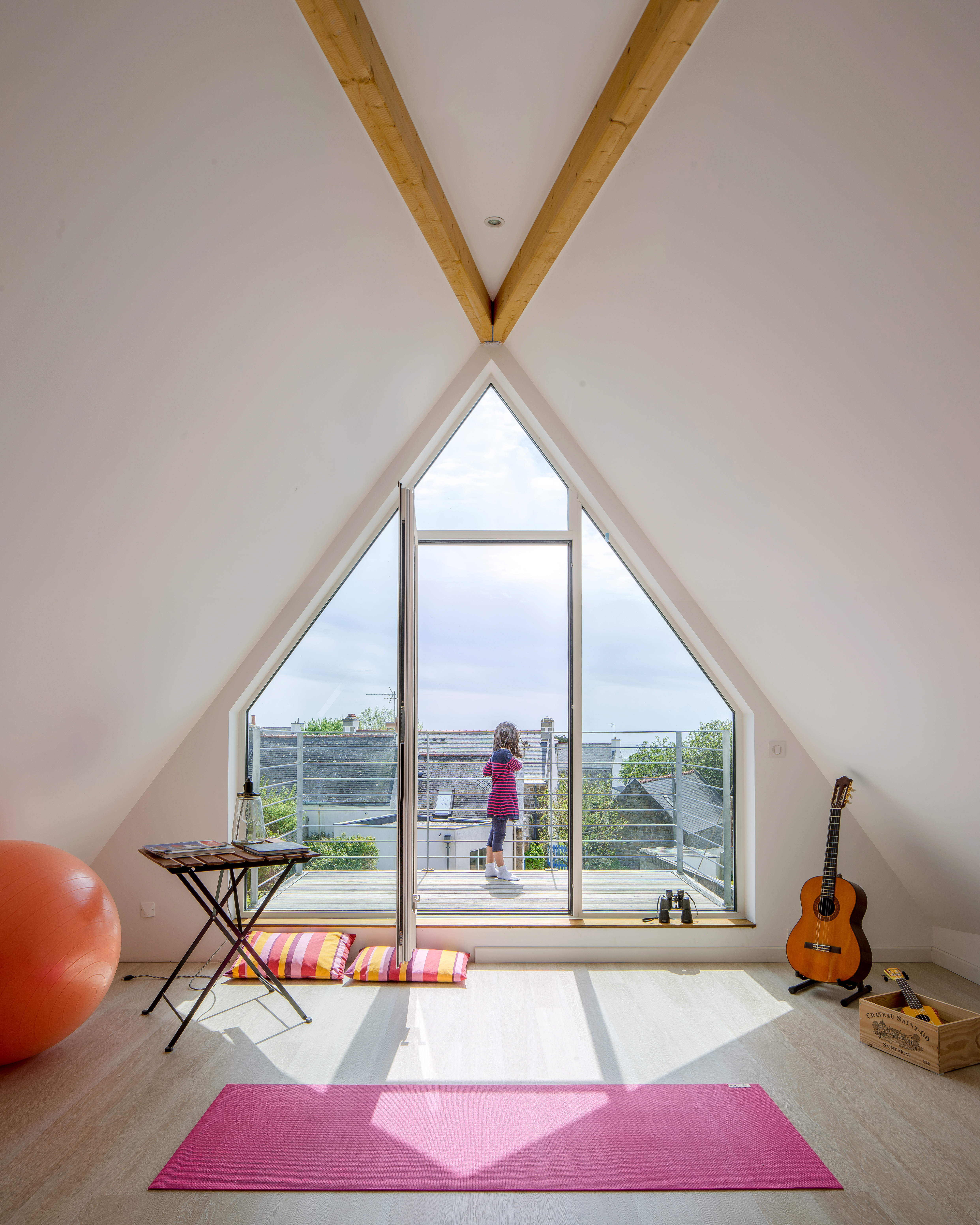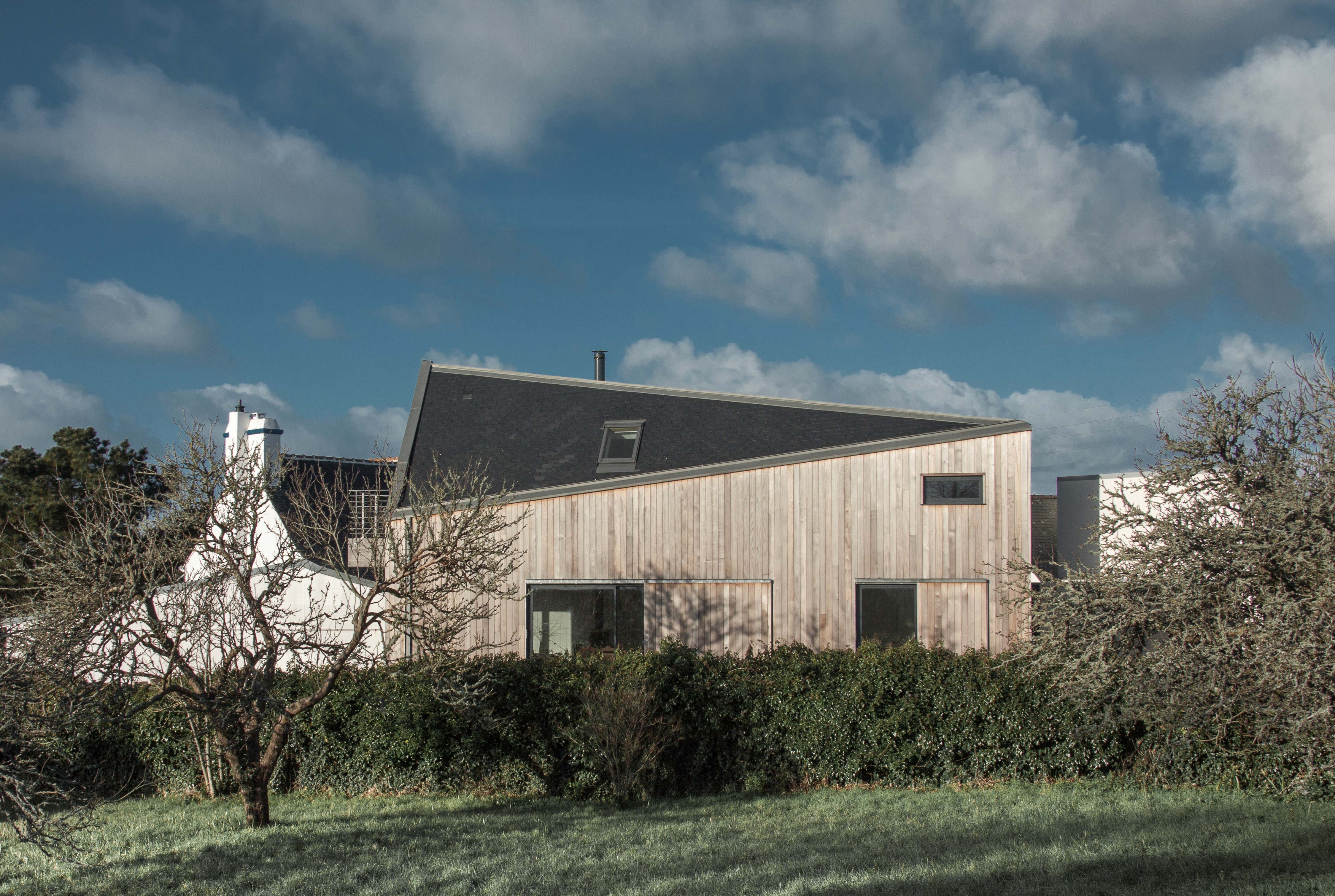 The project is located on a narrow and irregular piece of land, at the edge of a block and at the entrance of the village. Considering the peculiarity of this location, a traditional compact house would have had a strong impact on the surrounding landscape. Therefore, the architect chose to split the house into three volumes, each one being parallel to one edge of the plot of land. The main house, a barn house-like wooden structure, is situated below while two lower blocks occupy the upper part of the land. The three-slope roof and the different levels optimize spaces while minimizing the size of the building, providing a view on the ocean with a minimal impact on the surrounding landscape. More than being a mere reinterpretation of the local traditional barn house, this project is an answer to a very particular and irregular piece of land, and to a very specific urban tissue with a wide range of architectural typologies. The project is dynamic, and its perspectives are consistently changing. Seen from its South side, the house echoes with the traditional barn houses, while from the North side, it shows very contemporary lines.