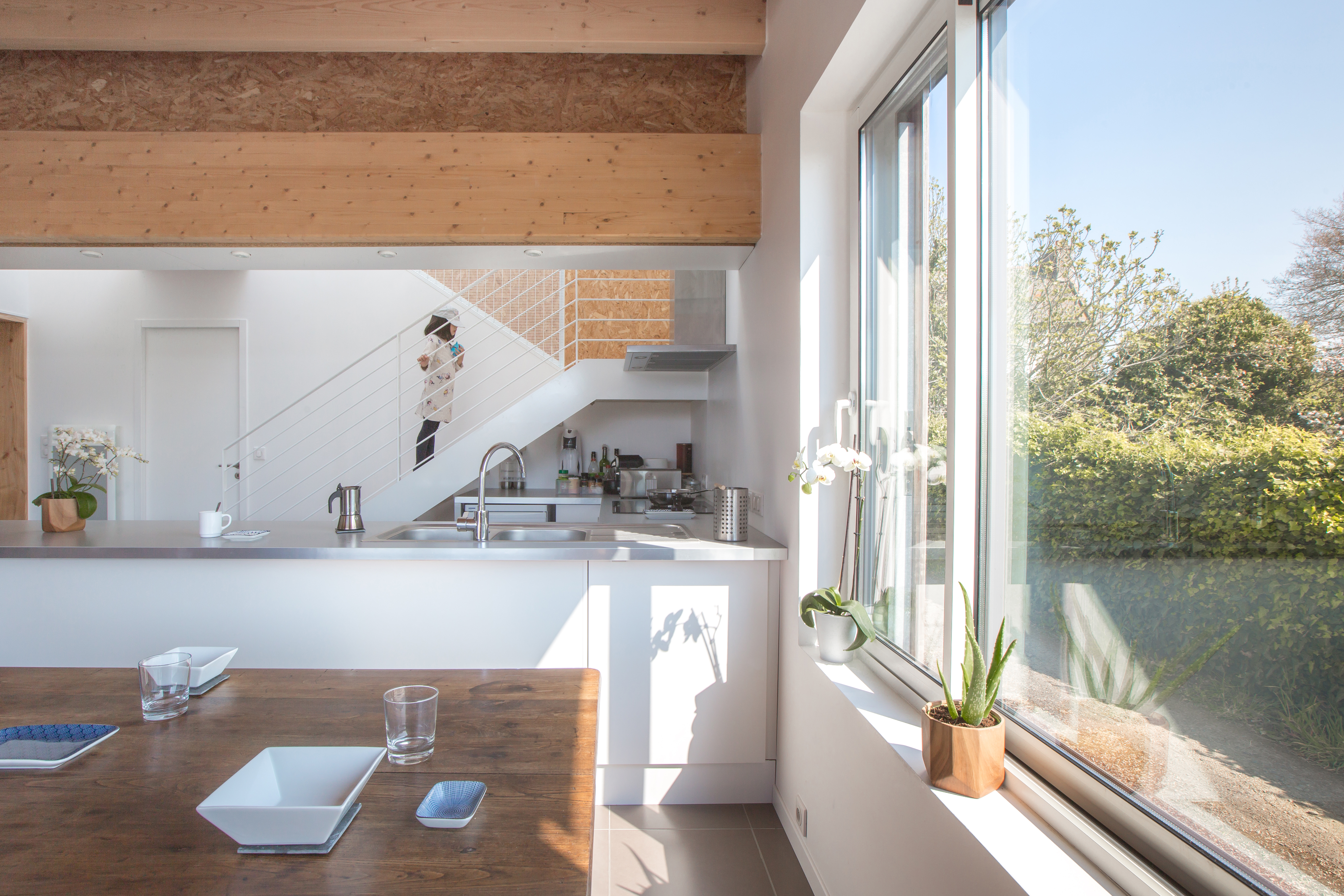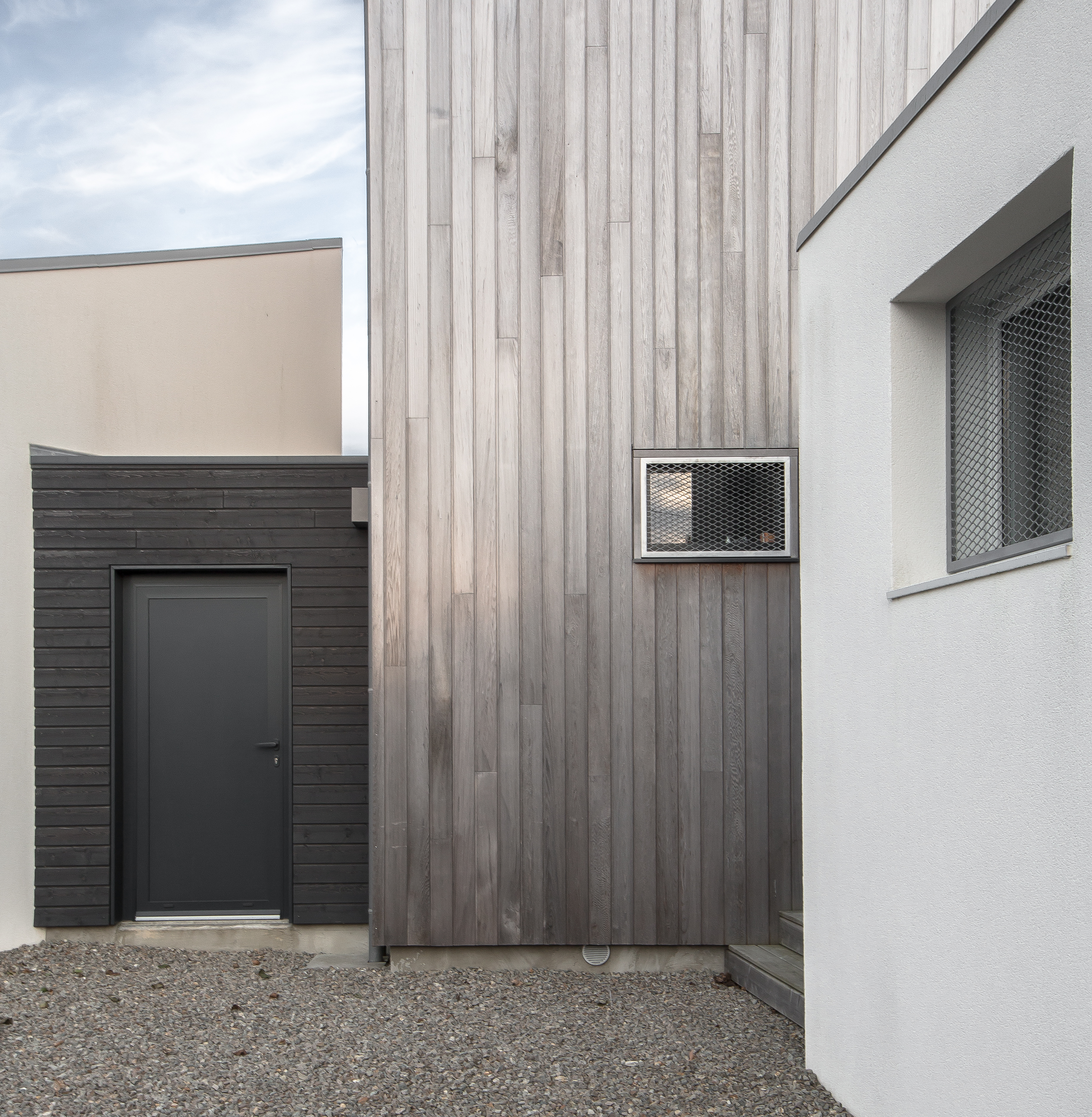 집을 구성하는 다양한 재료는 서부의 연필향나무 클래딩, 혼합 슬레이트/아연 지붕, 흰색 벽 코팅 및 검은색 스테인드 목재 등 주변 색상 및 요소의 다양성과 함께 메아리친다. 기능적 배치는 생물기후학적 설계 원칙과 부지의 조건을 기반으로 한다. 북쪽의 주차장은 음향 및 기후 스크린을 생성하고 주요 공간은 남쪽의 바다를 향하며 침실은 동쪽을 향한다. 집의 중앙에는 채광 창을 설치하여 대부분의 공간에 자연광을 들이고, 계단을 따라 있는 철망은 위의 구름의 움직임과 함께 계속 변화하는 투명도를 제공한다. 이 매우 특정한 철망은 현지 어부들이 조개를 잡기 위해 사용하는 것이다. 내부에서 드러나는 목재 구조는 건설 과정을 완벽하게 제어하기 위해 디지털 방식으로 사전 제작되었다.