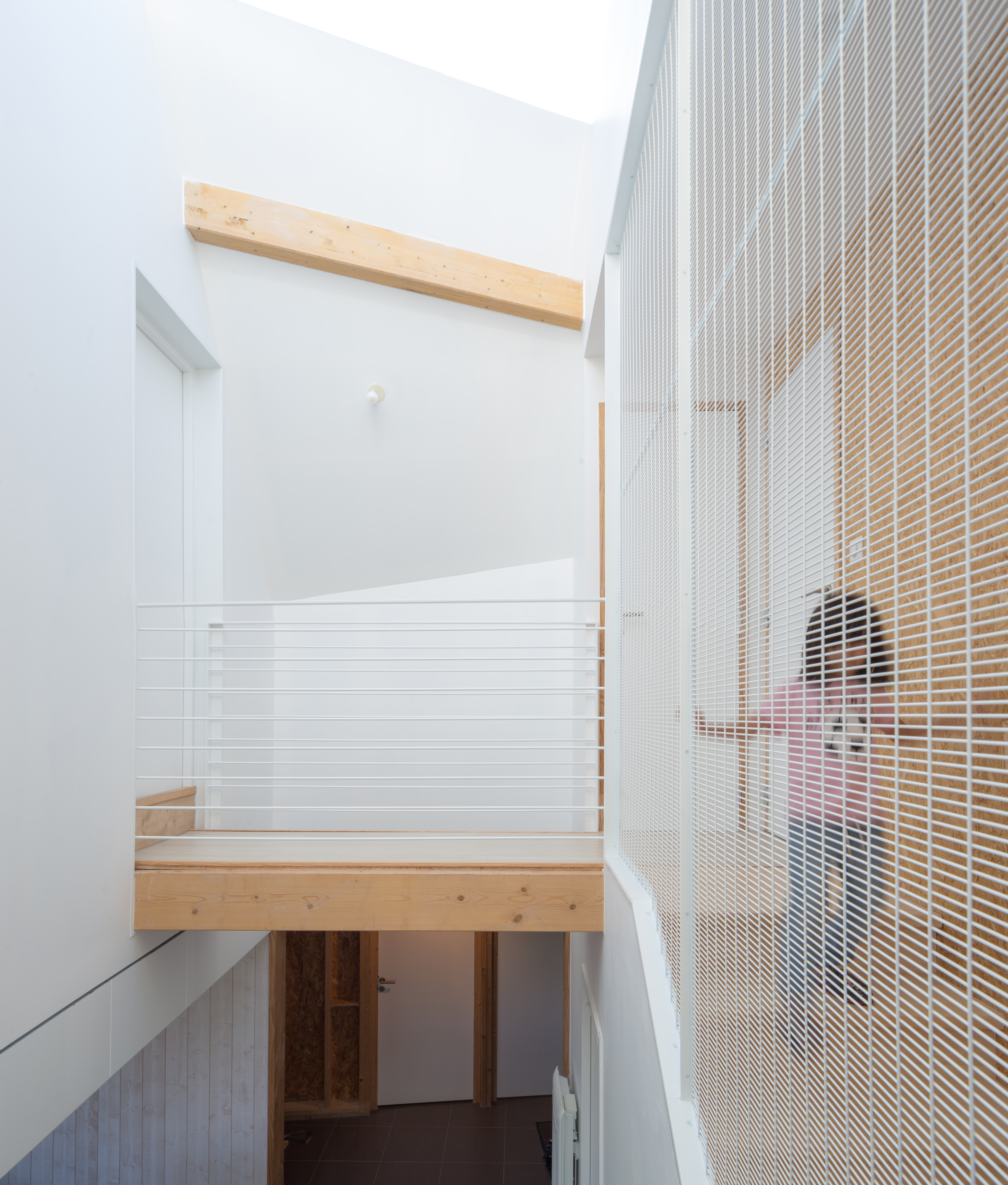 The different materials composing the house are echoing with the diversity of the surrounding colors and elements: western red cedar cladding, mixed slate/zinc roofing, white wall coating and black stained wood. The functional layout is based on bioclimatic design principles and site conditions: the car park at North side creates an acoustic and climatic screen, the main spaces face the ocean towards South, while the bedrooms face the East. A skylight is located in the middle of the house bringing natural light to most of the space, and steel mesh along the stairs creates a transparency that keeps changing together with the motion of the clouds above. This very specific steel mesh is used by local fishermen to catch local seashells. The wood structure – visible from the inside - was digitally prefabricated in order to get complete control over the construction process.