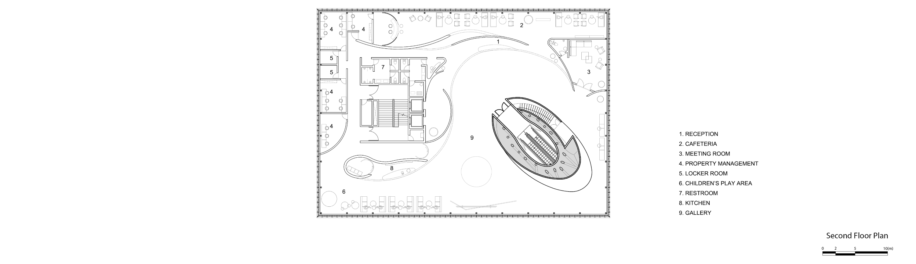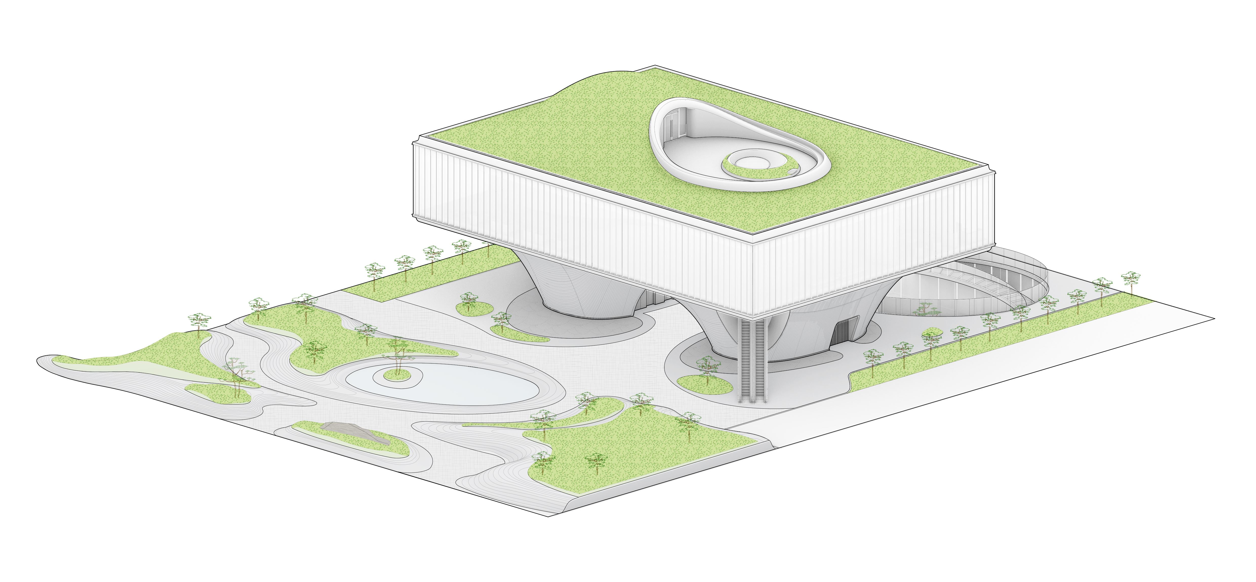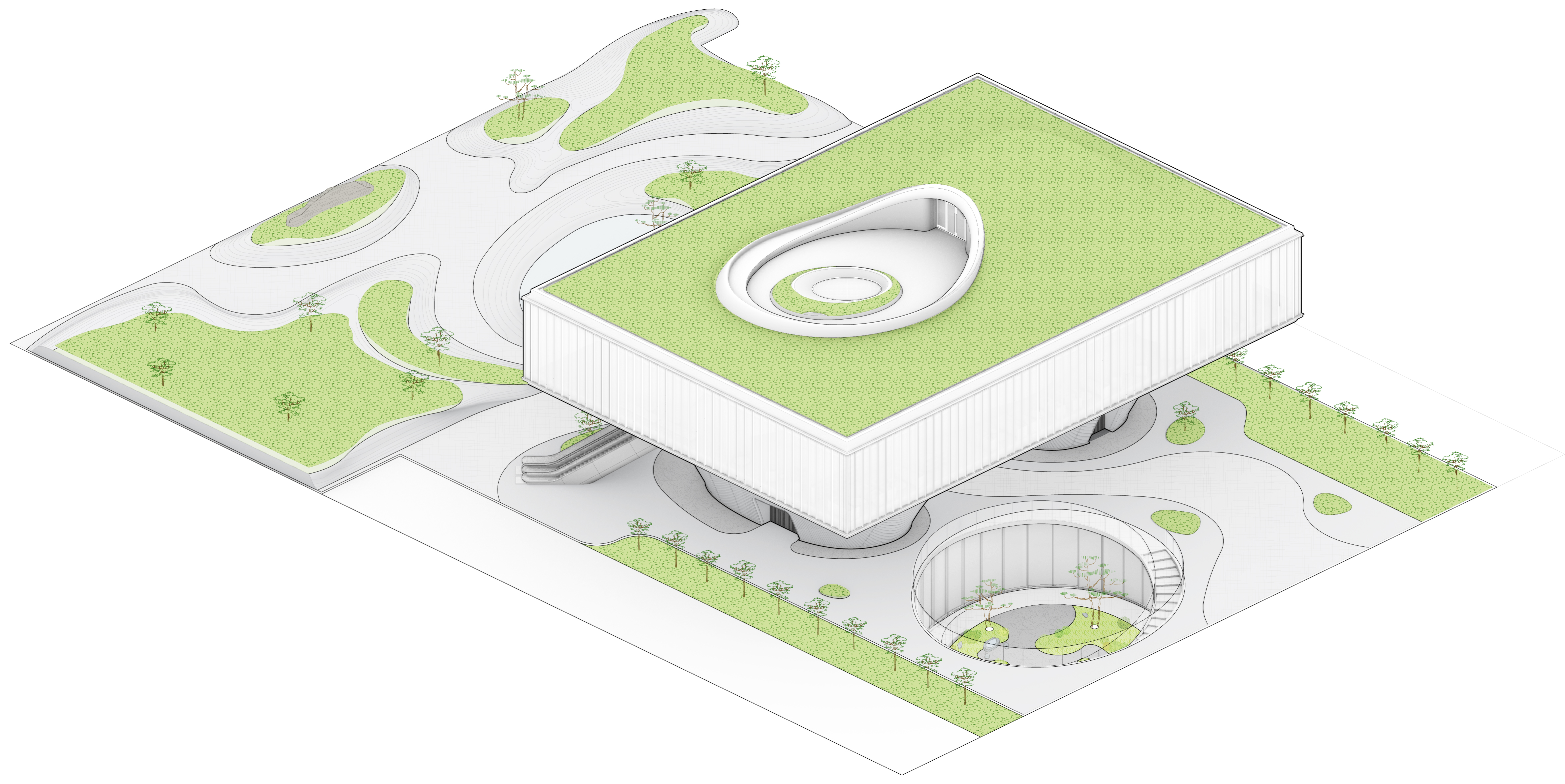 Located in the new district of Fengdong near Xi’an, LAND Community Center serves as a social and cultural venue for the burgeoning neighborhood. Conceived as a floating gateway for a new residential development, LAND Community Center consists of community service center, cafeteria, gallery, multi-purpose room for educational and recreational purposes, reading room, a daycare center for children, it also provides a gymnasium for badminton and basketball courts, a fitness workout room and swimming pool below grade. These recreational spaces are organized around an oval sunken courtyard to allow the natural light to penetrate into the underground facilities.