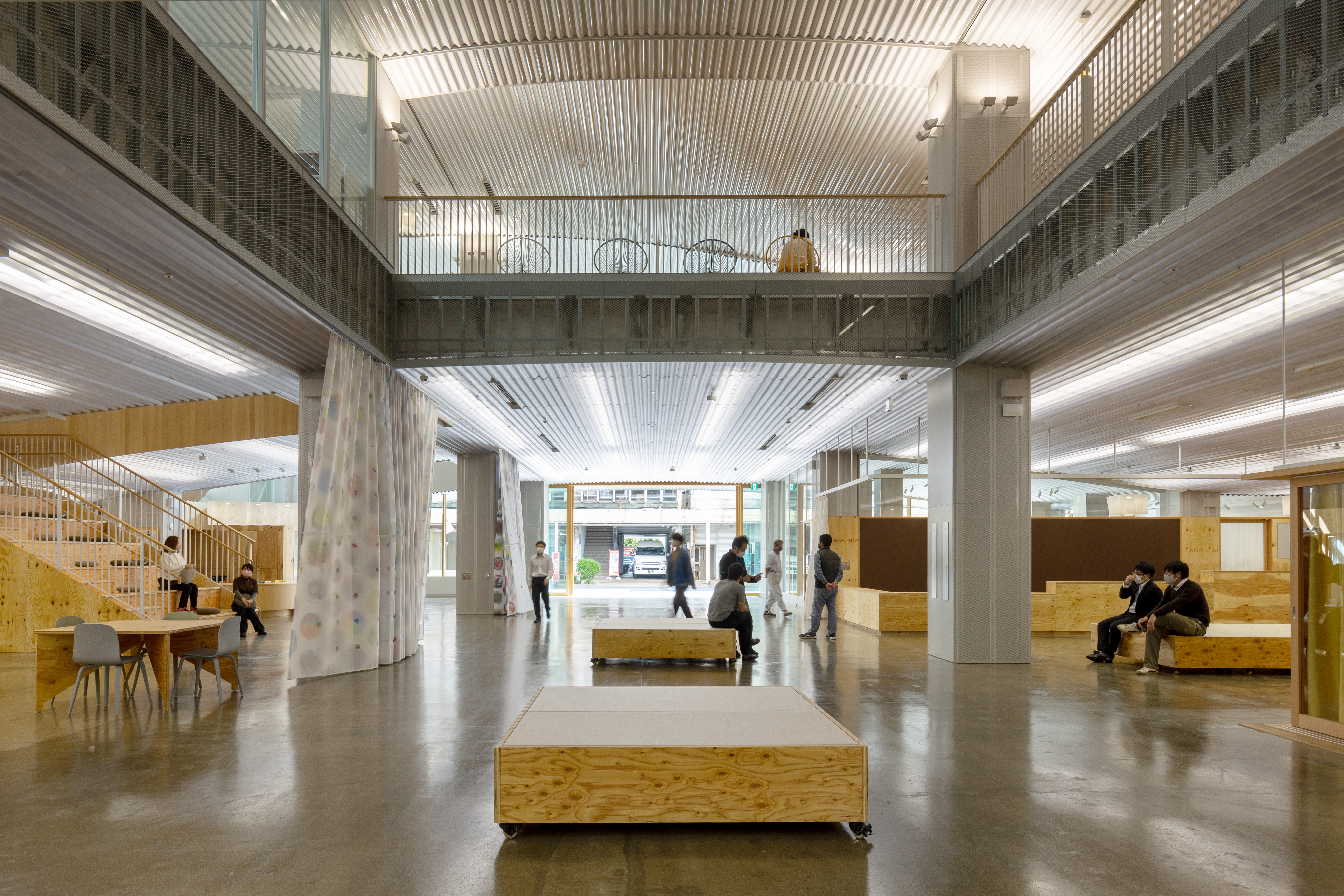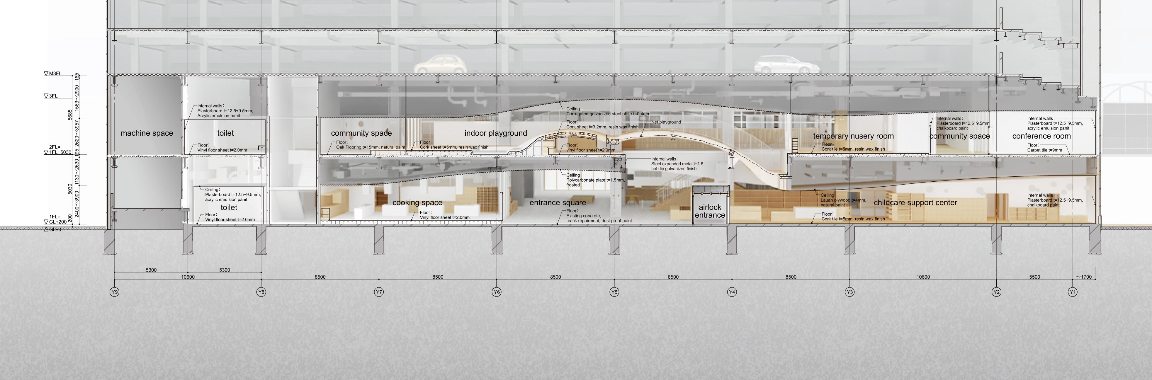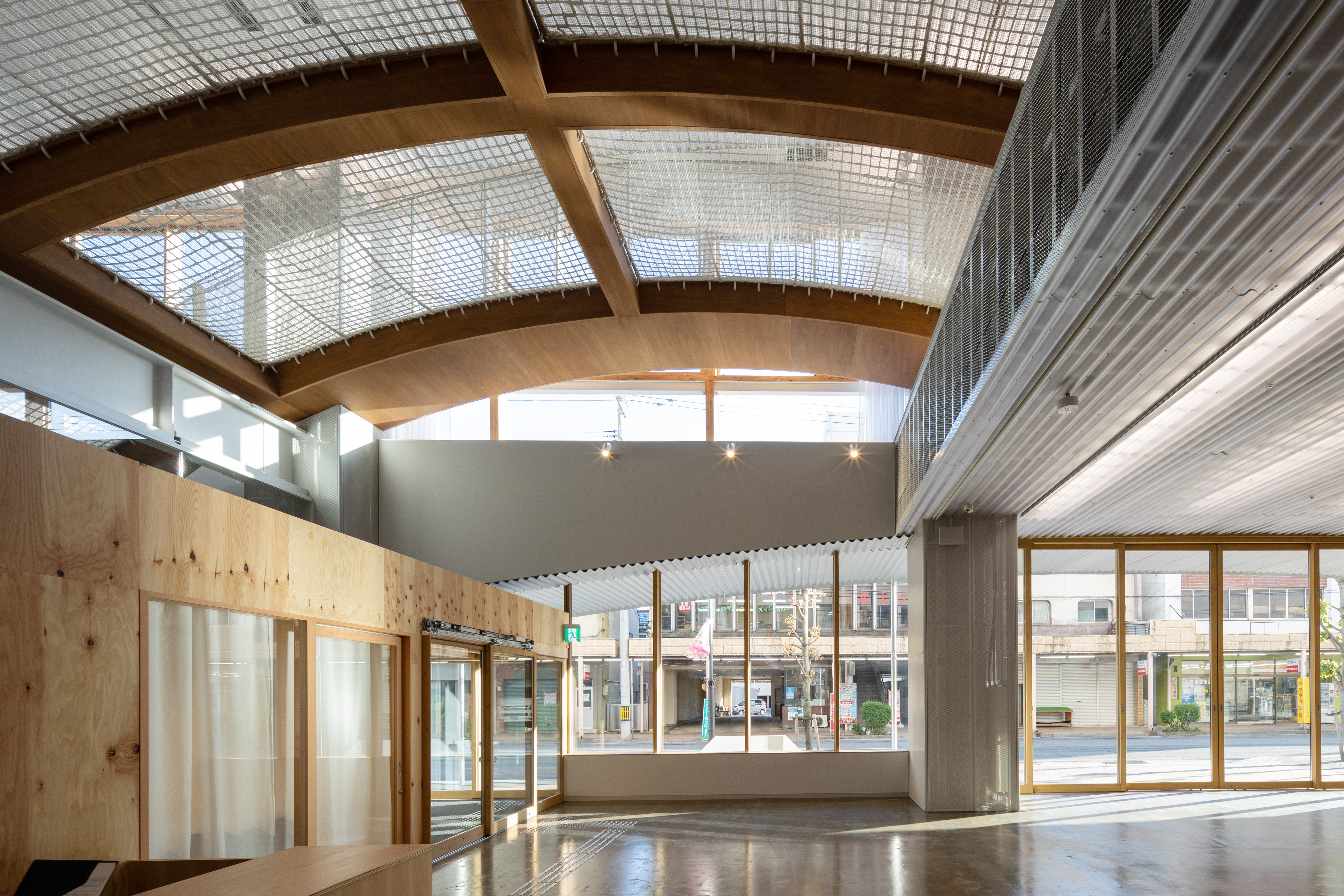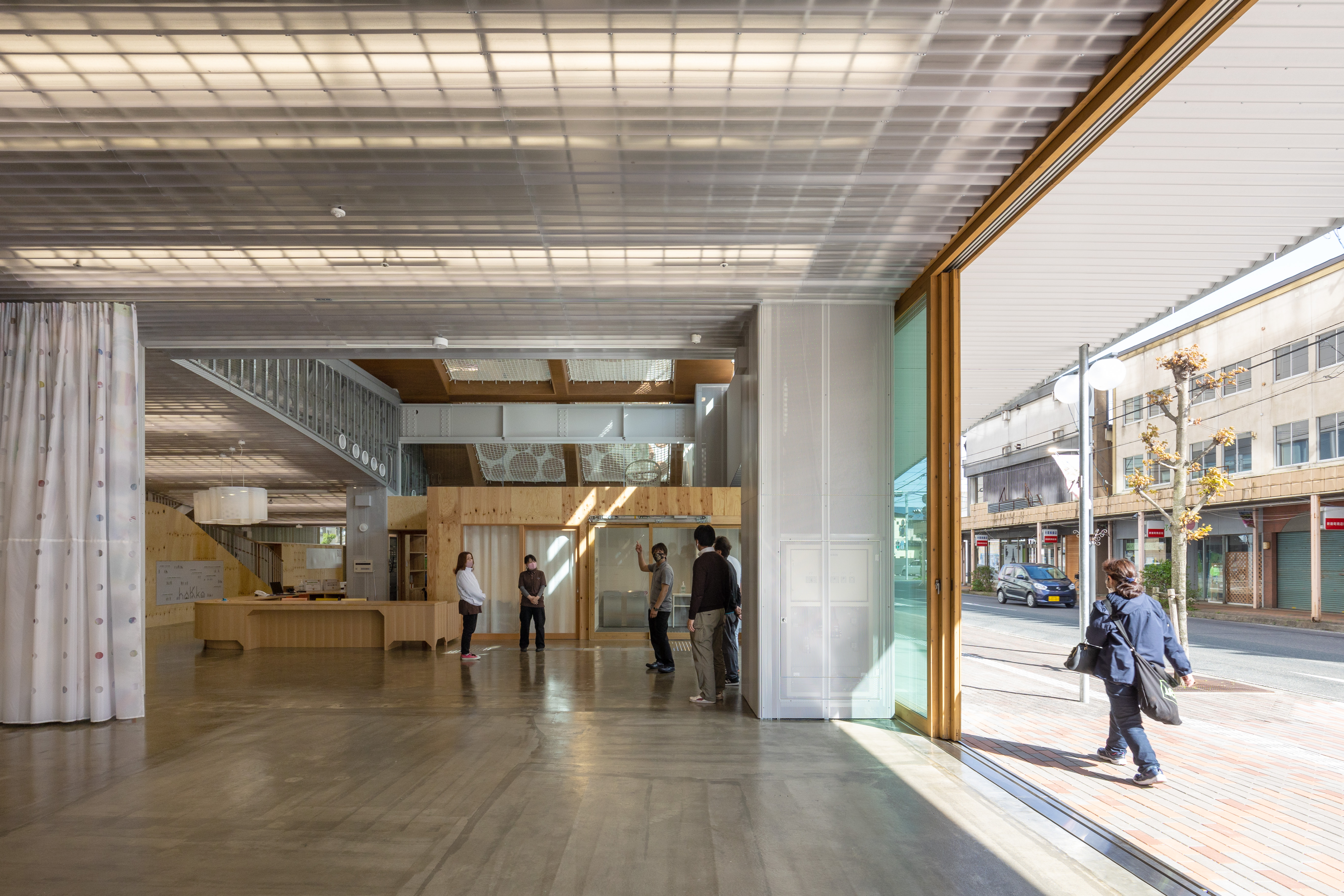 This project involves the conversion of the first and second floors of an eight-story commercial building located in the city center into a health and childcare support complex. In addition to providing functions including a hall for medical checkups, indoor playground, exhibition/lecture hall, consulting room, rental room, and office, we also aimed to create open spaces where people can freely visit and spend time not only for these purposes. The existing building consisted of simple rectangular grids with a floor area of about 2000㎡. There were hardly any openings in the exterior walls, so the interior of the building could not be seen from outside. For this reason, we decided to create an indoor plaza occupying two structural spans in depth by four structural spans in width in the center of the first floor and connect it to the city at large. It is a high-ceiling space partially with an atrium, equipped with a cafe and consultation counter and serving as an entrance and waiting area to the surrounding rooms with various functions. In addition, it is designed as a multi-purpose plaza that can accommodate mobile medical and catering vehicles, and host events. The entire floor, with the indoor plaza at the center, is covered by a gently undulating luminous ceiling. The ceiling, with a height difference of about 1.5m from 3.9m to 2.4m, is designed to ensure minimum head clearance for vehicles while leaving adequate duct space above the ceiling. Shadows and undulations created by the luminous ceiling give a sense of depth to the space. Under the undulating luminous ceiling, we have provided a variety of seating areas, both “with-shoes” and “shoe-free,” with varying textures and sitting height with the hope that this accumulation of everyday places would create a new landscape. The ceiling straddles the upper and lower floors, becomes a floor for the play equipment, and appears as eaves on the facade, so that it interacts with the existing shopping arcade and allows people’s activities inside to be seen from the street. In this project, we drastically changed the role of the building from a facility serving specific purposes to an architecture creating a new landscape where people from all walks of life gather by deconstructing a mundane grid-based commercial building using a gently undulating ceiling and floors.
