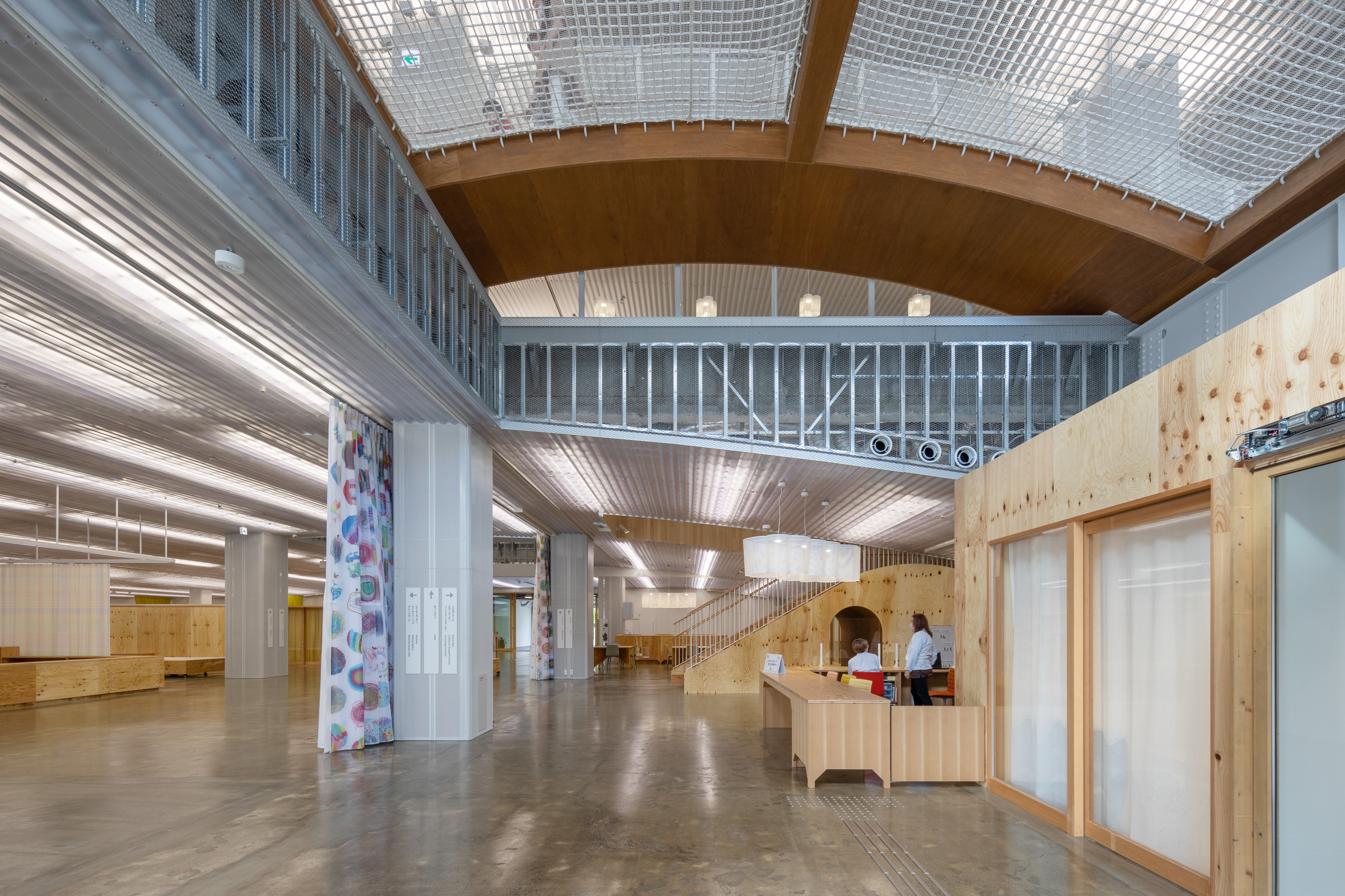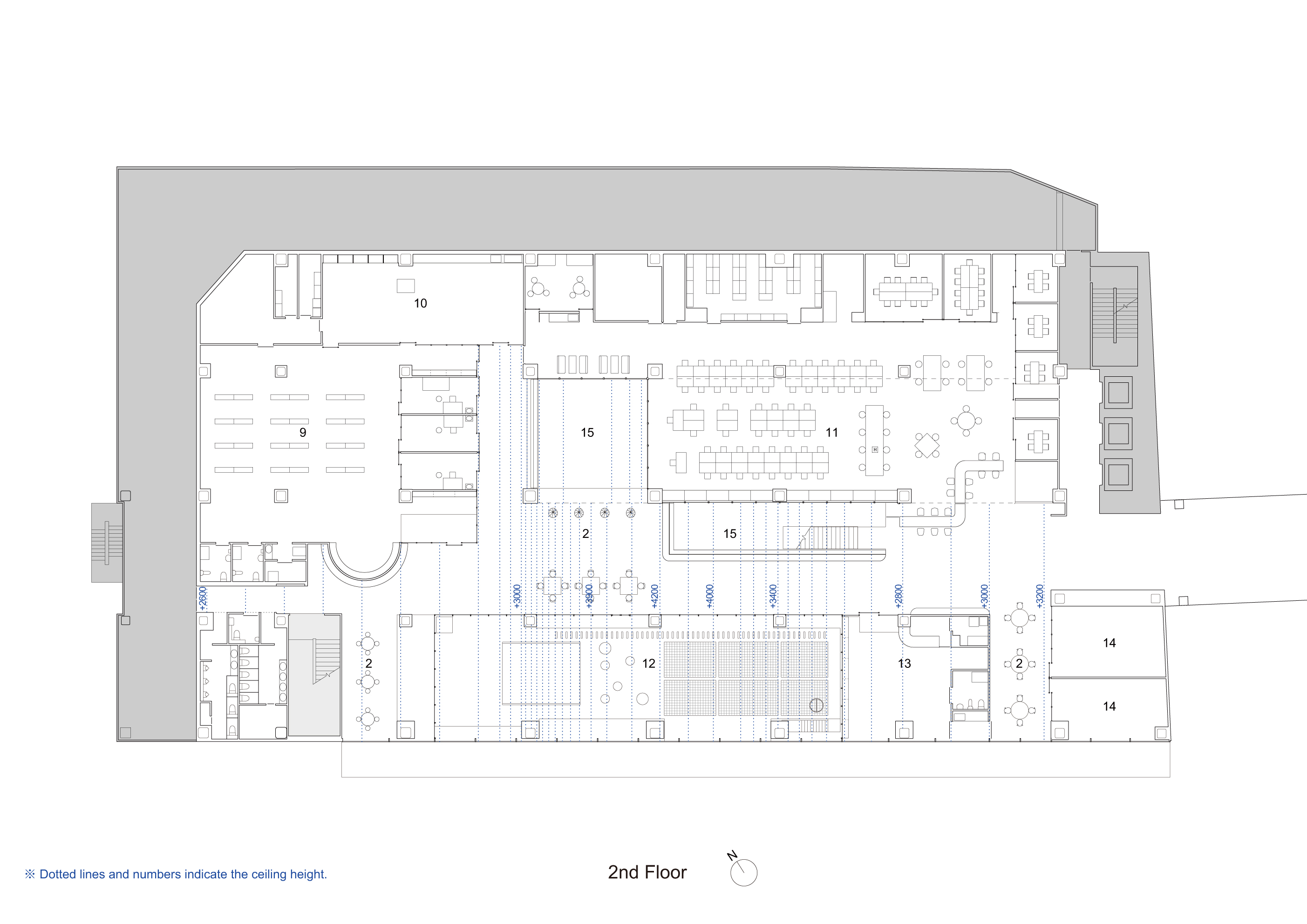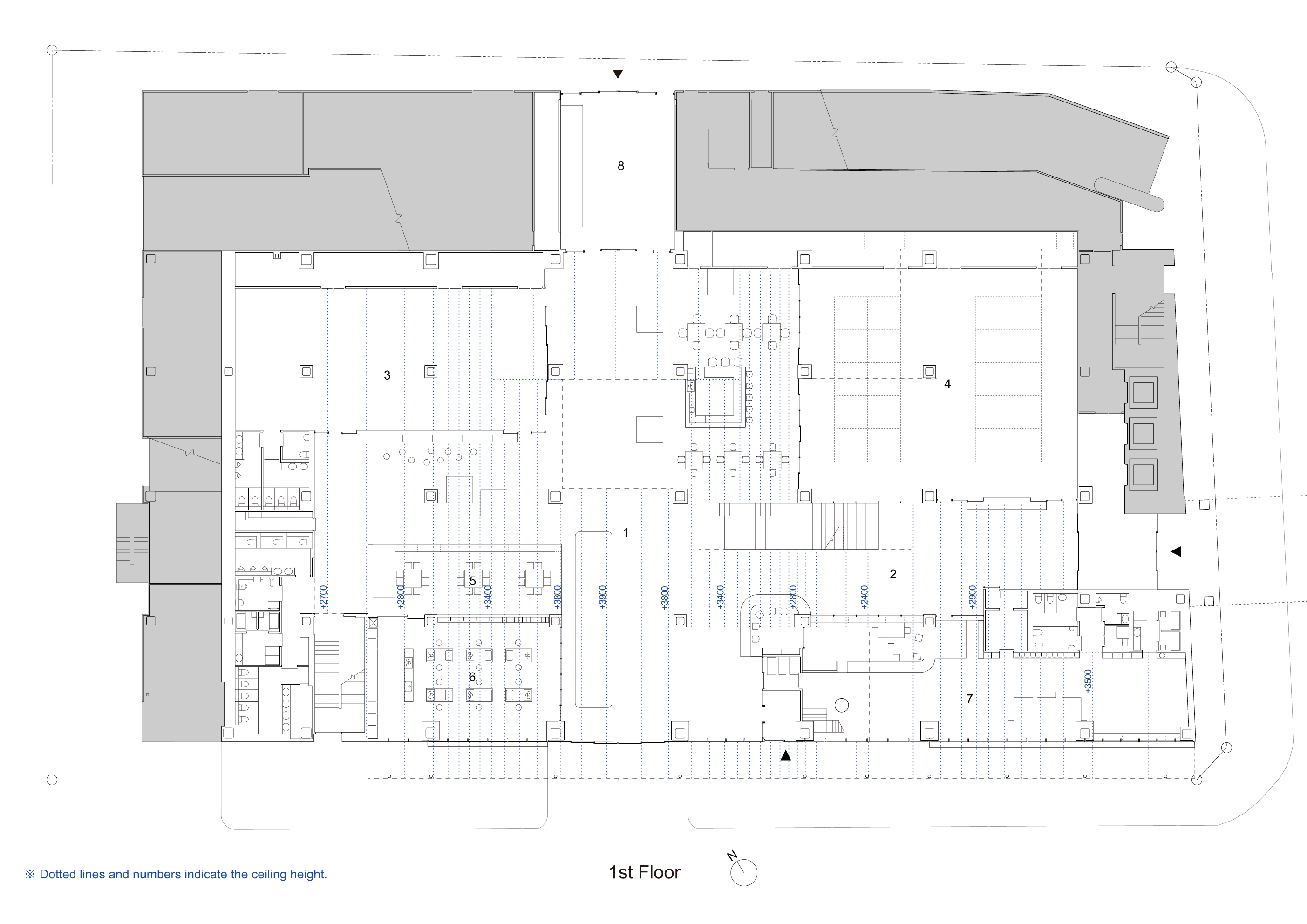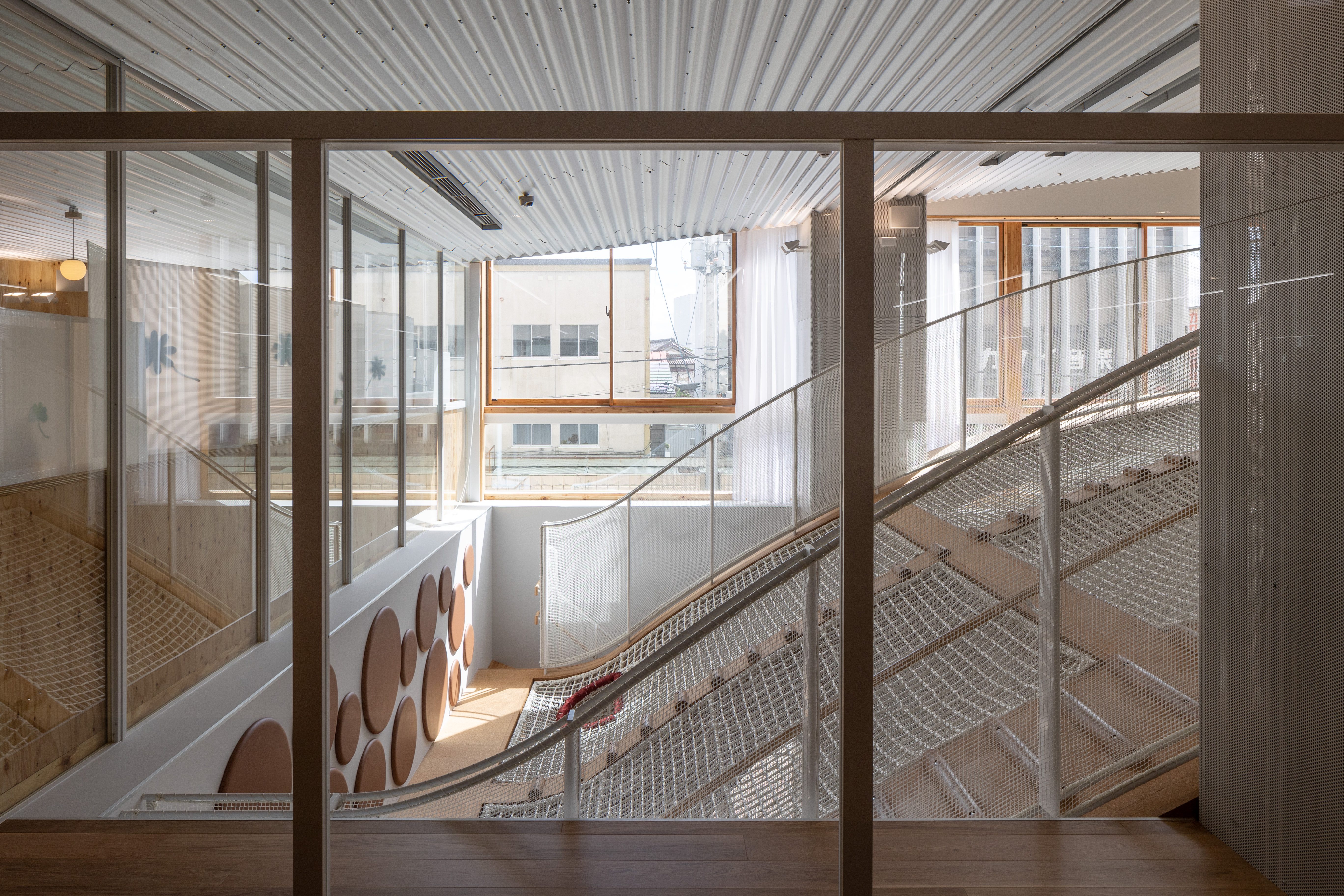 This project involves the conversion of the first and second floors of an eight-story commercial building located in the city center into a health and childcare support complex. In addition to providing functions including a hall for medical checkups, indoor playground, exhibition/lecture hall, consulting room, rental room, and office, we also aimed to create open spaces where people can freely visit and spend time not only for these purposes. The existing building consisted of simple rectangular grids with a floor area of about 2000㎡. There were hardly any openings in the exterior walls, so the interior of the building could not be seen from outside. For this reason, we decided to create an indoor plaza occupying two structural spans in depth by four structural spans in width in the center of the first floor and connect it to the city at large. It is a high-ceiling space partially with an atrium, equipped with a cafe and consultation counter and serving as an entrance and waiting area to the surrounding rooms with various functions. In addition, it is designed as a multi-purpose plaza that can accommodate mobile medical and catering vehicles, and host events. The entire floor, with the indoor plaza at the center, is covered by a gently undulating luminous ceiling. The ceiling, with a height difference of about 1.5m from 3.9m to 2.4m, is designed to ensure minimum head clearance for vehicles while leaving adequate duct space above the ceiling. Shadows and undulations created by the luminous ceiling give a sense of depth to the space. Under the undulating luminous ceiling, we have provided a variety of seating areas, both “with-shoes” and “shoe-free,” with varying textures and sitting height with the hope that this accumulation of everyday places would create a new landscape. The ceiling straddles the upper and lower floors, becomes a floor for the play equipment, and appears as eaves on the facade, so that it interacts with the existing shopping arcade and allows people’s activities inside to be seen from the street. In this project, we drastically changed the role of the building from a facility serving specific purposes to an architecture creating a new landscape where people from all walks of life gather by deconstructing a mundane grid-based commercial building using a gently undulating ceiling and floors.
