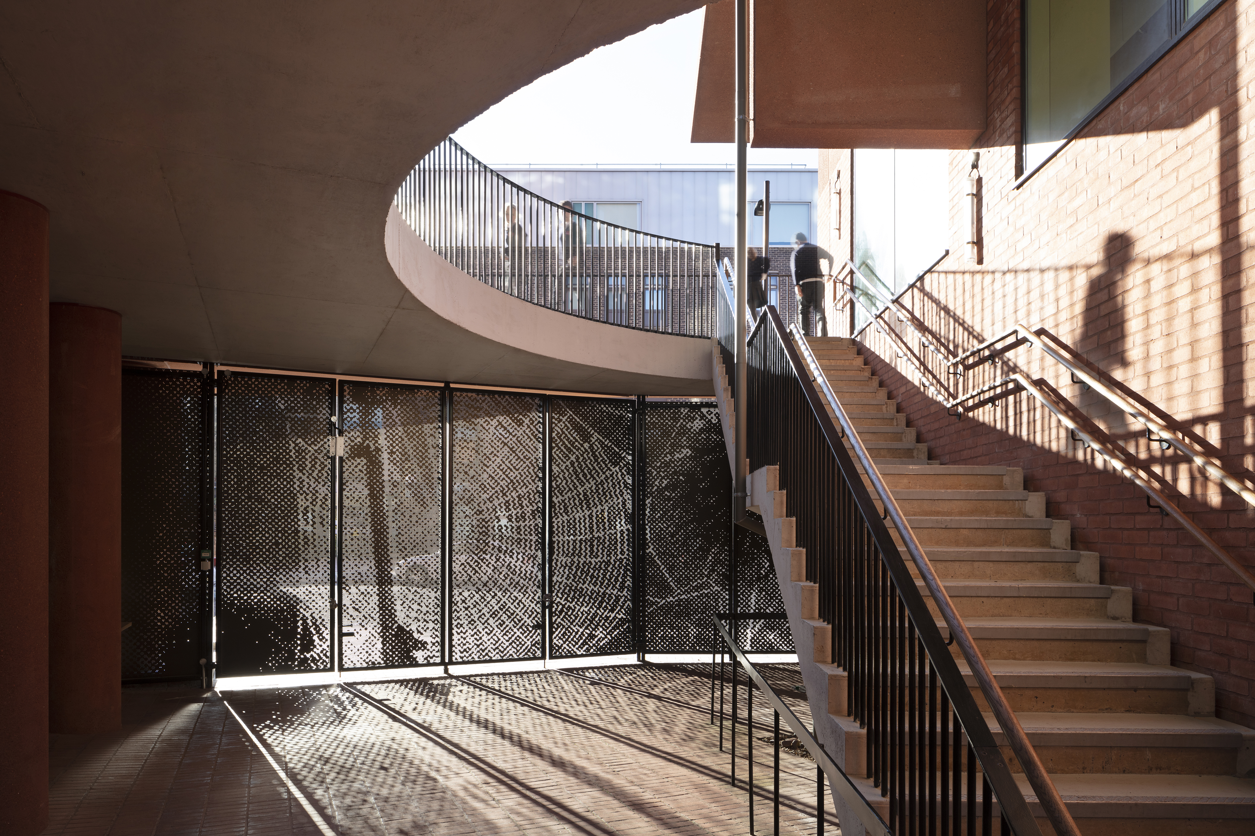 Generous mezzanines, roof terraces, play spaces and gardens occur on all levels of the school promoting outdoor teaching, conversations, and exercise throughout the school day. In addition to other semi-covered spaces and deep classroom window recesses, these bring the school’s walls to life, allowing pupils to inhabit them as a liminal threshold between formal and informal worlds or indoor and outdoor spaces. The entrance to the school creates the break between the residential tower and the school, an inviting point of arrival with its wildlife-inspired gates designed in collaboration with the artist Paul Morrison.