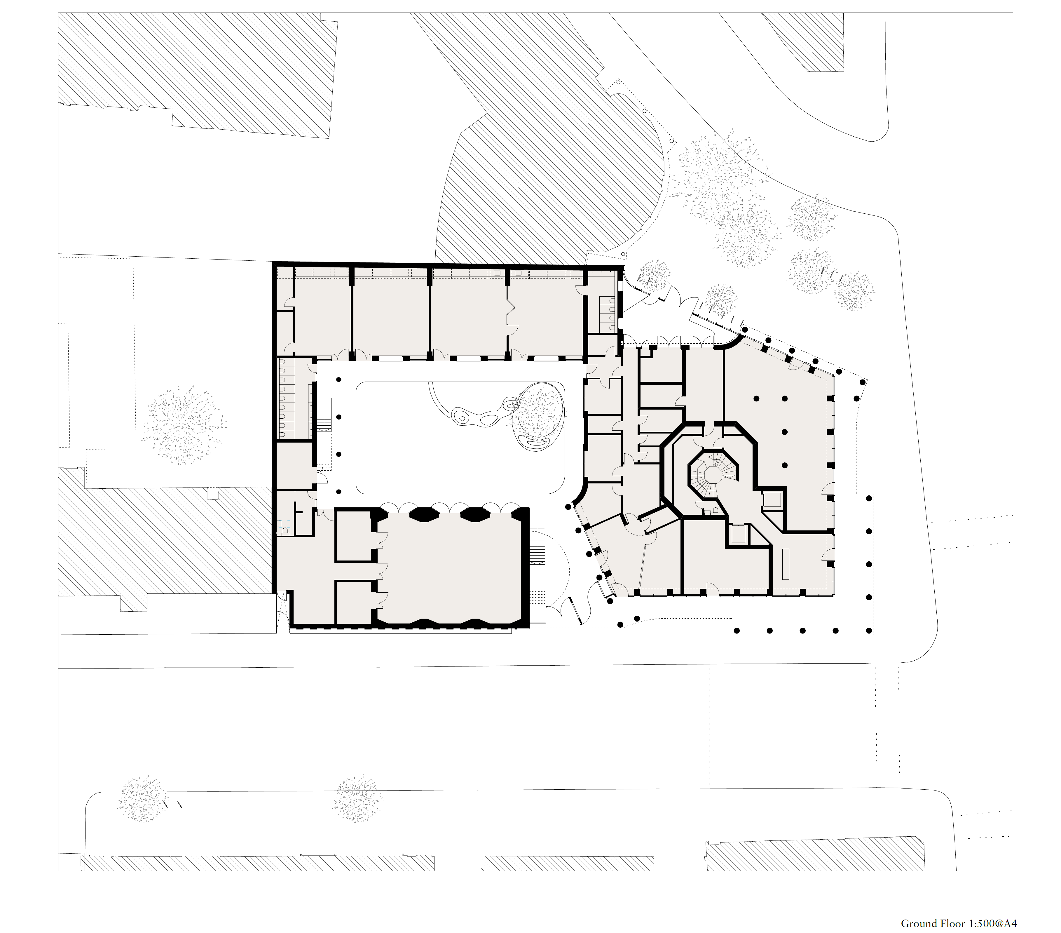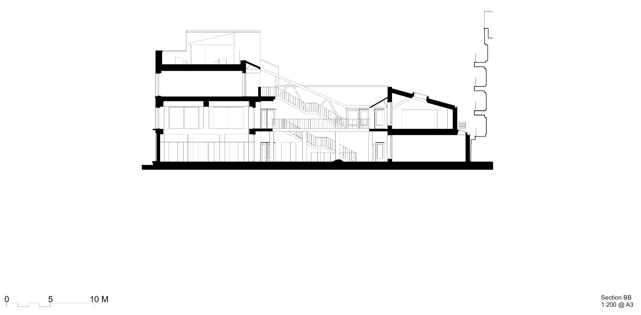 There is a strong interplay between the façade and the city making its wall a threshold between the building and the city. The apartment building thus gains a civic presence that transcends its immediate function. This also true of the School where its street-facing elevation is constructed with a long plinth used by the general public as a bench, so further adding to the architecture’s liminal quality and its role as a piece of social infrastructure within the community.