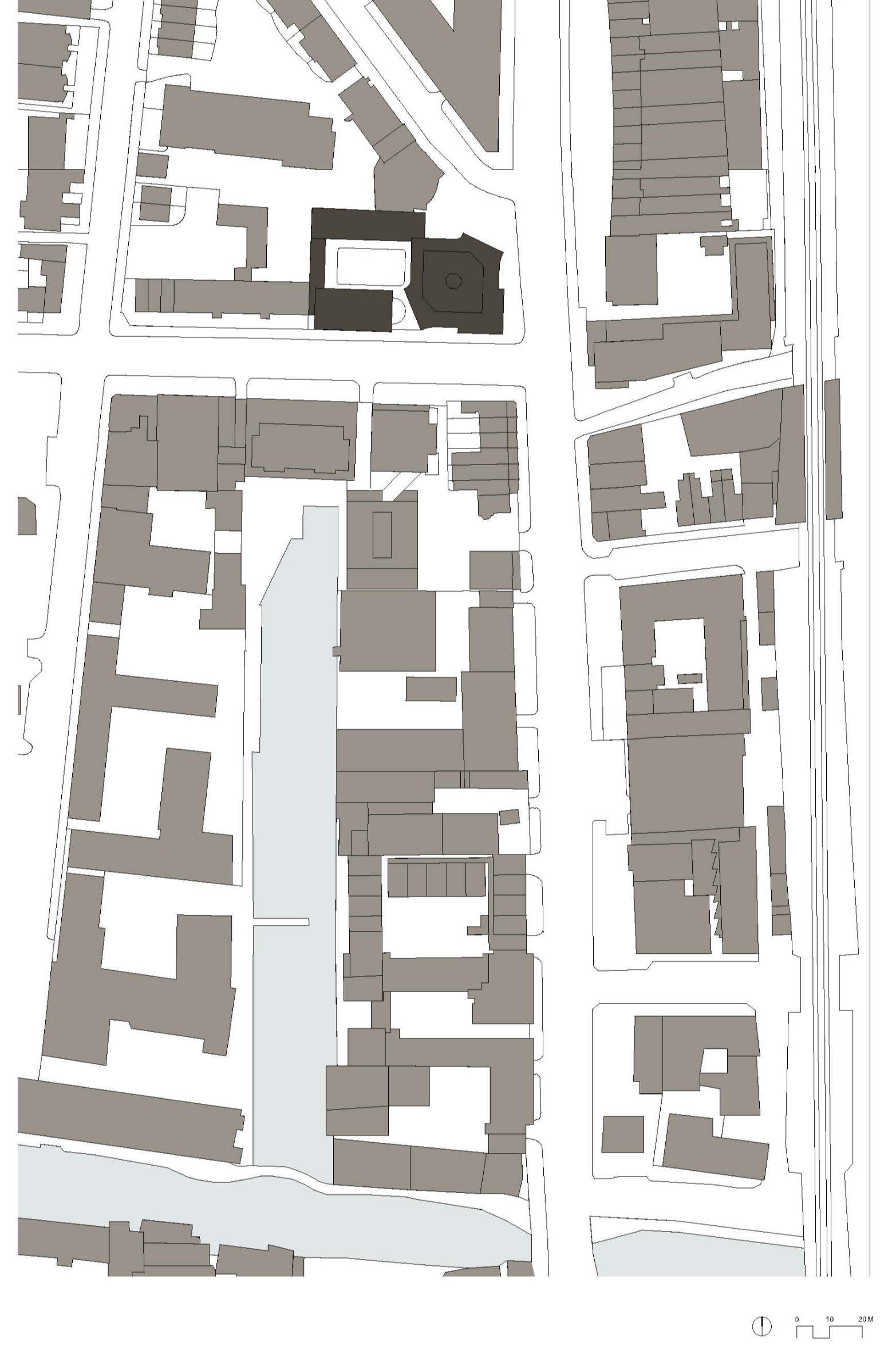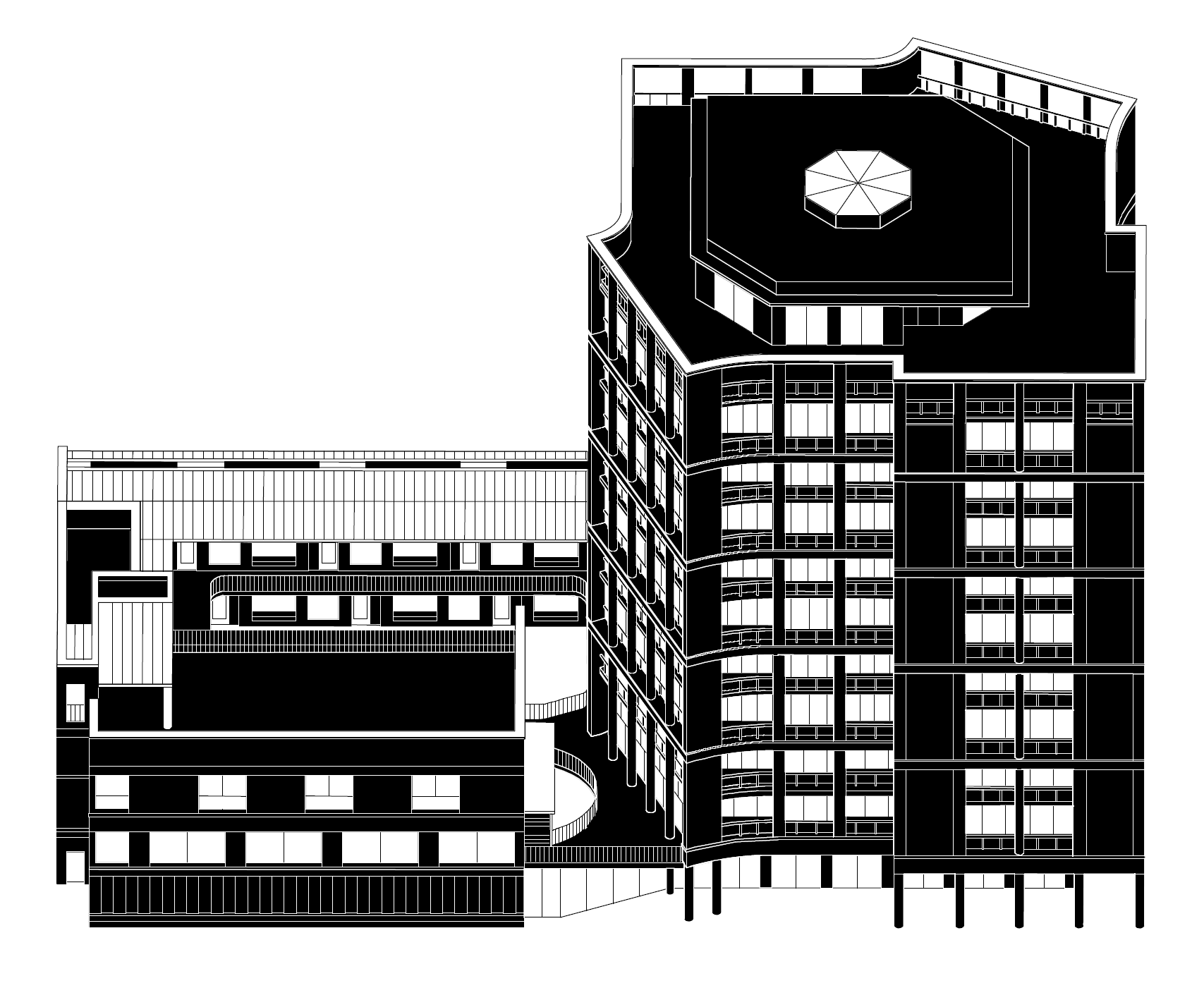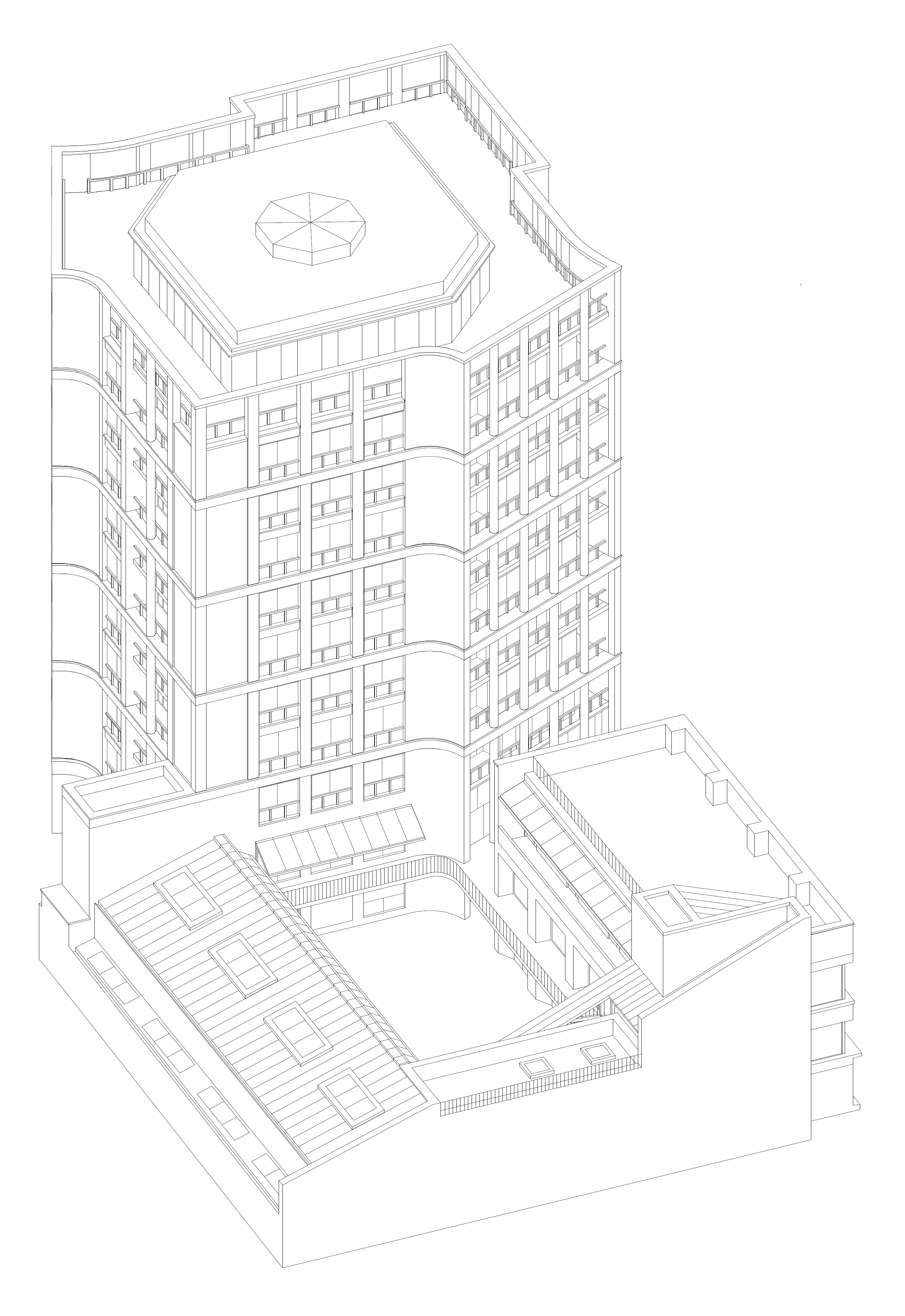 11층짜리 주거 동은 3층짜리 학교를 소음과 큰 도로에서 나오는 연기로 부터 막아준다. 그 집합적인 평면은 학교와 그 관대한 개방형 정원 놀이터를 위해 대지를 자유롭게 한다. 이 공간은 학생과 교직원들에게 대학 정신을 불러일으키는 중요한 초점이다. 그것은 또한 학교에 자연광을 가져다 준다.