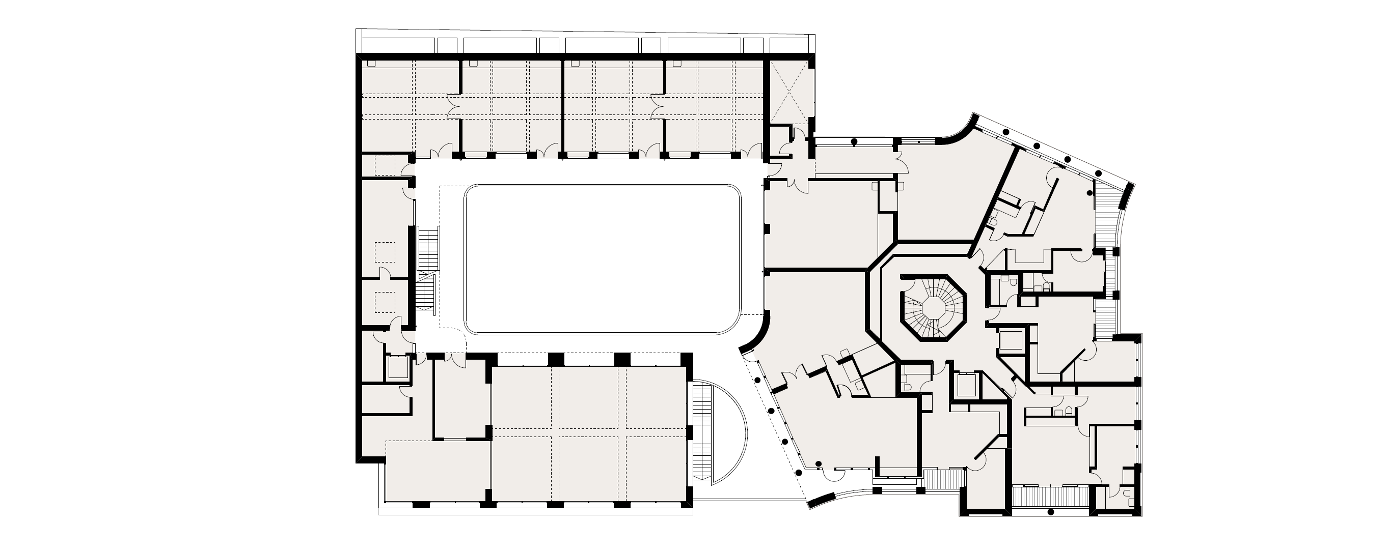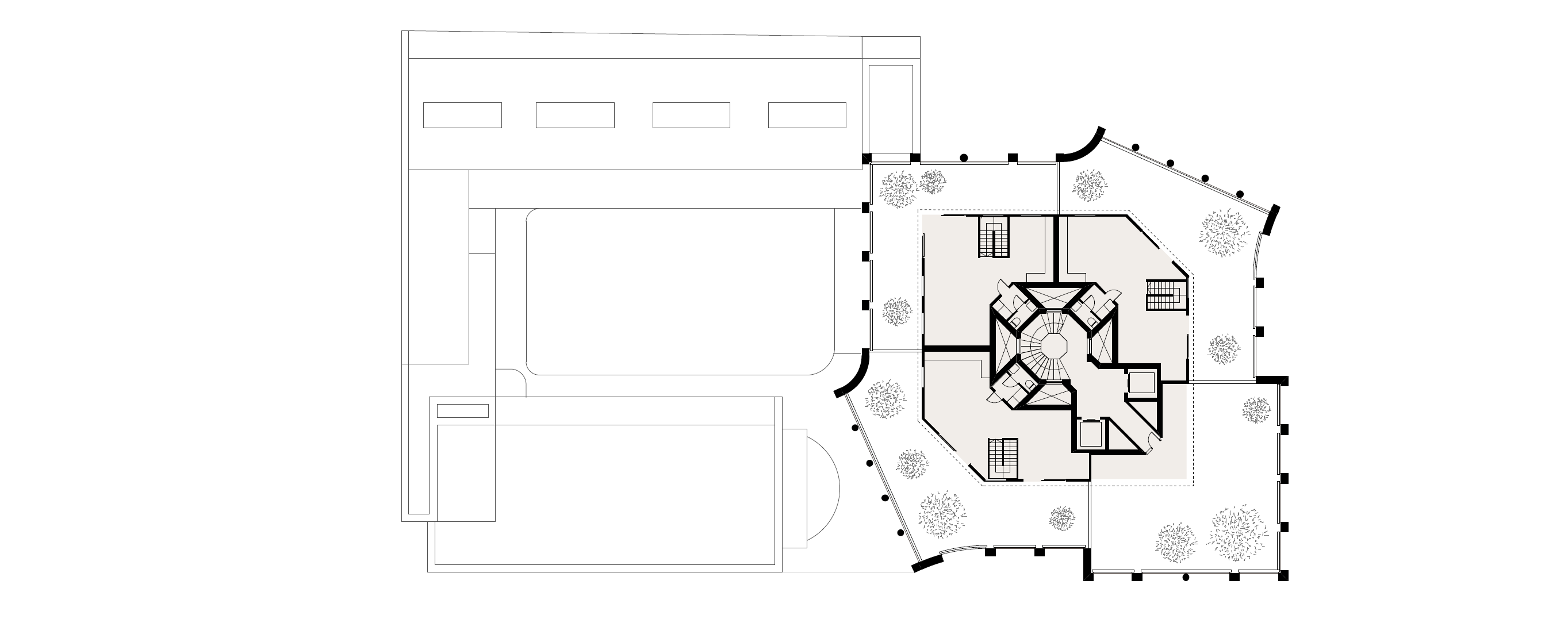 층은 벽돌로 된 덩어리로부터 도려 내진 로지아(loggia)와 쌍을 이룬다. 건물의 둘레에 걸쳐 확장되는 이중 높이 순서가 있는 로지아(loggia)를 사용하여 고도를 더욱 생기 있게 한다.