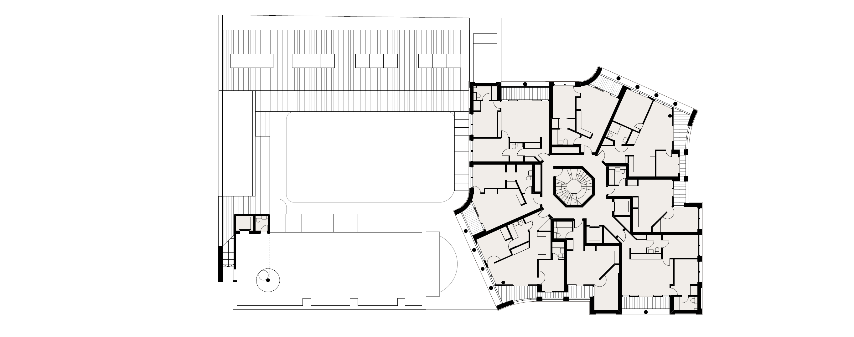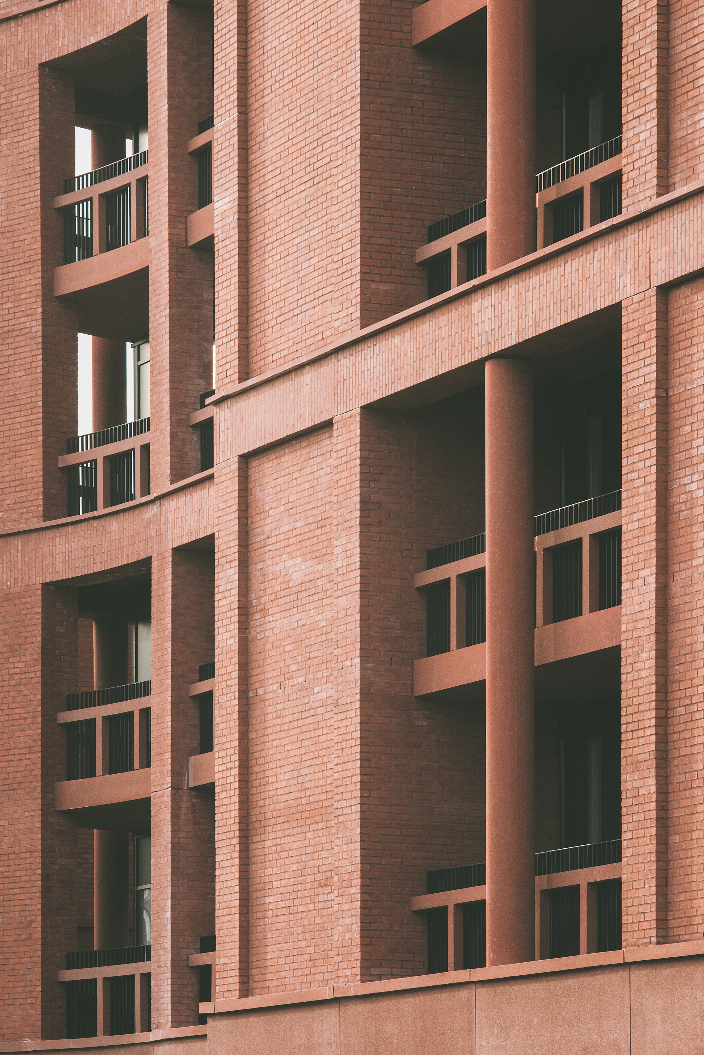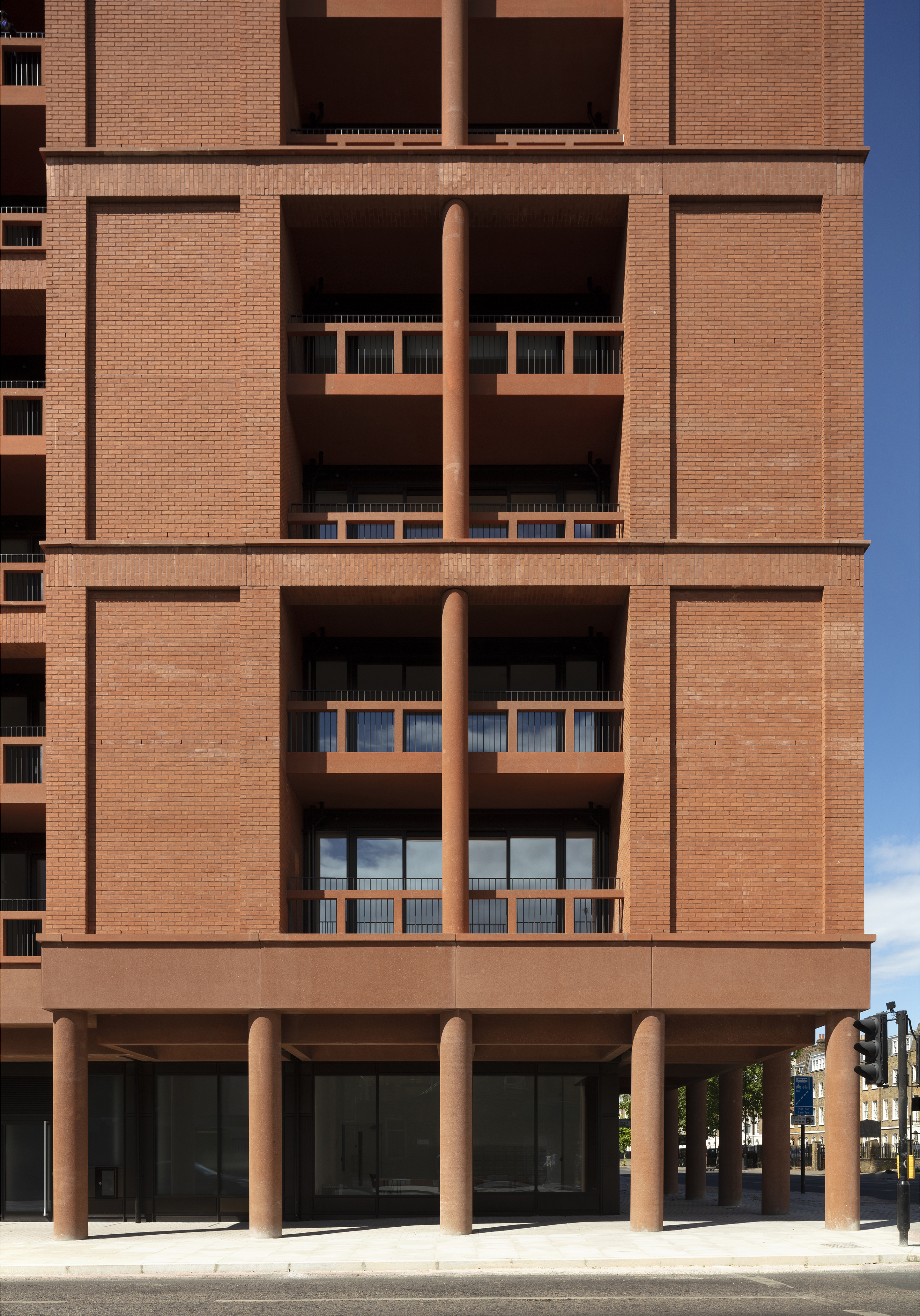The block has 68 apartments that share an orthogonal reinforced concrete central core. At the top of the tower is an open colonnade. The plan of the building is molded – “pinched” and “twisted” - creating a solid convex curve as it turns a corner. This is critical in terms of how the architecture plays with its context, introducing movement and depth. The storeys are paired, with loggias carved out of the mass of brickwork with a double-height order extending around the perimeter of the building, further animating the elevations.