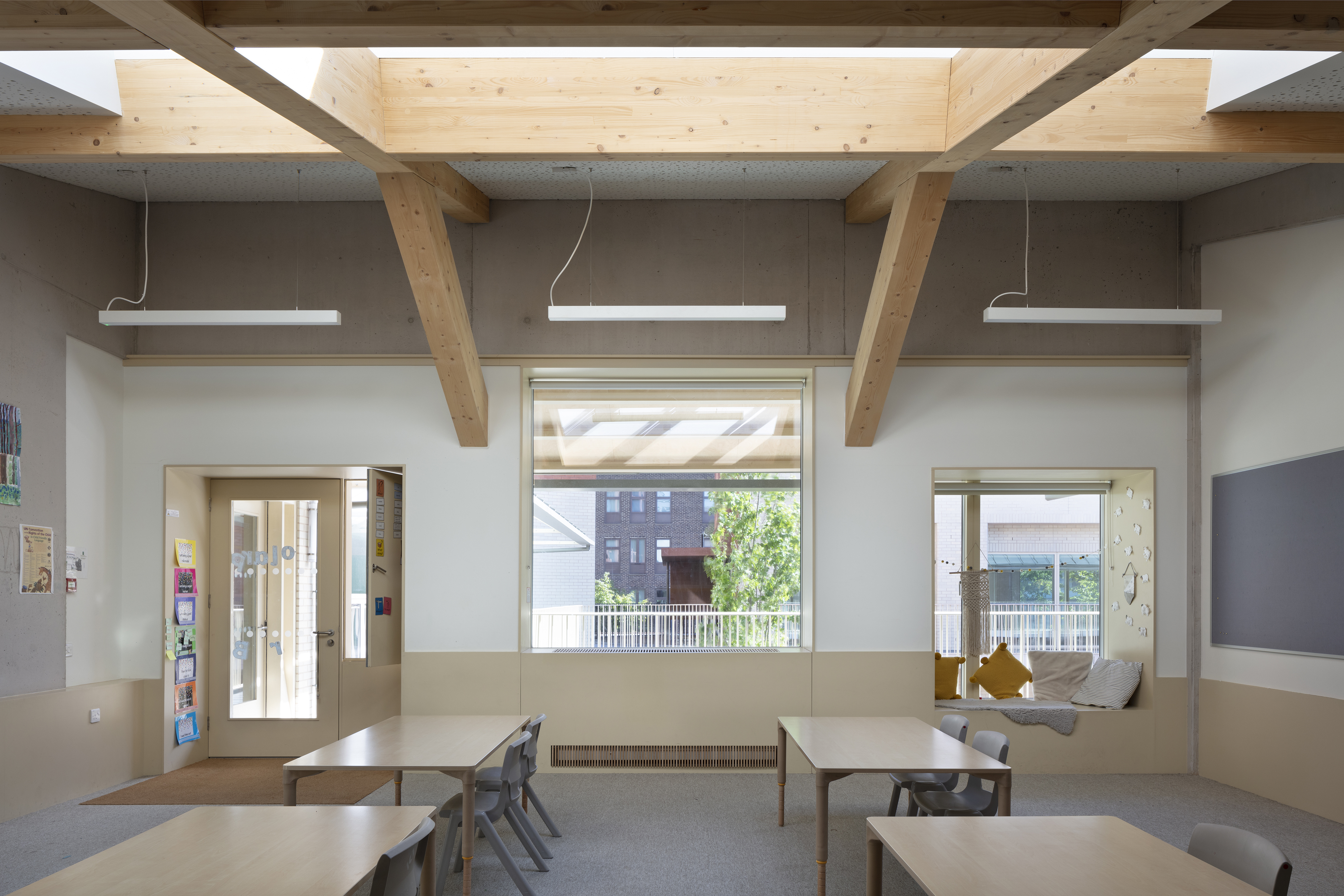 Generous mezzanines, roof terraces, play spaces and gardens occur on all levels of the school promoting outdoor teaching, conversations, and exercise throughout the school day. In addition to other semi-covered spaces and deep classroom window recesses, these bring the school’s walls to life, allowing pupils to inhabit them as a liminal threshold between formal and informal worlds or indoor and outdoor spaces. The entrance to the school creates the break between the residential tower and the school, an inviting point of arrival with its wildlife-inspired gates designed in collaboration with the artist Paul Morrison.