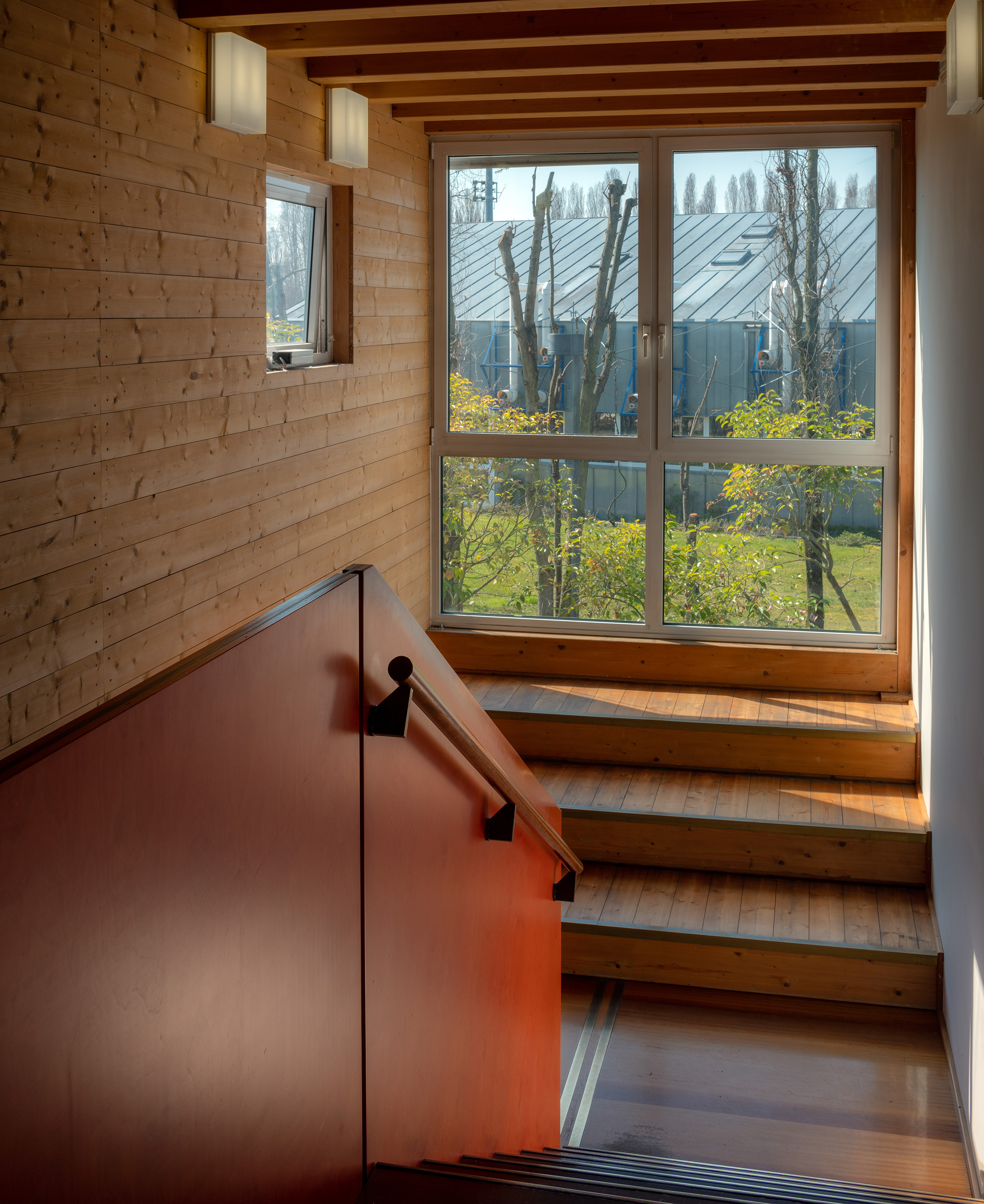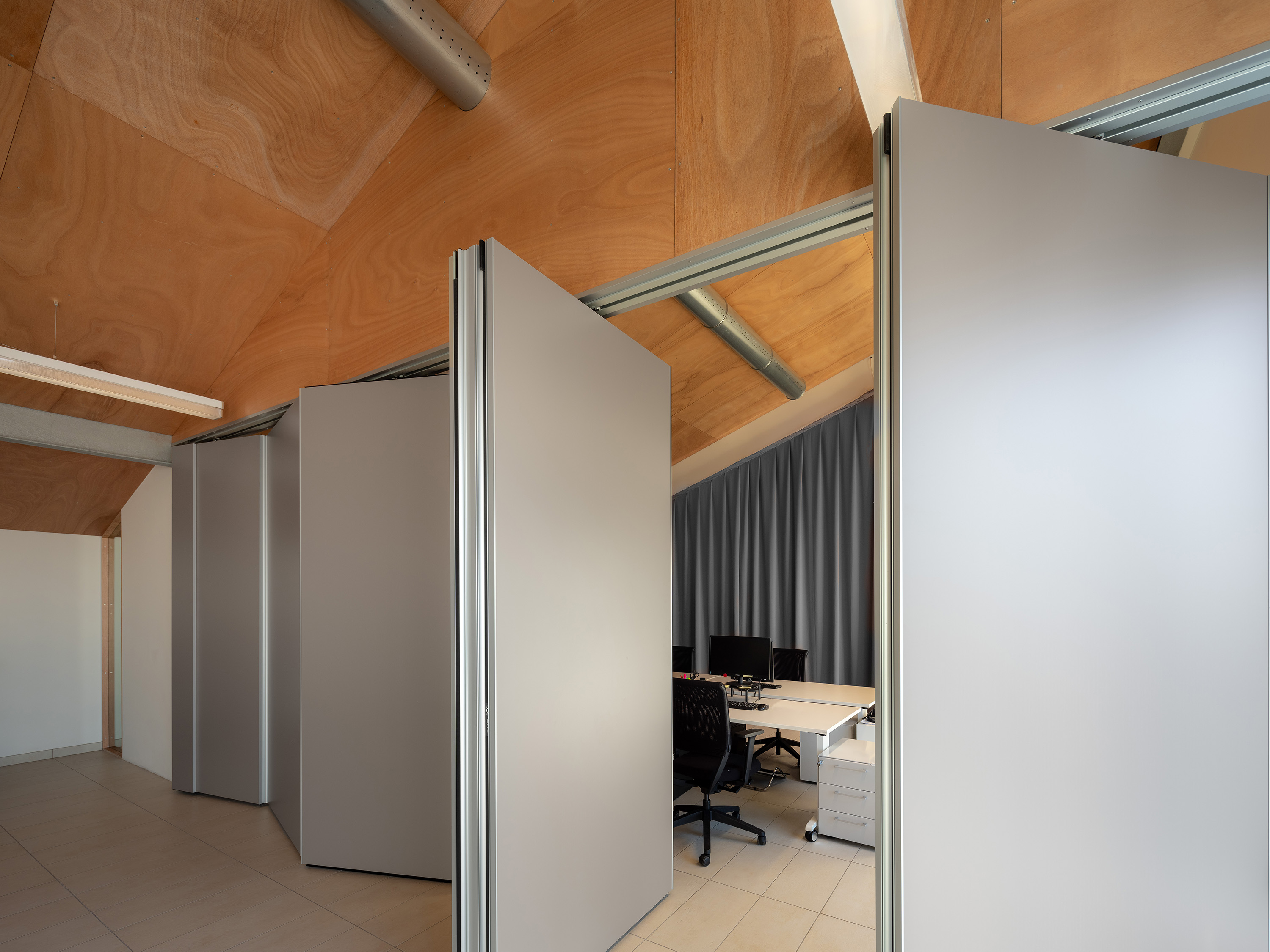 건설 방식은 콘크리트나 강철, 목재 패널과 금속 절연 패널로 미리 조립된 구조인 건식이다. 외부 표면은 이중 압착 작업된 티타늄 아연 강판으로 특징 된다. 이 자재의 선택은 일반적인 미적 균형 및 볼륨 채광의 맥락적 효과를 얻기 위함이다. 철재의 변화하는 영혼은 빛과 기후의 다양한 상황들에 잘 적응할 것이며, 그것은 산업 중심지에 베네토 시골에 설계된 자연 초목을 잘 포함시킨다.