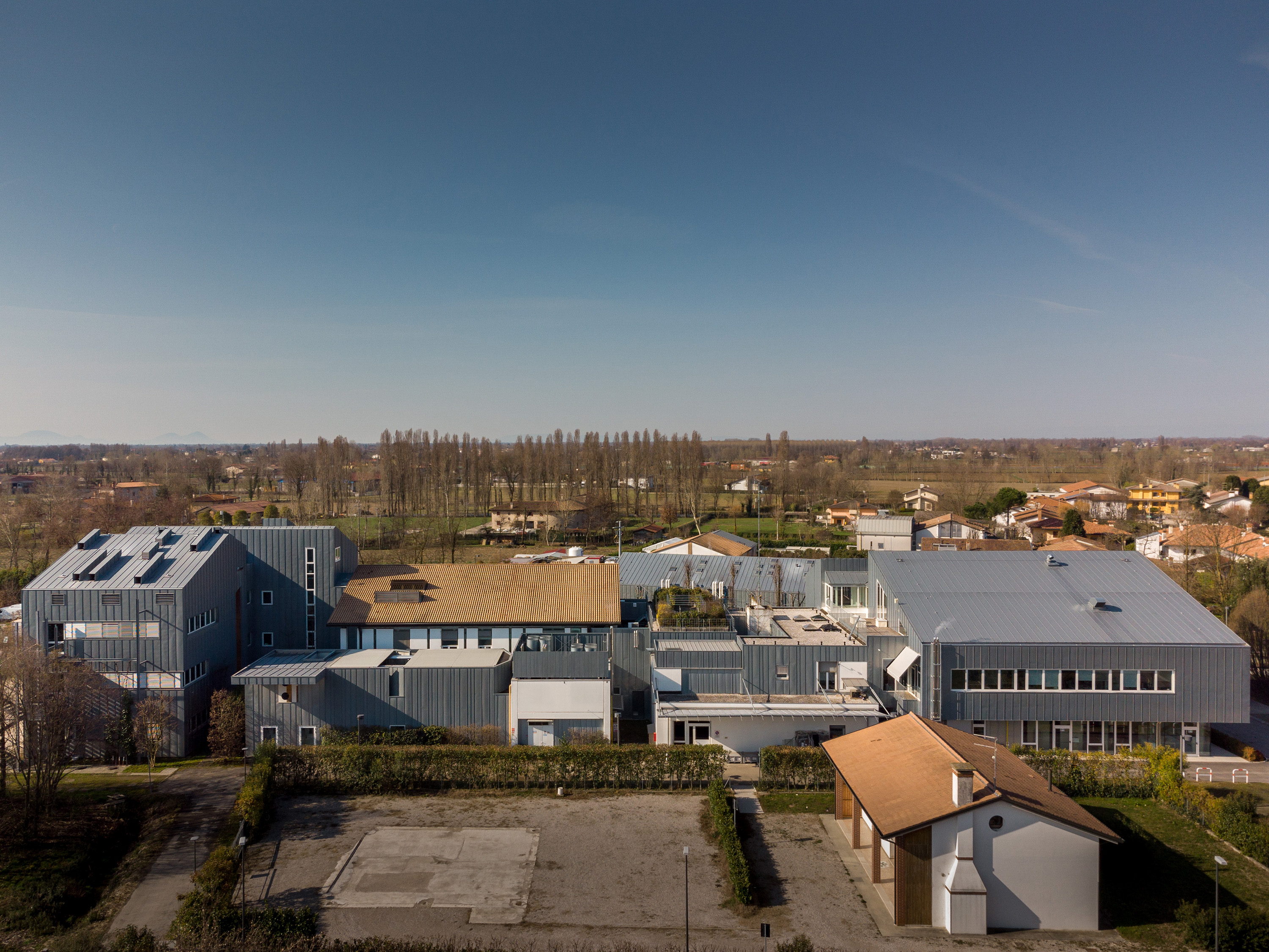 The costructive way is the dry method, that is prefabricated structures in concrete or steel and with wood panelings and metal insulated panels. The external surfaces are characterized by the titanium zinc sheet, worked with the double crimping. The choice of this material is to obtain a general aesthetic balance and a contextual effect of lightening of the volums. The changing soul of the metal is going to adapt very well to the different situation of light and climate, it gives to the industrial center the good inclusion with the natural green designed inside the Veneto countryside.