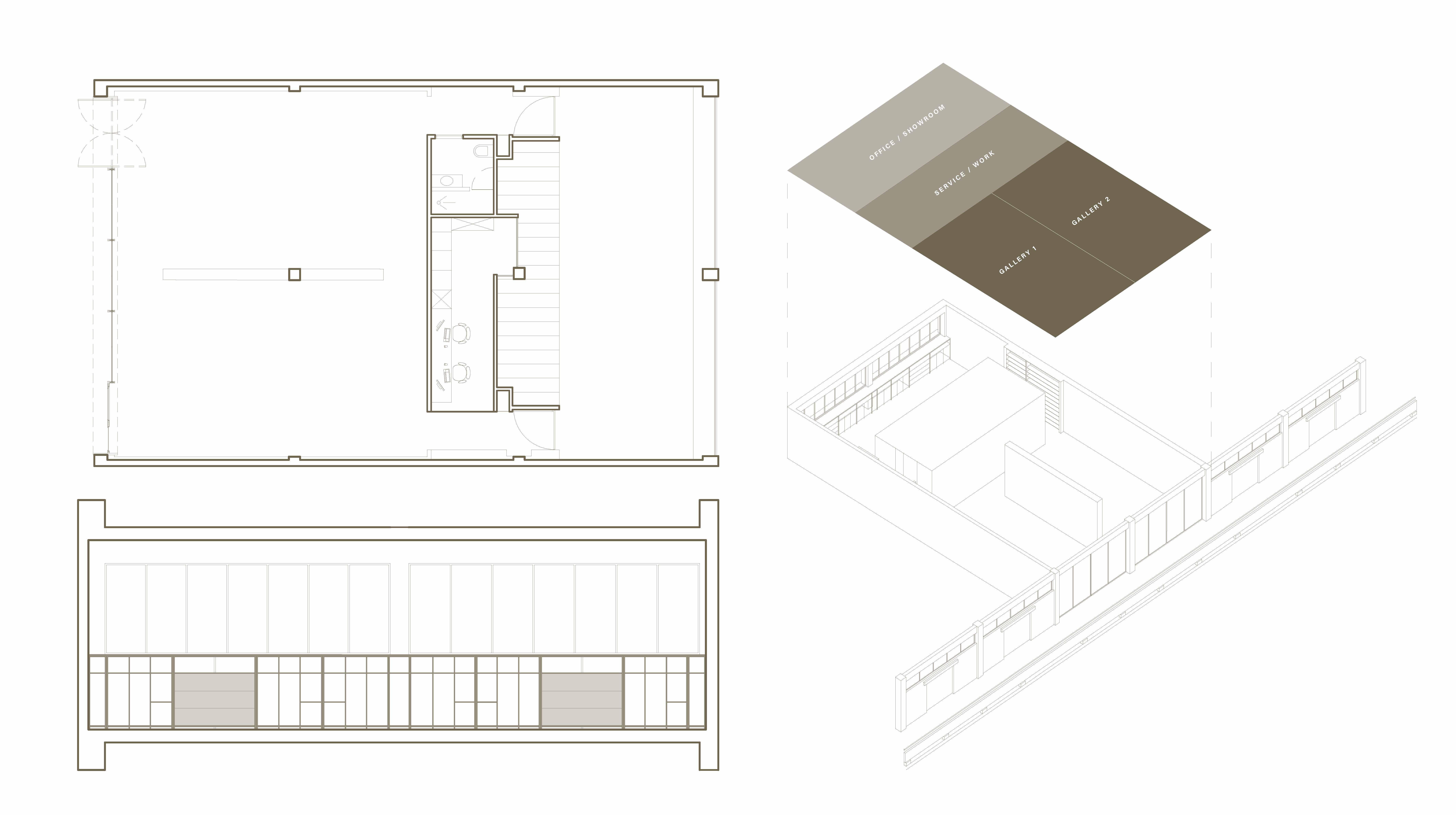 gallery is inviting. It has no entrance lobby or threshold areas, and is an almost direct continuation of the open public corridor which leads toward it. The gallery is designed to allow circular movement, enabling continuous discovery of its various spaces from new angles.