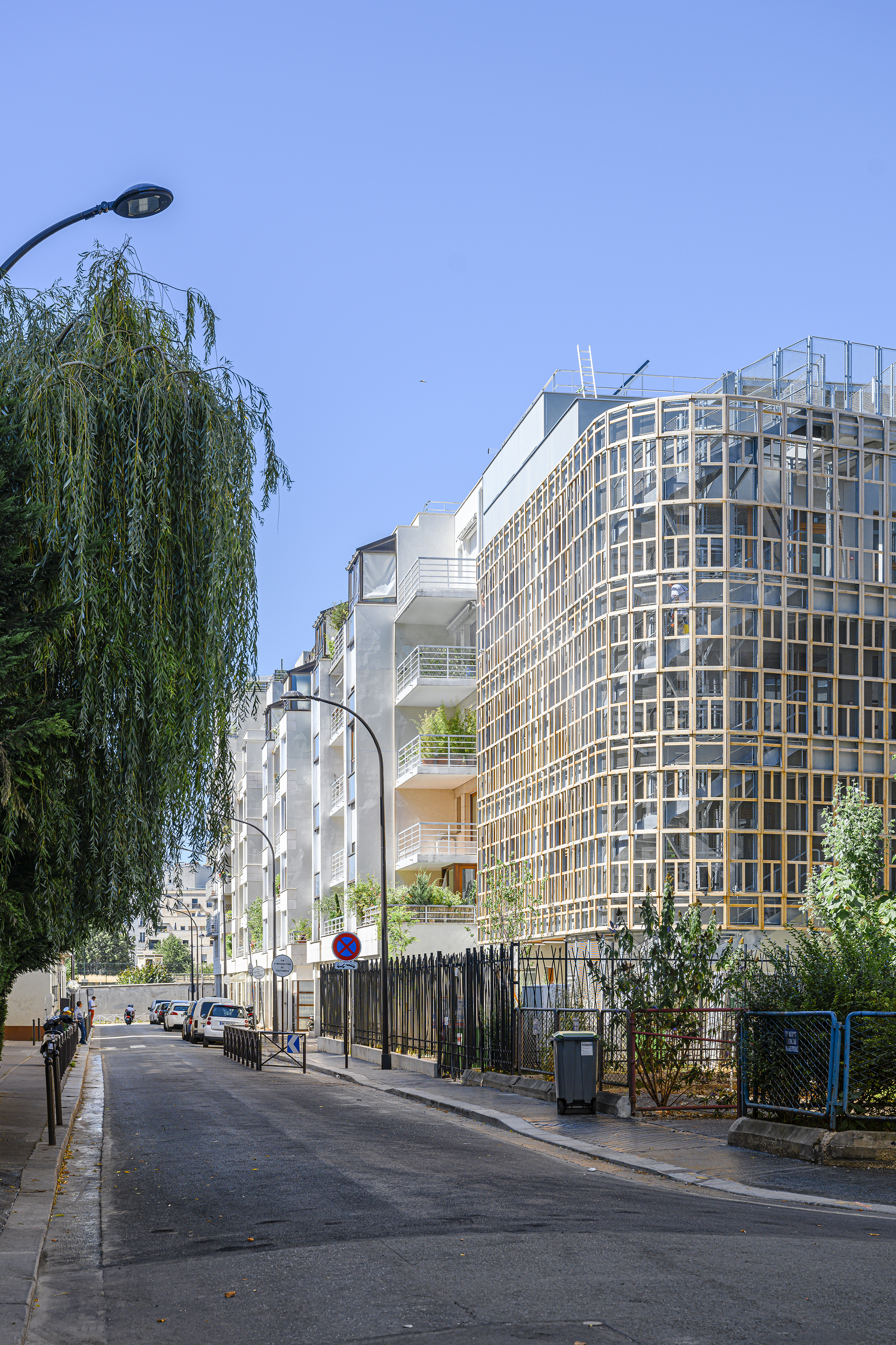 Circular economy. Making more with less. More environmental performance, a smarter use of the floor, a better management of investment and maintenance costs, and a strong will to embody the City of Paris innovative and proactive commitment towards reusing materials and building with a concern for landscape. Thus, the solid oak façade of the building is entirely built up from reused and transformed landing doors. This wooden second skin gives to the building a sense of cohesiveness, of air, light and porosity; openness and protection. The building physiognomy, façades and green rooftop generate a new landscape in which the building itself is more perceived as part of a garden than just adjoining the street.