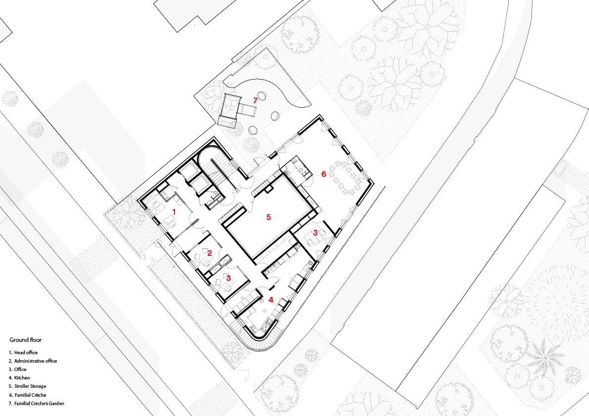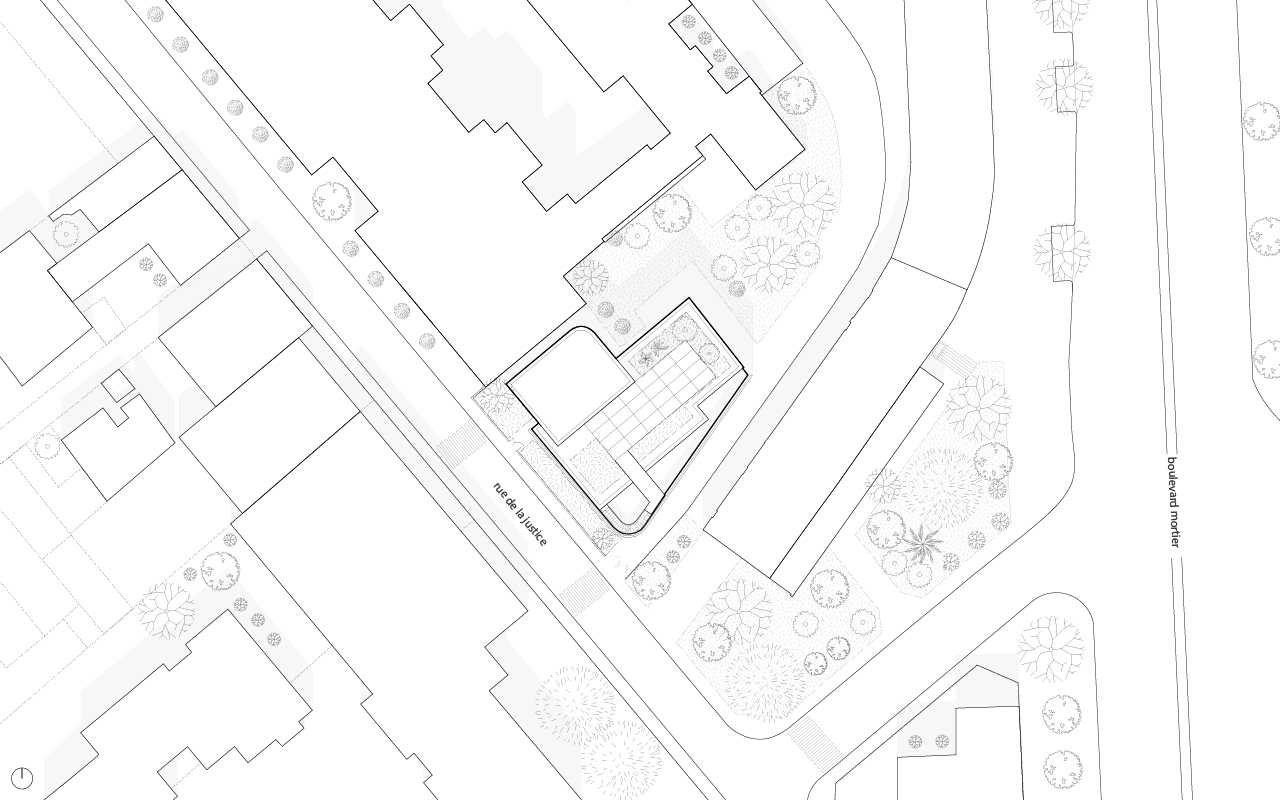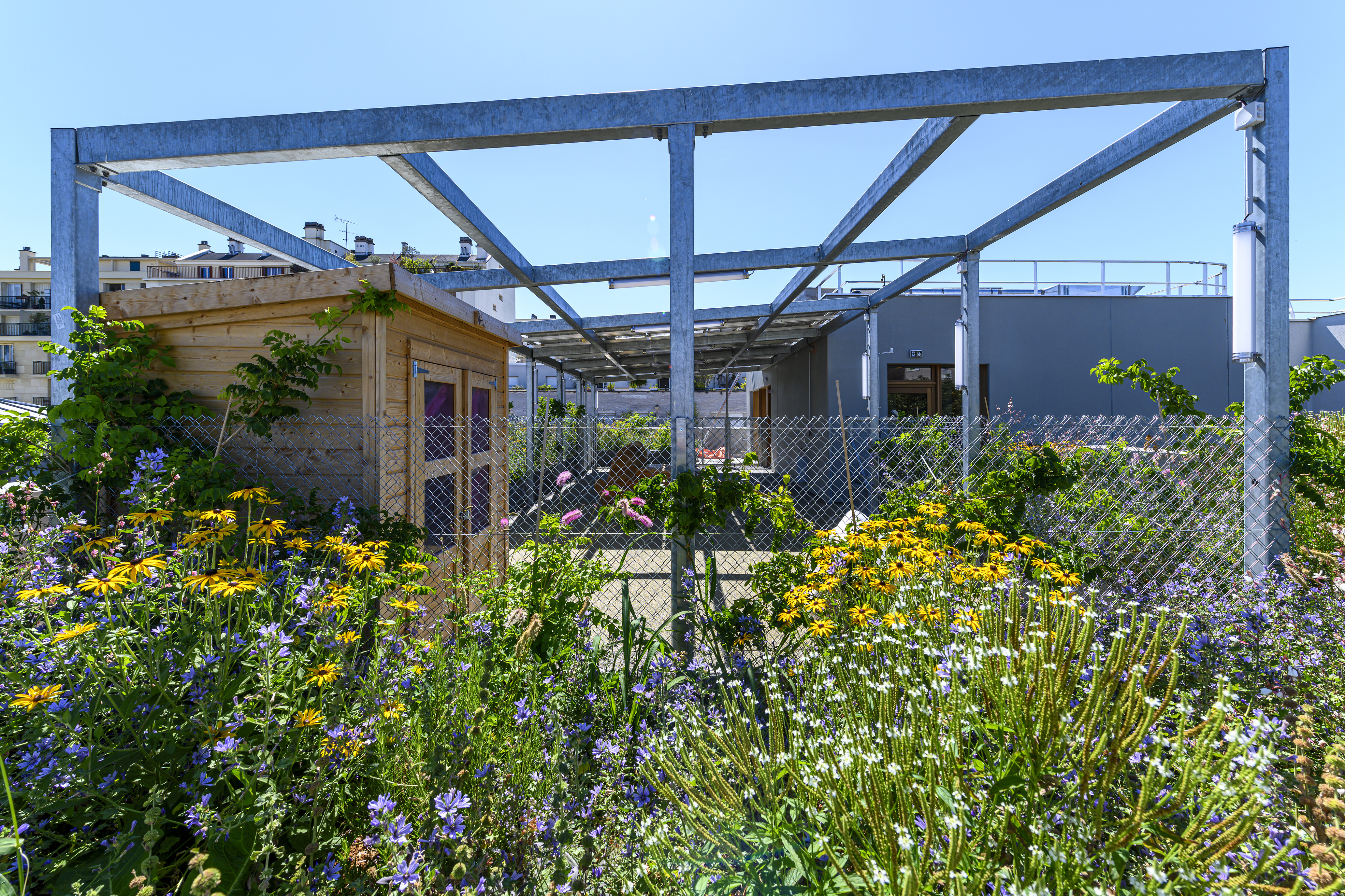 순환 경제. 적은 자원으로 더 많은 것을 만드는 것. 더 나은 환경 성능, 더 똑똑한 바닥 사용, 더 나은 투자 및 유지 관리 비용 관리, 그리고 자재를 재사용하고 조경에 대한 관심을 가지고 건물을 짓는 파리의 혁신적이고 능동적인 약속을 구현하려는 강한 의지. 그래서 건물의 견고한 오크 파사드는 재사용 및 변형된 승강장 도어로만 지어졌다. 목재로 된 이 두 번째 외피는 건물에 응집력, 공기, 빛, 다공성, 개방성과 보호의 느낌을 부여한다. 건물의 형상, 파사드 및 녹색 옥상은 건물 자체가 단순히 거리에 인접하는 것보다 정원의 일부로 인식되는 새로운 풍경을 생성한다.