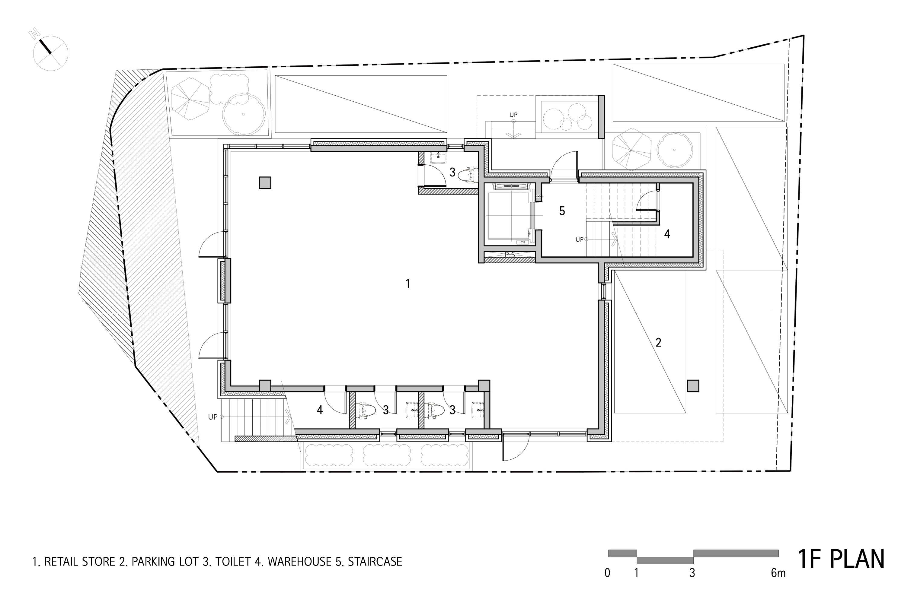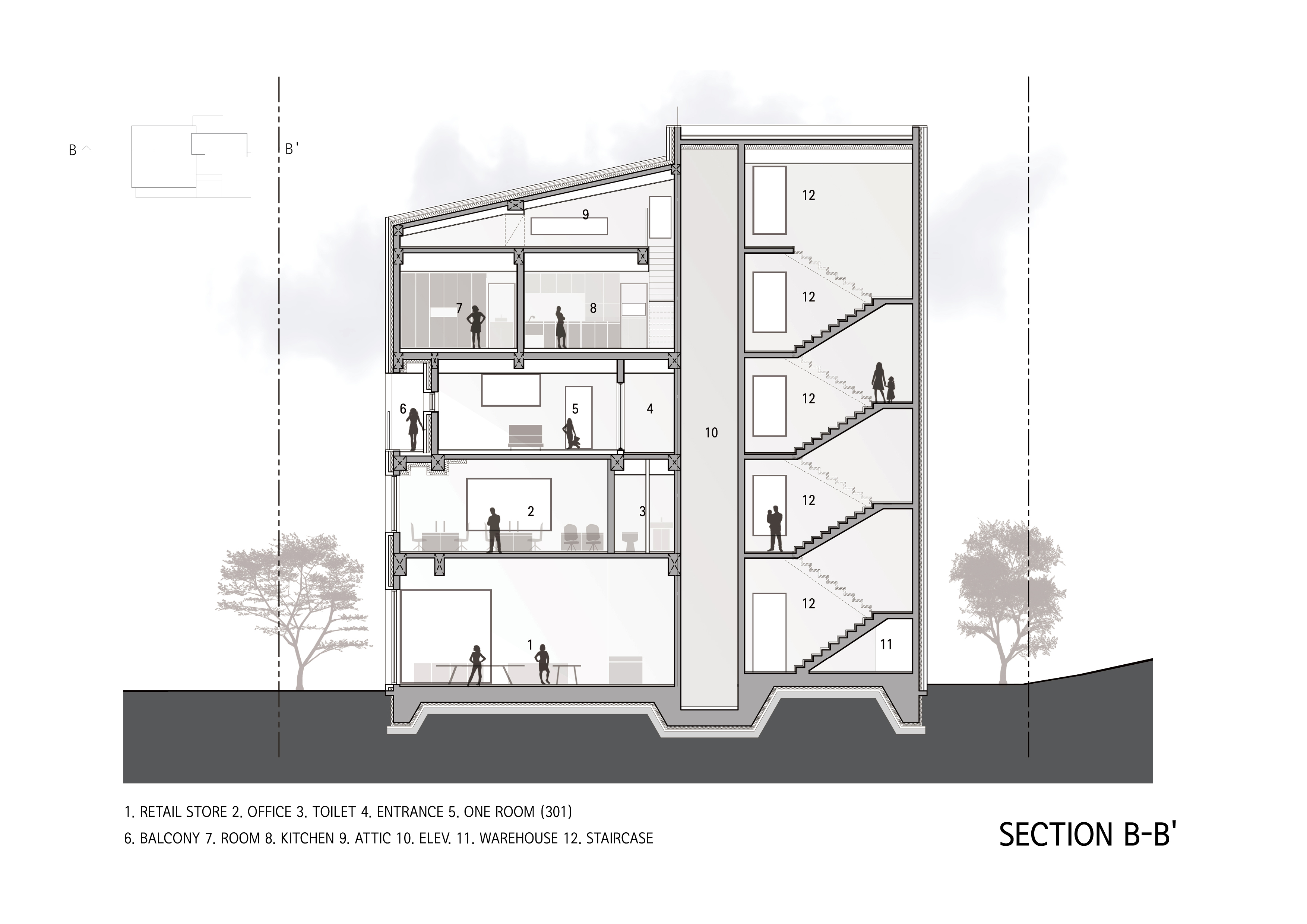 In the case of shopping district houses, there were many parts that needed to be considered in combination, such as recognition and accessibility, compared to a single purpose. In consideration of the privacy of home users, a space independent of the shopping district users should be formed, and in the case of shopping districts, it should be constructed to be conspicuous and easy for visitors to access. Basically, the building design was developed by avoiding interference between users through floor separation and height, and by separating access lines using the back road, the movement of shopping district users and home users does not overlap.