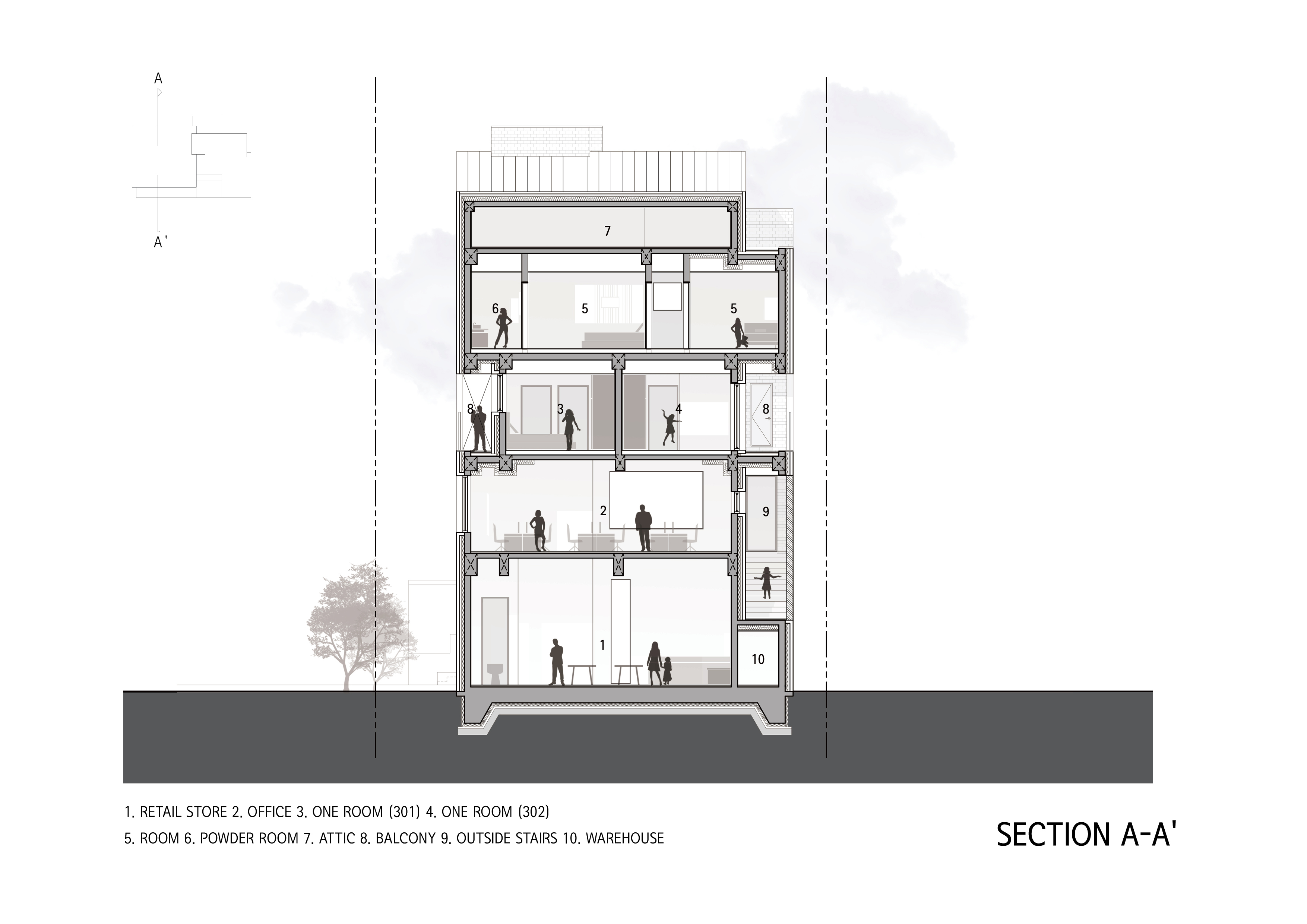 어렸을 적부터 살던 마당이 있는 단독주택 땅에 부모님과 건축주 부부가 함께 살며, 임대수익을 얻을 수 있는 상가주택을 짓기 원하는 건축주를 만나 본 설계가 시작되었다. 살고 있던 주택은 노후화되어 생활이 불편했으나, 건축주는 다른 곳으로 이사를 하는 것보다 오랜 추억이 있는 이곳에서 이웃들과 계속해서 관계를 맺으며 함께 살고 싶다는 마음을 가지고 있었다. 건축주의 요구사항이 몇 가지 있었는데, 첫 번째는 상가주택이지만 단독주택처럼 느낄 수 있어야 했고, 두 번째는 임대시설의 공실을 최소화할 수 있길 바랐다. 또한, 상가는 가변적인 임대공간 구성이 가능해야 했으며, 원룸 세대는 현재 트렌드에 맞춰 실을 구성해야 했다.