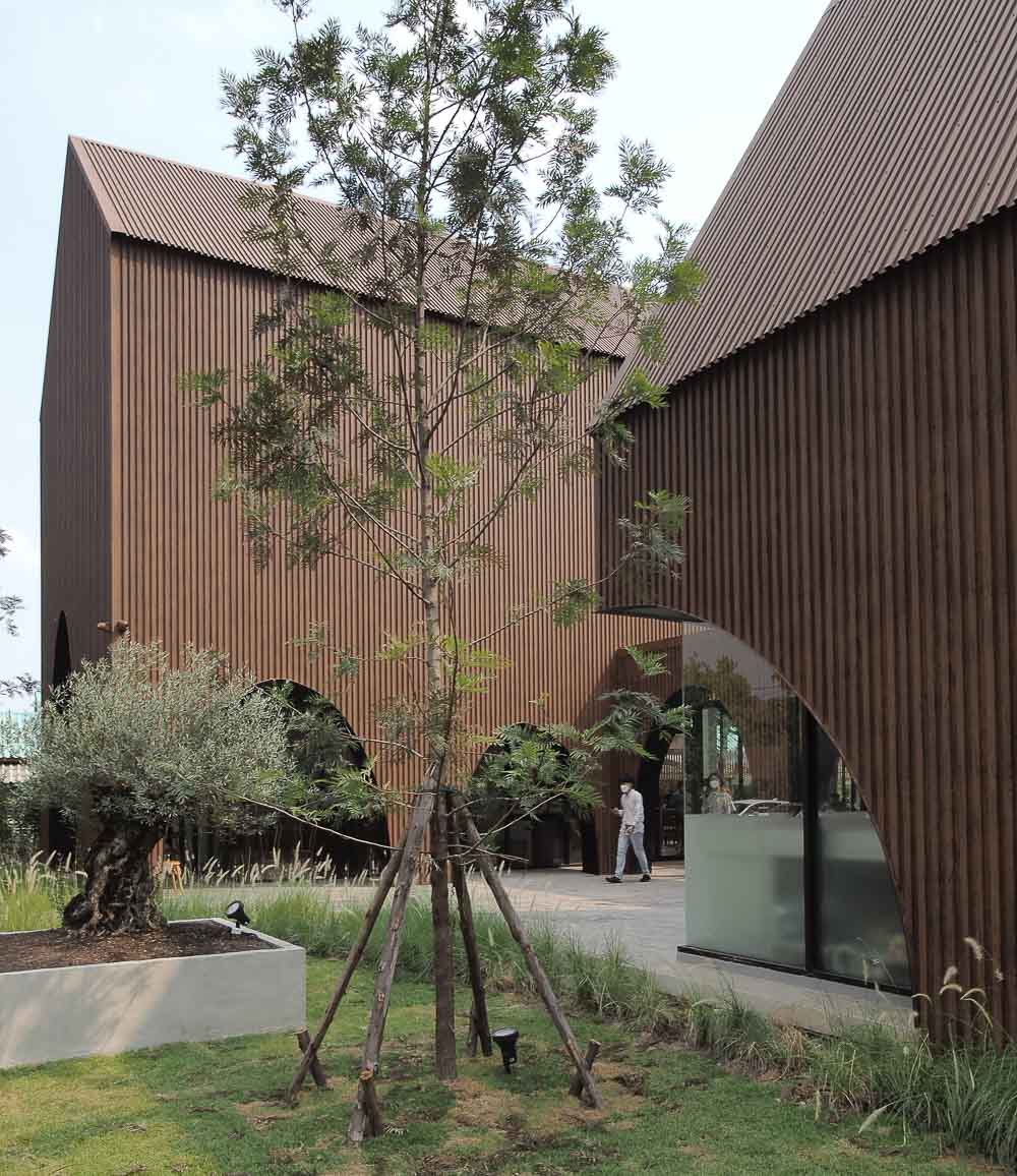 The site located in Bangkok’s western suburb, approximately 4,600㎡, is surrounded by a high-density residential zone. The restaurant aims to connect people with nature by creating modern barns in the forest following the first concept by Tastespace, our collaboration team and interior designer of this project. After design development, The cafe has a cluster of three main volumes with almost 500m2 of the total built area., all with the gable roof: a cafe, restaurant, and kitchen, along with the highest volume of 8-meter height for a bell tower and two small glasshouses.