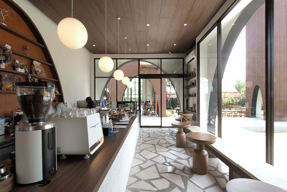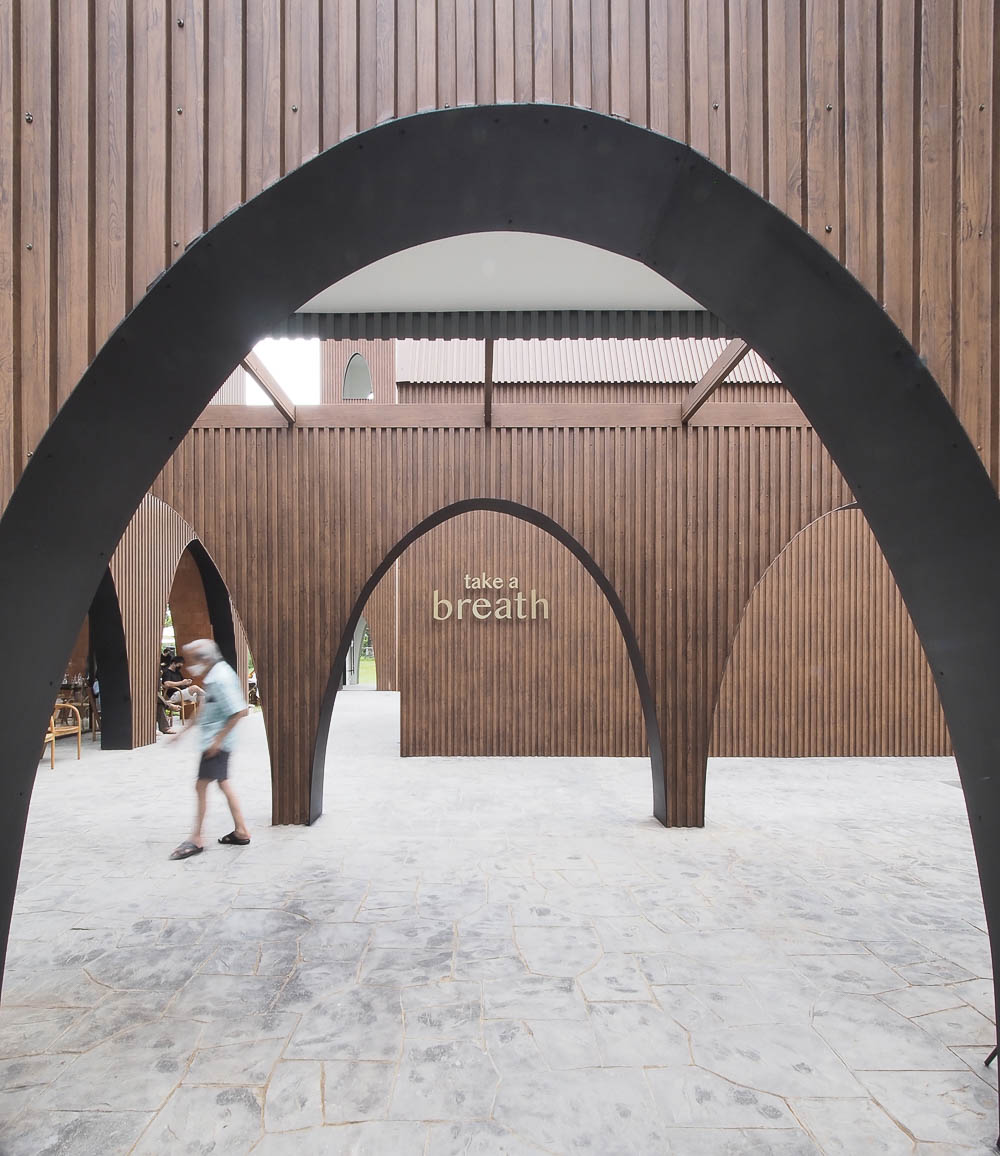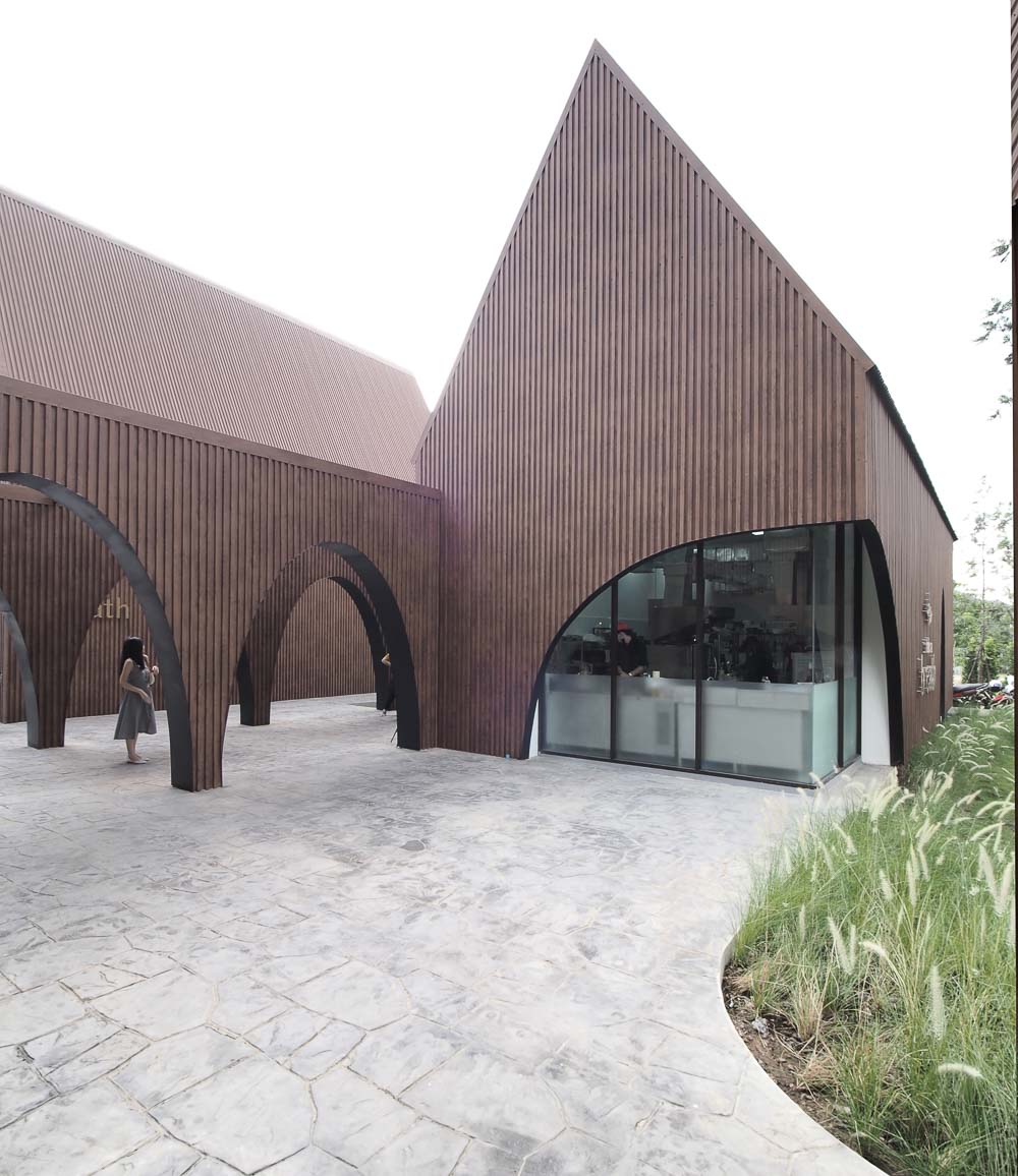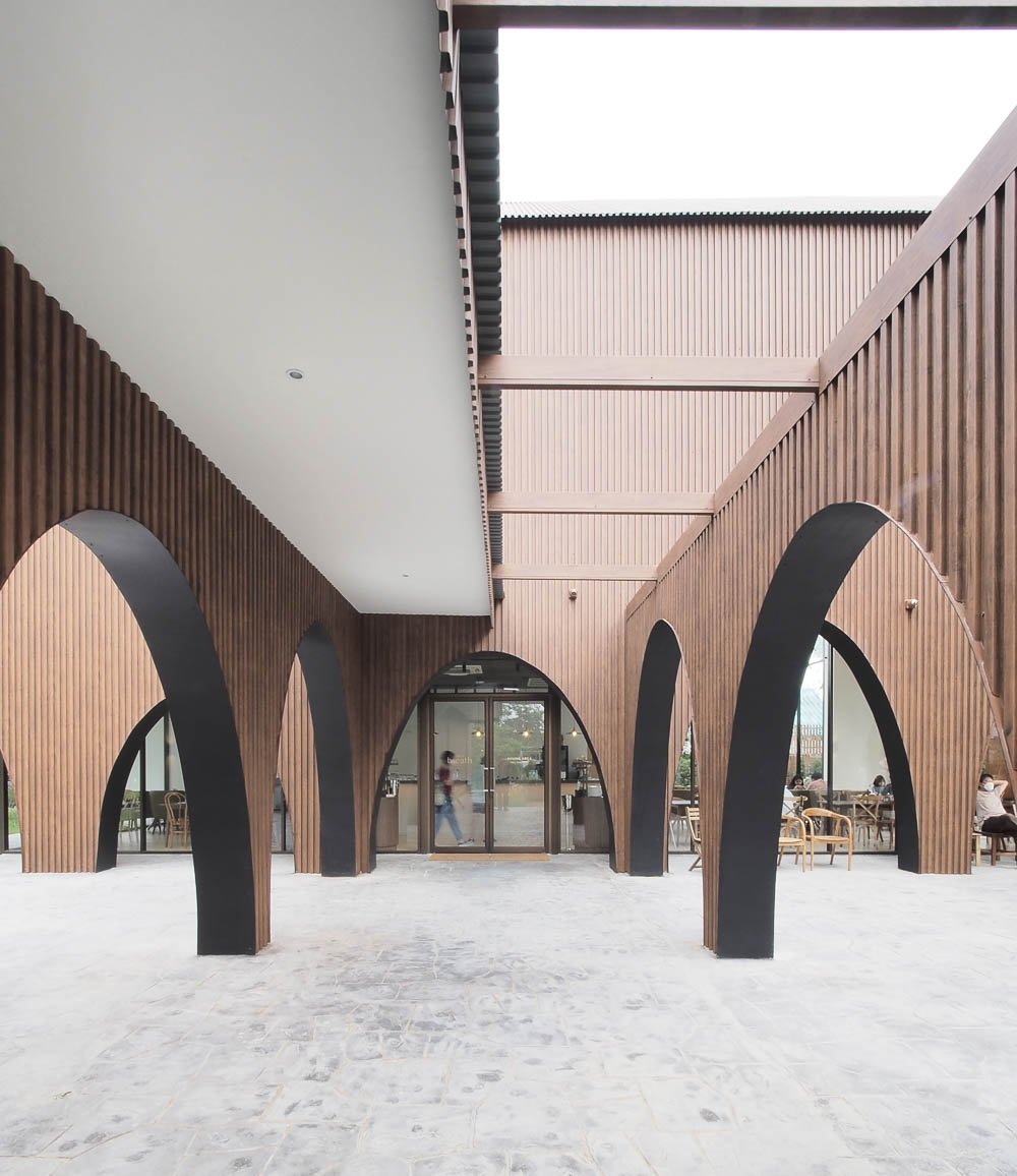 The layout is separated into three parts from the front to the back of the site sequencing is the parking area, the functional area, and the backyard area. A wood-like metal sheet was selected as the primary material to clad all siding along the roof, with arch-shape openings making them a homogeneous look bold from the surrounding context. Various size of arch-shaped voids is specifically randomly located, such as the corner of the central kitchen, which tends to show the movement of the chefs for the newcomer guest, the backside of the main dining area, and the cafe to provide the view to the backyard behind.