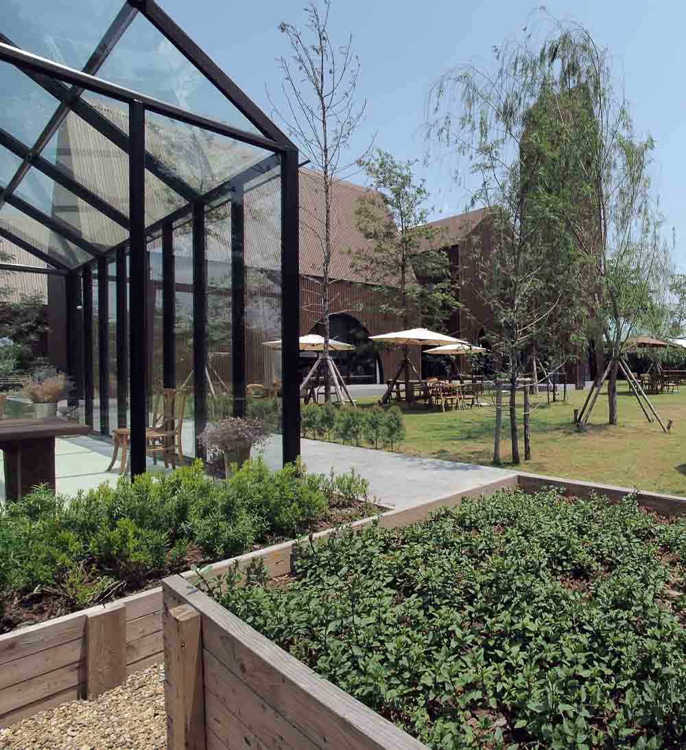대지는 크게 세 구역으로 나뉜다. 앞에서부터 뒤로 대지를 따라 주차공간, 기능적 공간, 뒷마당으로 구분된다. 지붕과 외벽의 주재료로 나무처럼 보이는 금속판이 선택됐는데, 이 건물의 외벽에 있는 아치형 개구부는 비슷한 형태의 건물을 대담해 보이게 한다. 다양한 크기의 아치형 개구부는 무작위로 배치됐다. 중앙 주방 건물의 모퉁이에 있는 개구부는 셰프의 움직임을 보여주고, 레스토랑의 뒷면, 카페는 뒷마당의 풍경을 제공한다.
