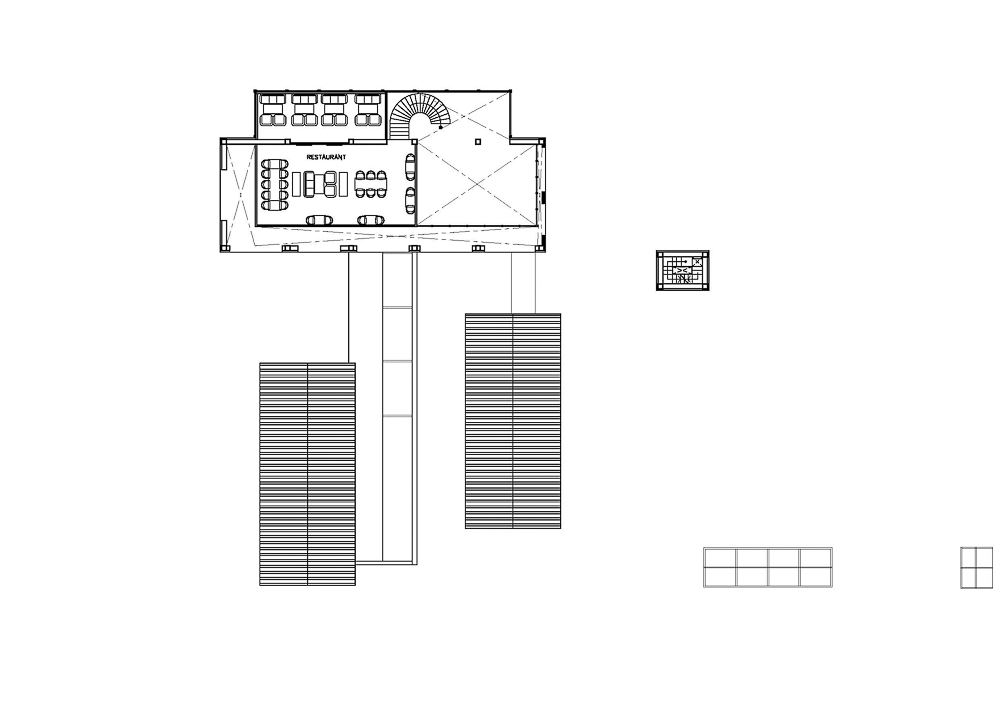 카페는 ‘테이스트스페이스’의 콘셉트를 따라, 숲 속에 있는 현대적인 헛간이 자연과 사람들을 연결한다. 카페는 총 3개의 볼륨으로 구분되며, 모든 건물은 박공지붕의 형태를 하고 있다. 또한, 종탑과 두 개의 작은 온실과의 높이를 맞추기 위하여 카페, 레스토랑과 주방이 있는 건물의 최고 높이는 약 8m 정도로 정해졌다. 레스토랑의 메인 식사 공간은 복층으로 되어있고, 주방과 카페를 수직으로 지나는 외부 복도는 나란히 서 있는 두 개의 건물을 연결하고 있다. 각 기능에 따라 건물이 나뉘게 된 것은 건축 법규상 한 건물에 큰 레스토랑을 둘 수 없었기 때문이었다.