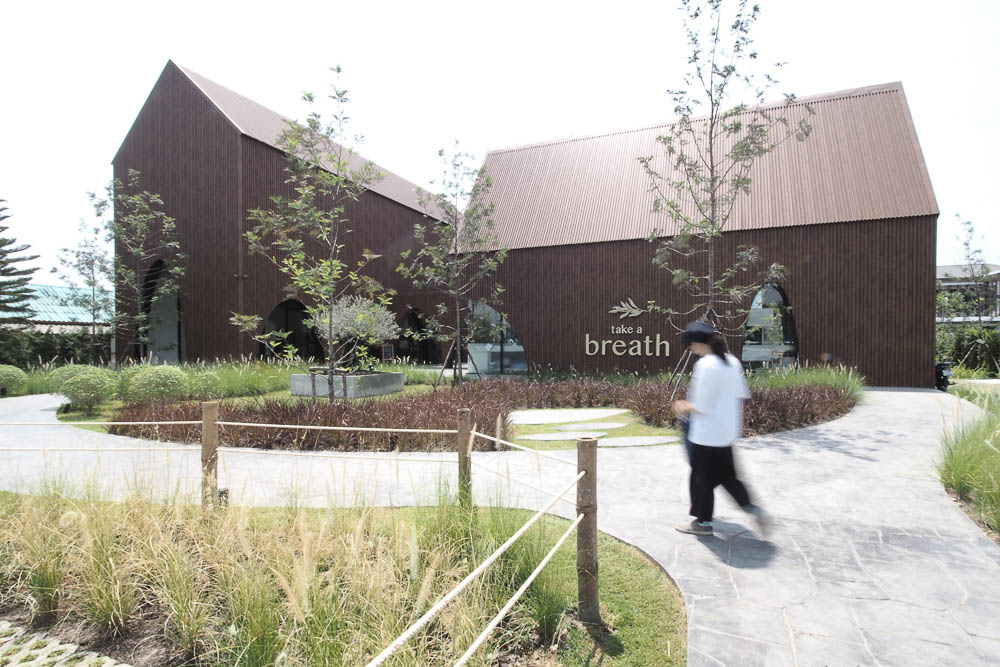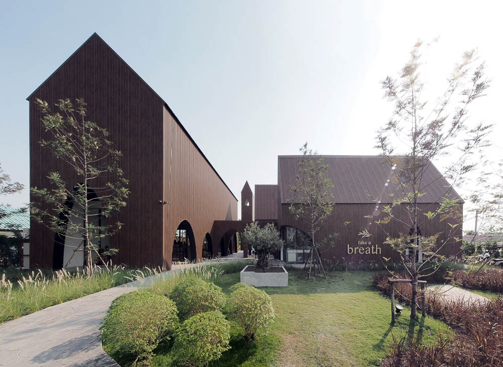 Take a breath cafe is a new cafe and restaurant with the inspiration of a barn in the wood that separated into a cluster of the building in three main buildings by its functions as a cafe, restaurant, and kitchen along with a high noticeable bell tower.
