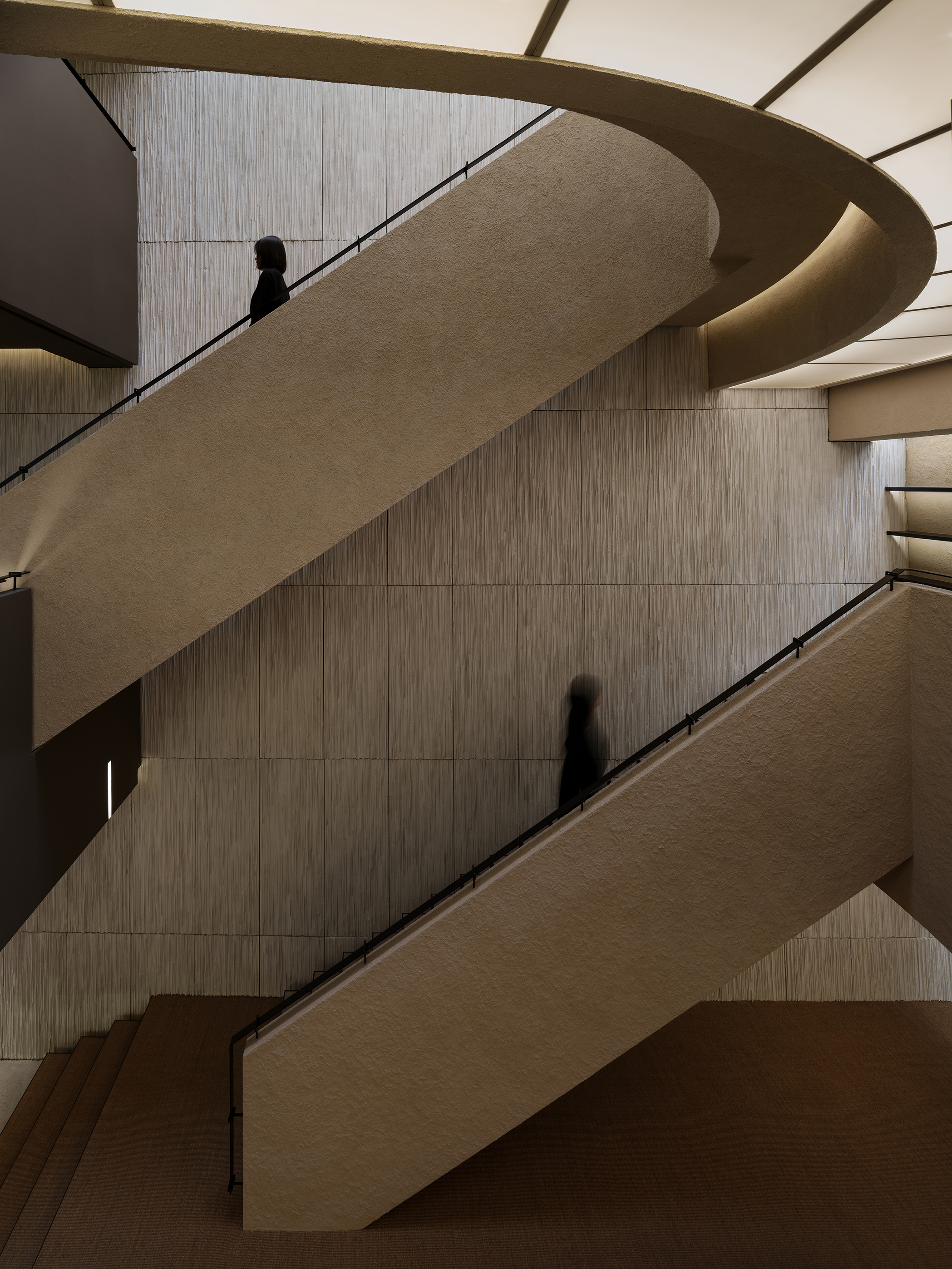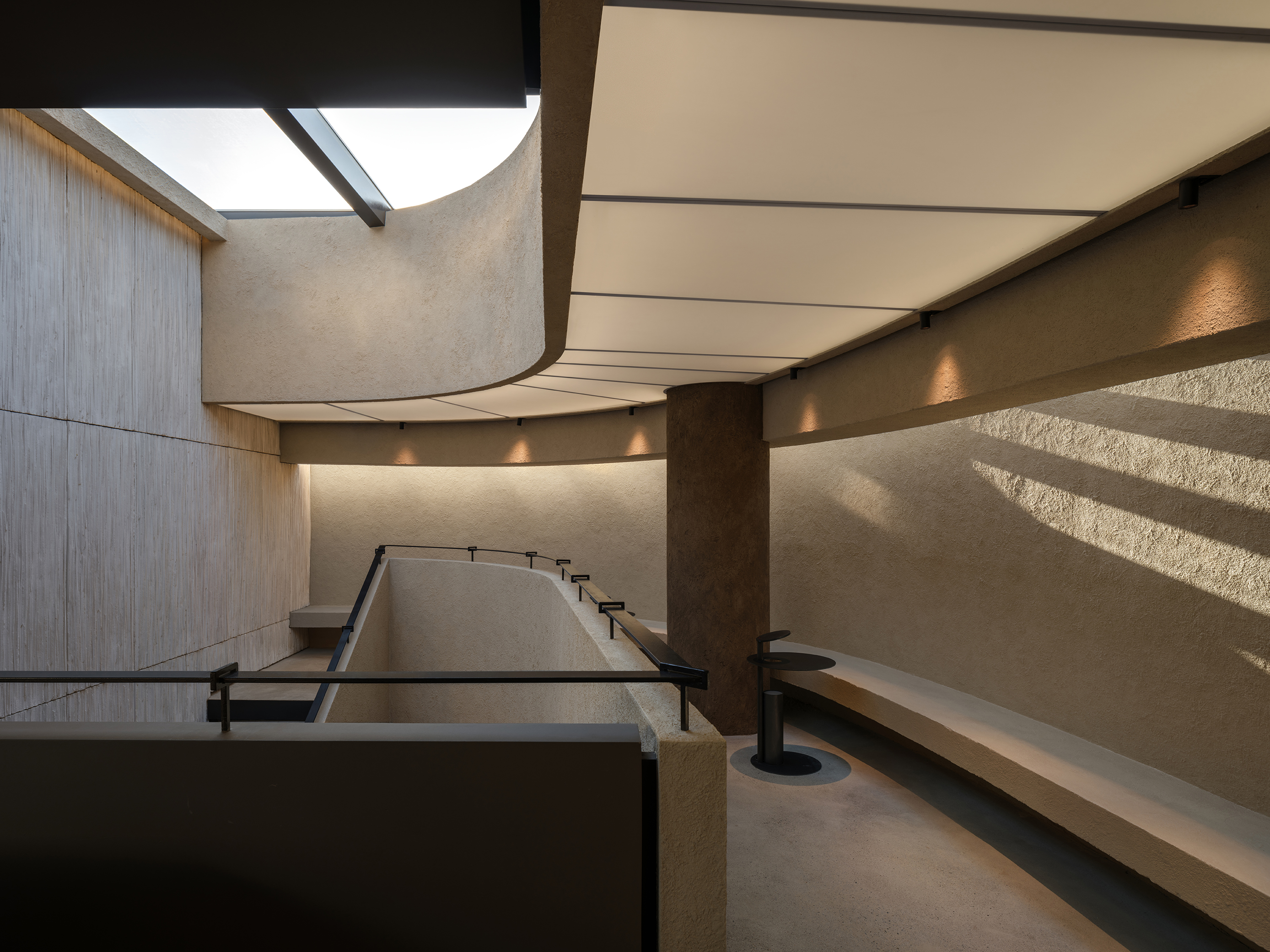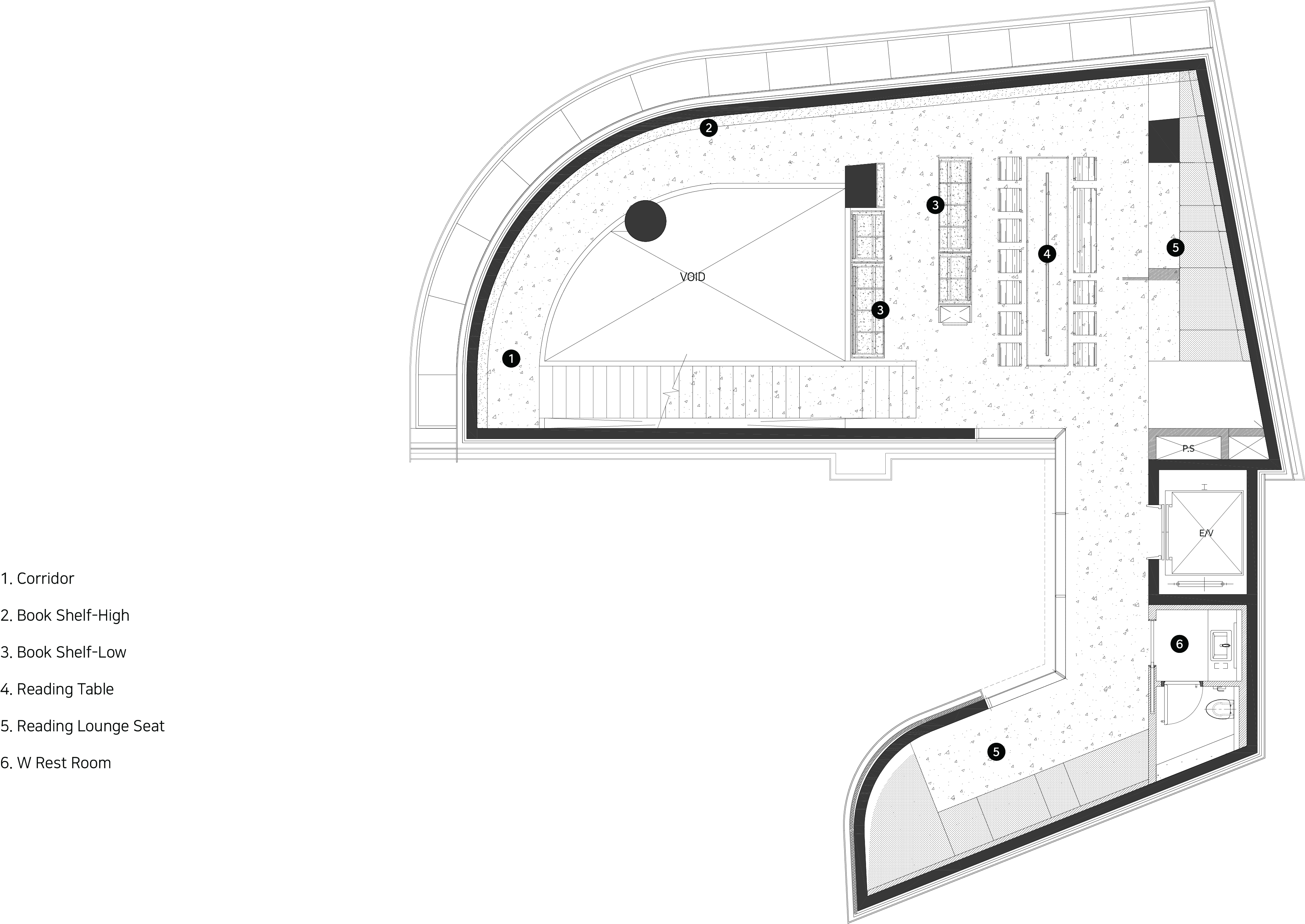 쏟아지는 챗살을 따라 2층으로 올라가면 곡선형 복도를 통해 자연스레 독서할 수 있는 공간에 도착한다. 중앙에는 낮은 선반을 배치하여 벽쪽에 배치된 책들을 한눈에 파악할 수 있으며, 모퉁이 공간에서는 편안히 독서할 수 있는 bed sest가 마련되어 있다.