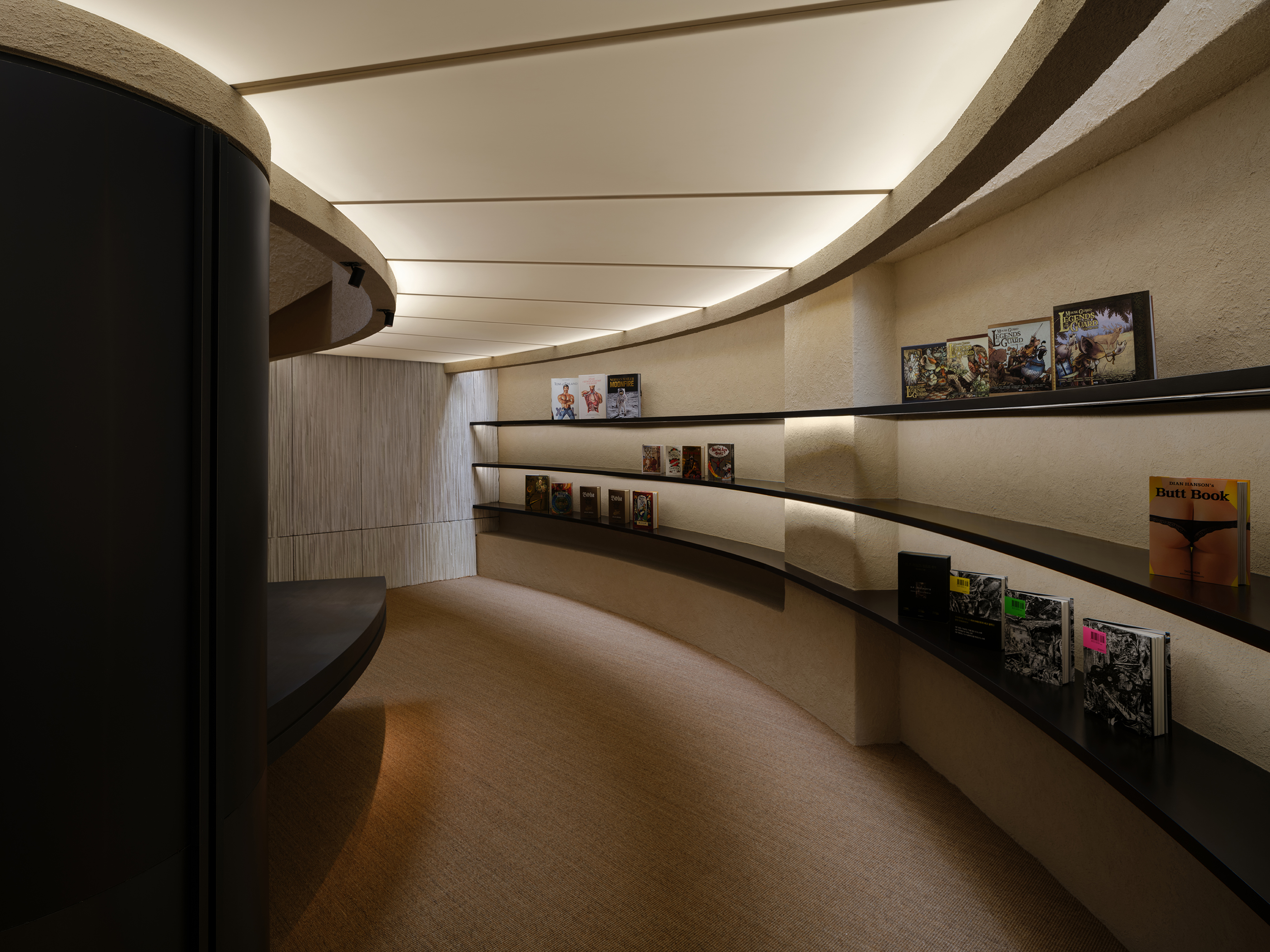 The graphic bookstore is a 'drinking comic book cafe' and the third floor is made up of liquid bars. The wall is composed of shelves to load face-off books and alcohol, and guests on the first and second floors can freely enjoy alcohol and comic books together using the self-bar.