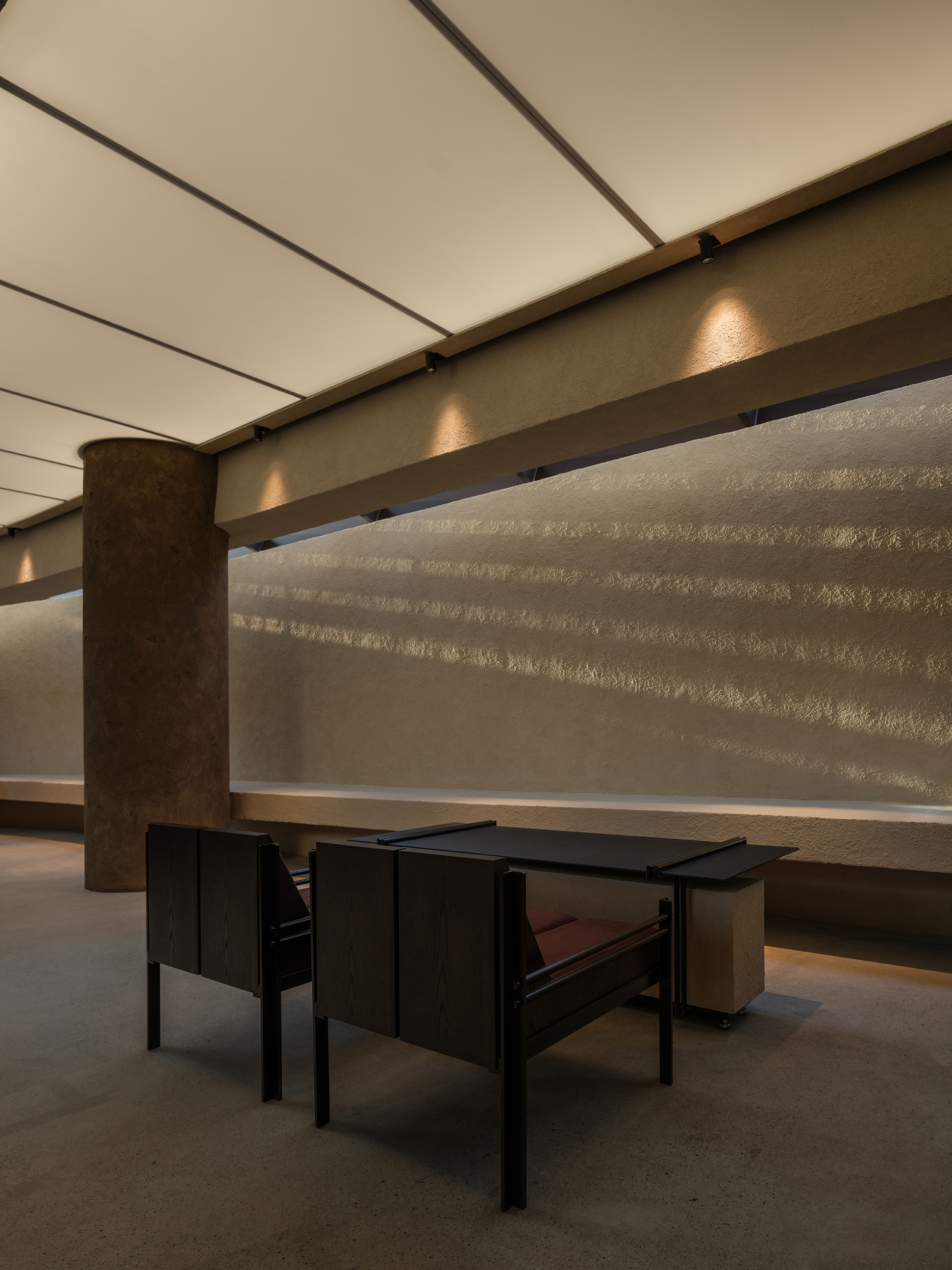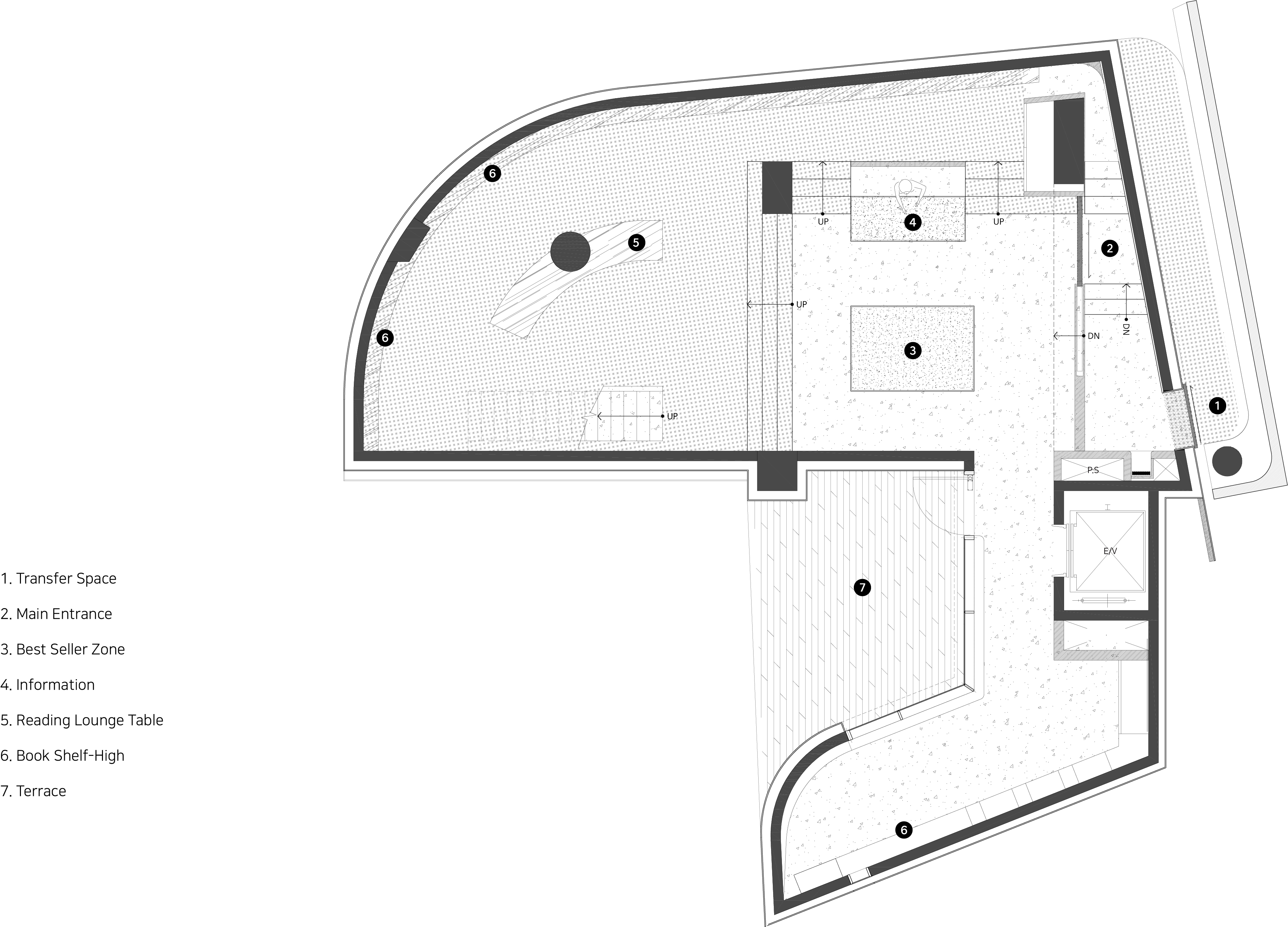 외부에서 내부로 연결된 전이공간을 따라 진입하면, 천창 사이로 들어오는 빛과 함께 책들이 줄을 이루고 있다. 입구에는 베스트셀러를 한눈에 볼 수 있게끔 낮고 넓은 테이블을 배치하였고, 바닥에는 자연 스러운 멍석이 깔려있어 어디서든 편하게 독서를 즐길 수 있다.