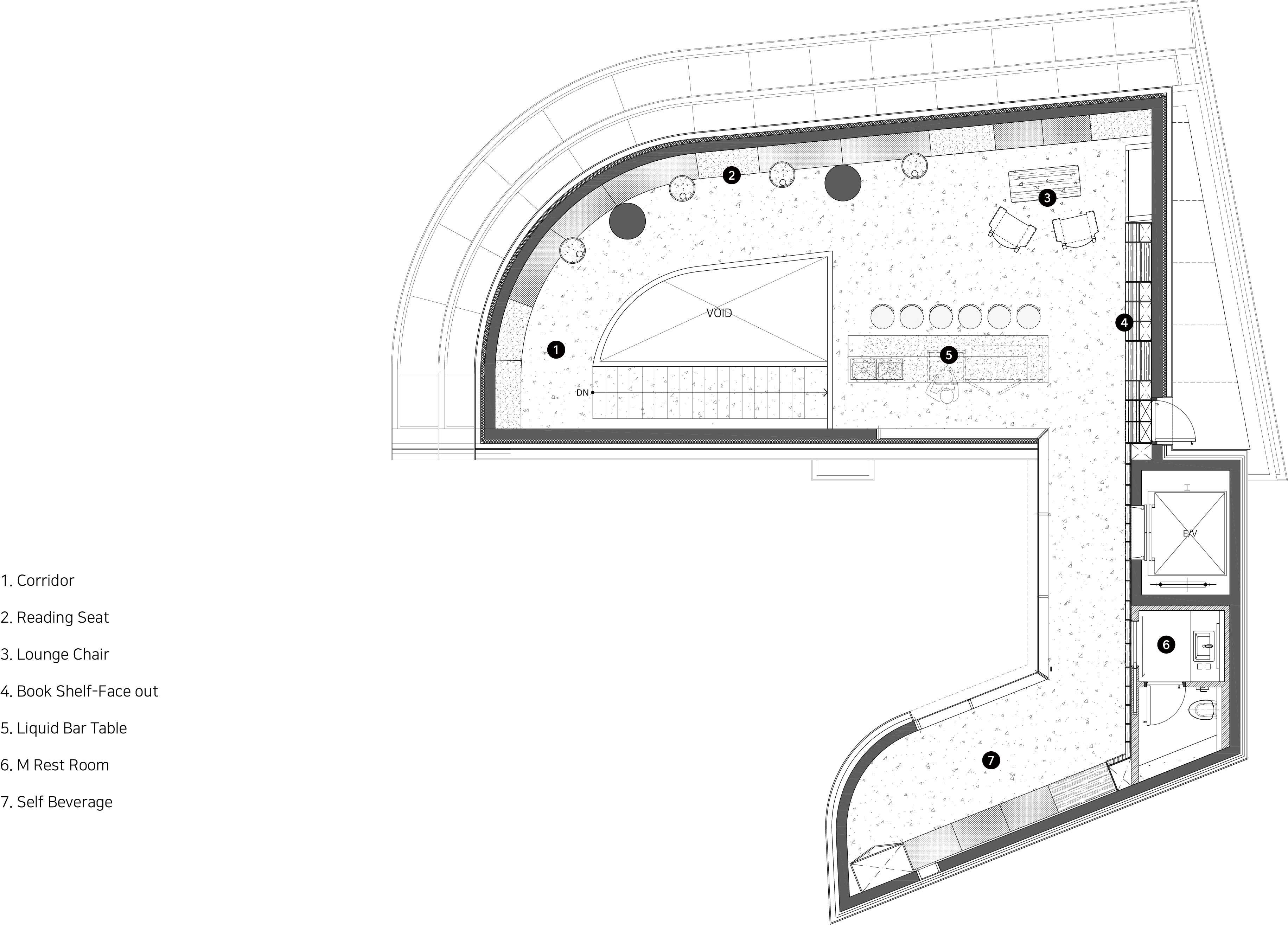 The graphic bookstore is a 'drinking comic book cafe' and the third floor is made up of liquid bars. The wall is composed of shelves to load face-off books and alcohol, and guests on the first and second floors can freely enjoy alcohol and comic books together using the self-bar.