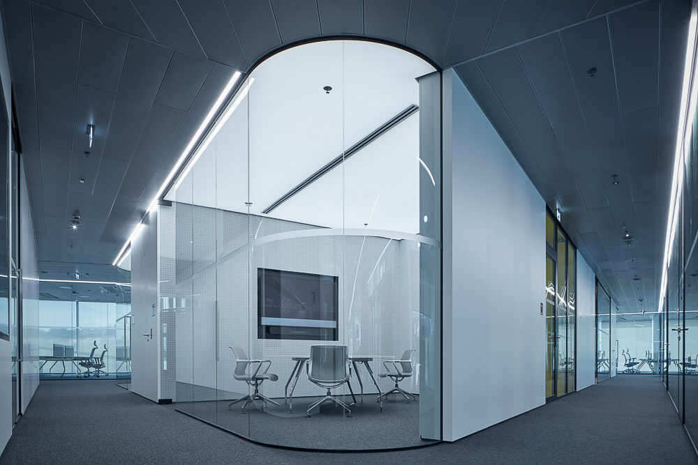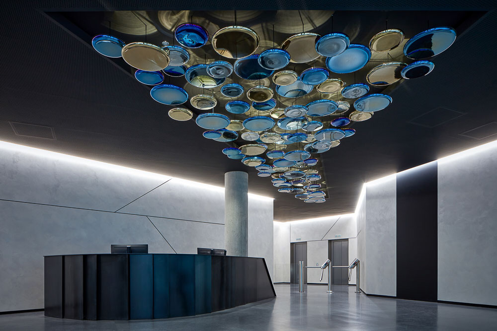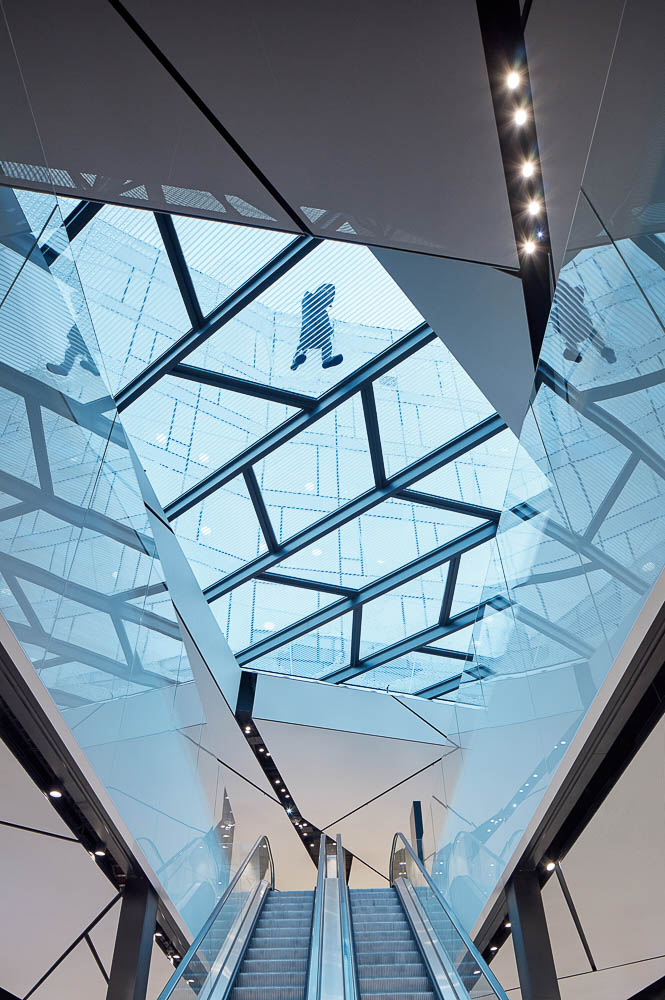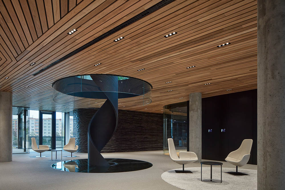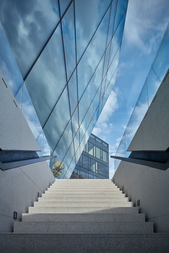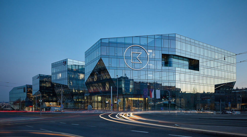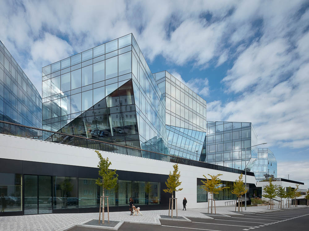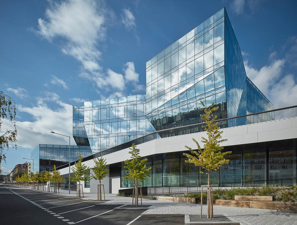 The four individual volumes of the building are shaped according to the fractal self-similarity principle and derived from existing site geometry. This approach generated a responsive building shape changing with the character and elevation of the perimeter streets, while still meeting the demands of the office space typology. The irregular shapes of the volumes are not arbitrary external design features, in fact they match closely the interior layout and the building function. Each of the four volumes is similar to the other ones, and all are bound together in one composition. Carefully assembled from the irregular “crystals”, the form of the permeable city block emerges. The scope of the design went beyond just individual buildings’ aesthetics and rational floor layout - the space around and in between buildings was equally important. The four crystalline volumes stand on a low two-story plinth. The purpose of the plinth is to address the different elevations of neighbouring streets. Narrow alleys and small open spaces are formed between the crystals, reminiscent of the public spaces typical for compact historical city centres. The design also introduces a small “piazzetta”, located at the site of a similar pre-existing historical square. The piazzetta also provides barrier-free access to the whole building complex and the metro station vestibule. A Federico Diaz sculpture underscores the place’s significance. For both the interior and the exterior, the scope of possible movement through the complex could be likened to that of an anthill. Sufficient accuracy of the crystalline shapes could only be achieved with a structural glass facade. Specifying the light transmission characteristics for the glass used for the project made it possible for the outside observer to take in the complex geometry of the buildings, while avoiding, to a large extent, any strong reflections or sun glare, undesirable in the given urban context. For its rainwater management solution, extensive green roofs and the building energy management system (energy recovery from elevators, heat exchanger), among other things, the building complex has been awarded the internationally recognized LEED Gold environmental certificate.