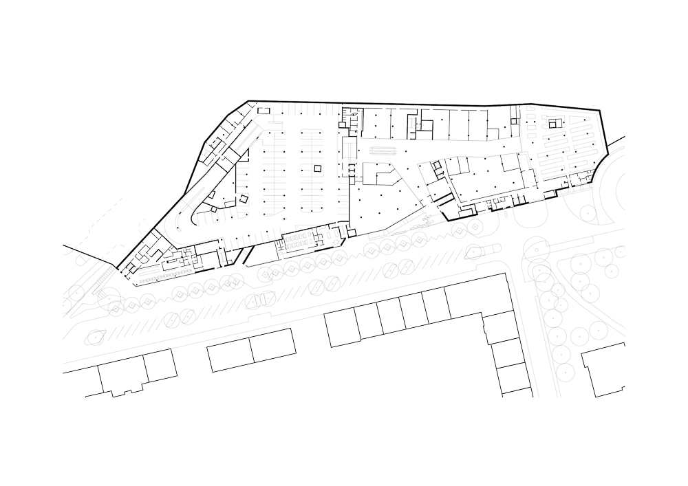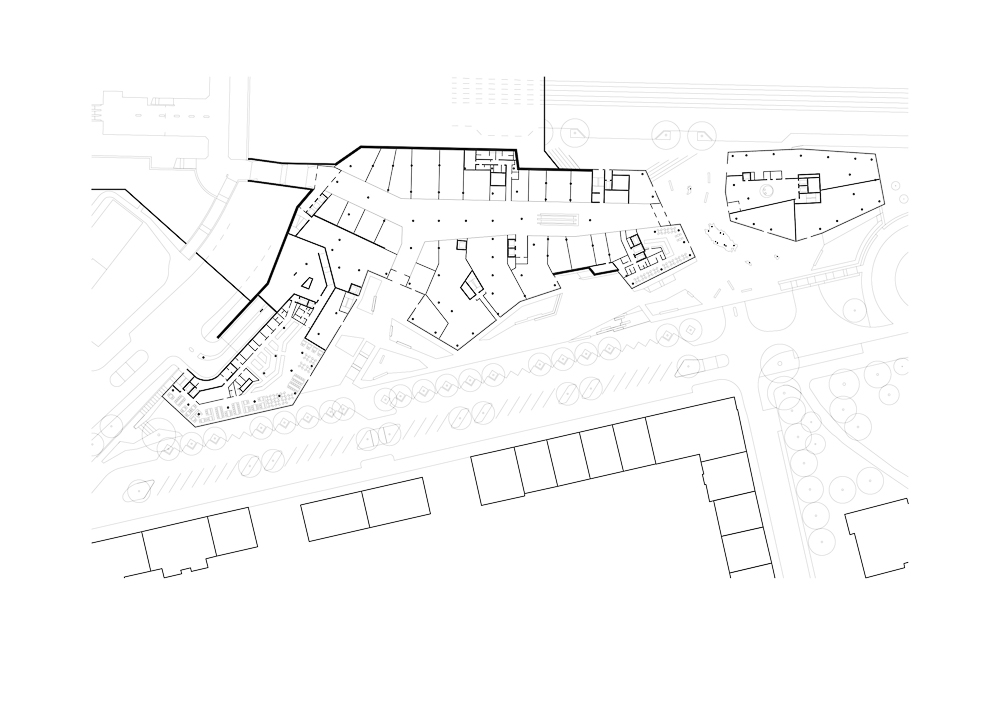 The building site is located directly over a metro station, right next to one of the city’s major radial roads, Evropska, which connects the city centre to the airport. The site has an elevation difference ranging from 7 up to 14 meters and is immediately surrounded by heterogeneous development. In 2012, conscious of the significance and complicated character of the site, the KKCG REG investment company held an international architecture workshop to find a suitable solution for its development. Significant urban development was happening all along the Evropska street during the 20th century. Company headquarters and other imposing buildings were being erected here. For both the developer and the architect it became a common goal to provide local residents with a vibrant urban complex offering amenities, cafes, restaurants and shops - in the form of a refined public space. A tight functional linkage between architecture and public space, serving both local citizens and visitors, was envisioned by the client. The design had to be confident and conscious of the urban context at the same time, responsive to the surrounding development.