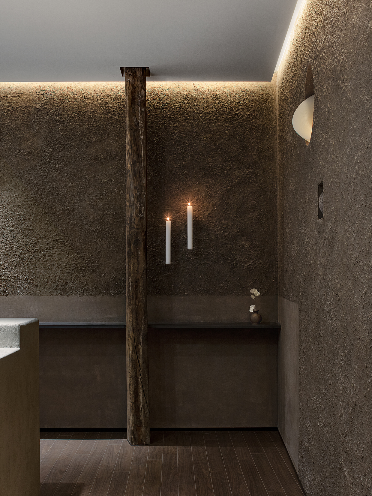 The project is the fourth branch of Grand Hand located in Donggyo-dong, Mapo. Usually, if you look at the linguistic expression method of incense, it is often expressed by texture. Rough scent, soft scent, rough scent... This is a way to express invisible senses verbally. We were very interested in the way we expressed the sense of scent in texture, and focused on spatializing and visualizing invisible scents through the physical properties of the material. Among them, what was found in the most effective way was that the physical properties of the materials used in the space were perceived by the texture and touch of light. Therefore, the effect of dramatic contrast caused by juxtaposing a very soft material and a very rough material in one space was adopted as an expression method. In conclusion, we wanted to express the "texture of scent" as a space.