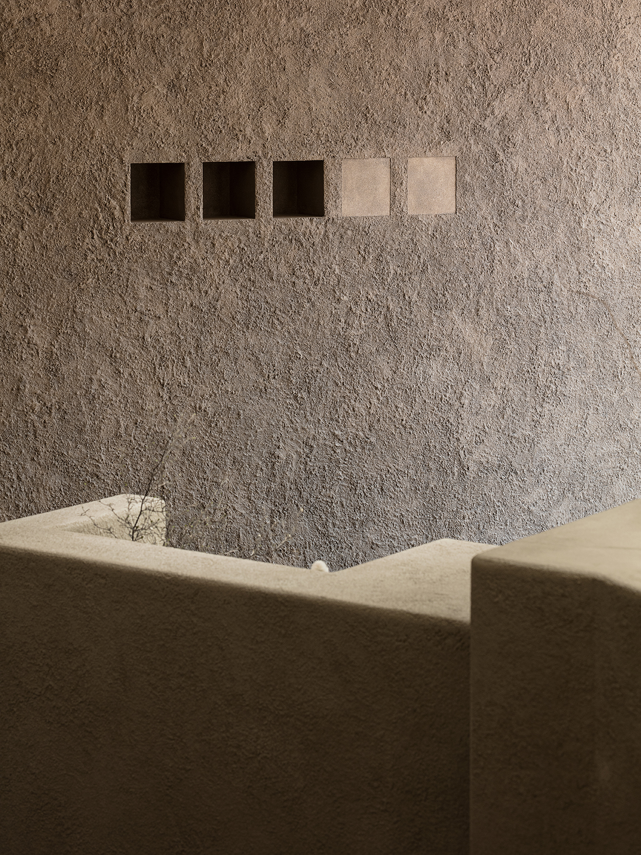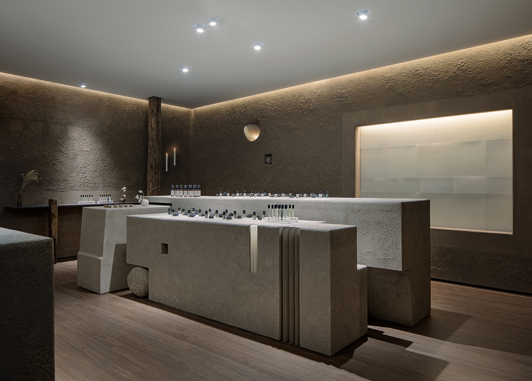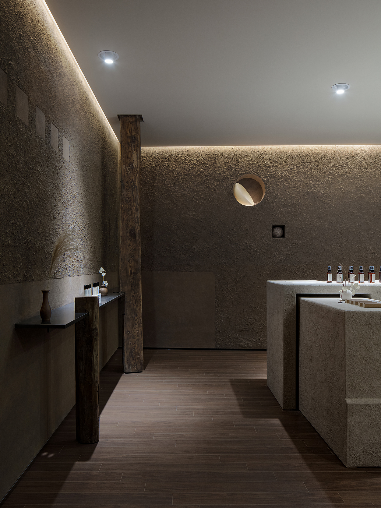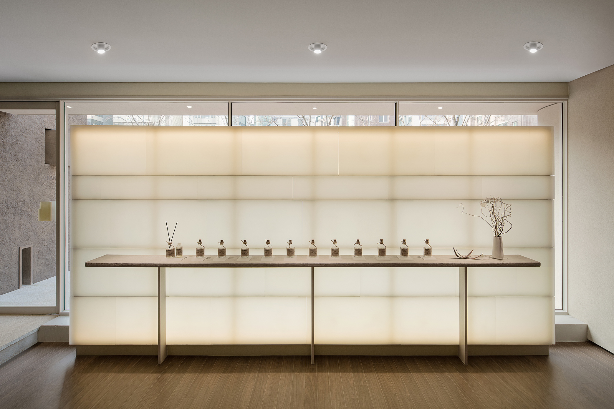 The project is the fourth branch of Grand Hand located in Donggyo-dong, Mapo. Usually, if you look at the linguistic expression method of incense, it is often expressed by texture. Rough scent, soft scent, rough scent... This is a way to express invisible senses verbally. We were very interested in the way we expressed the sense of scent in texture, and focused on spatializing and visualizing invisible scents through the physical properties of the material. Among them, what was found in the most effective way was that the physical properties of the materials used in the space were perceived by the texture and touch of light. Therefore, the effect of dramatic contrast caused by juxtaposing a very soft material and a very rough material in one space was adopted as an expression method. In conclusion, we wanted to express the "texture of scent" as a space.