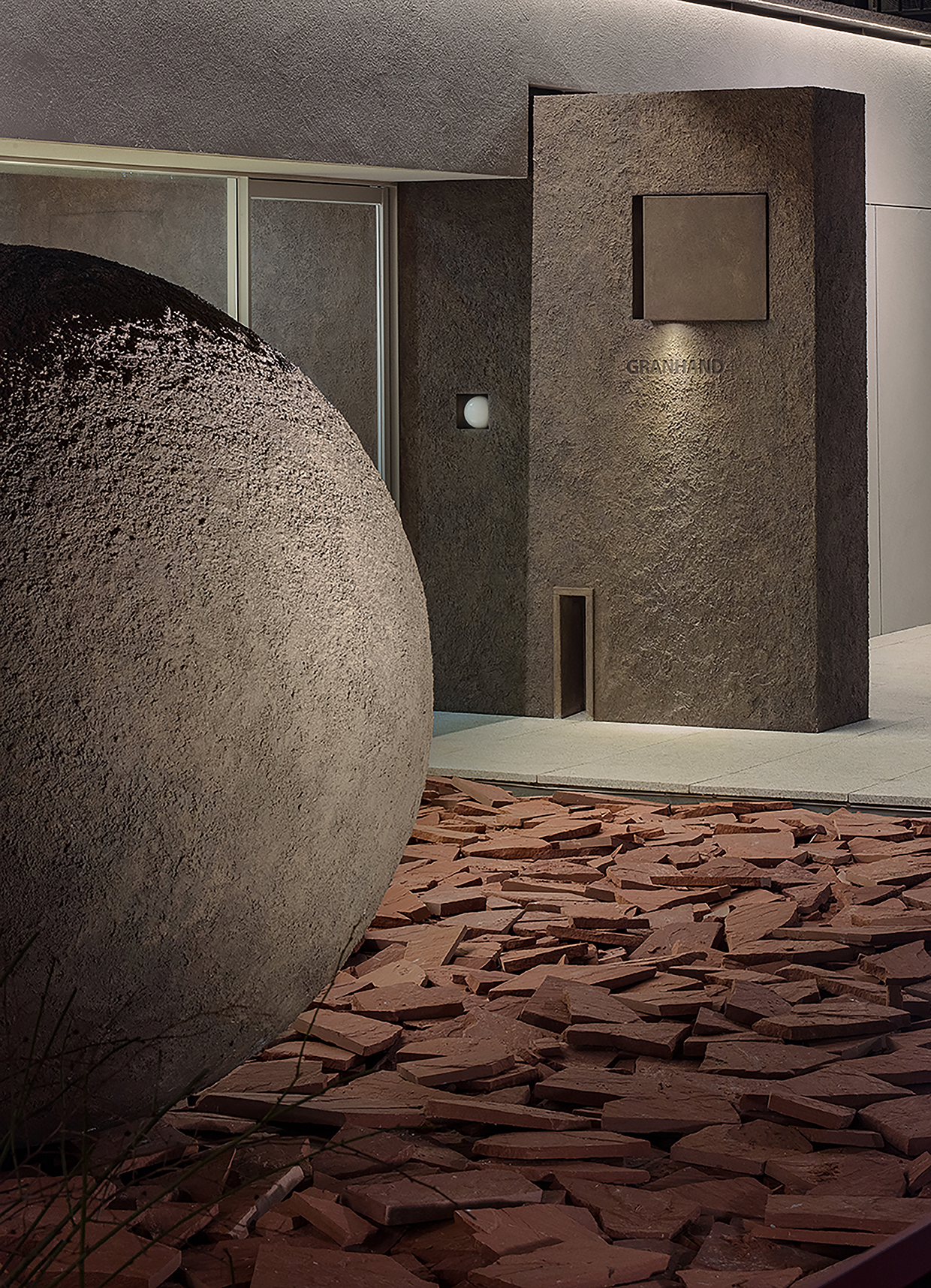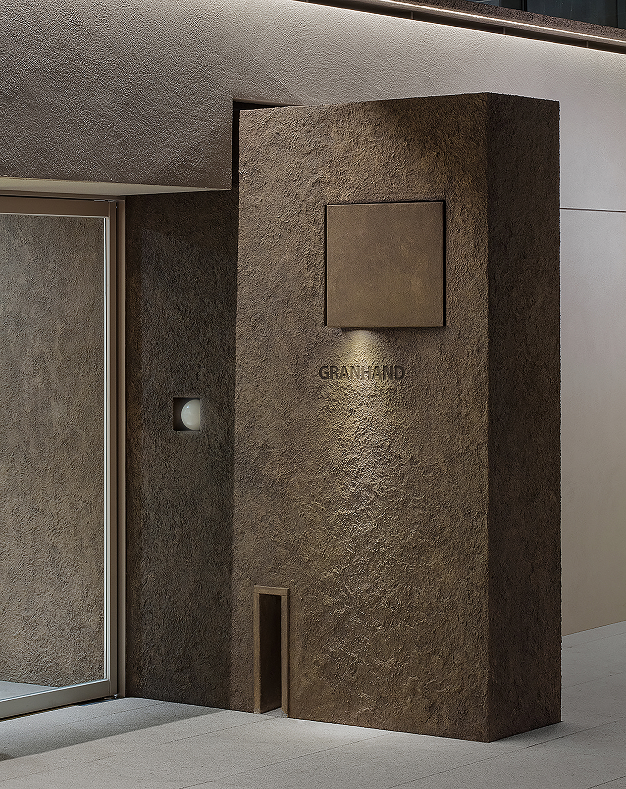 이번 프로젝트는 마포 동교동에 위치한 그랑 핸드의 네 번째 지점이다. 통상적으로, 향의 언어적 표현 방법을 살펴보면 질감으로 표현을 하곤 한다. 거친 향, 부드러운 향, 투박한 향... 이것은 보이지 않는 감각을 언어적으로 표현하기 위한 방법이다. 우리는 향이라는 감각을 질감으로 표현하는 방식이 매우 흥미로웠고, 보이지 않는 향을 재료의 물성을 통해 공간화하고 가시화하는 것에 집중하였다. 그 중에 가장 효과적인 방법으로 찾아낸 것은 공간에 쓰인 재료의 물성이 빛으로 인한 질감, 촉감 등으로 인지된다는 것이었다. 따라서, 아주 보드라운 소재와 아주 거친 소재를 한 공간에 놓아 병치함으로써 생기는 극적 대비의 효과를 표현 방법으로 채택하게 되었다. 결론적으로, 우리는 "향의 질감"을 공간으로 표현하고 싶었다.
