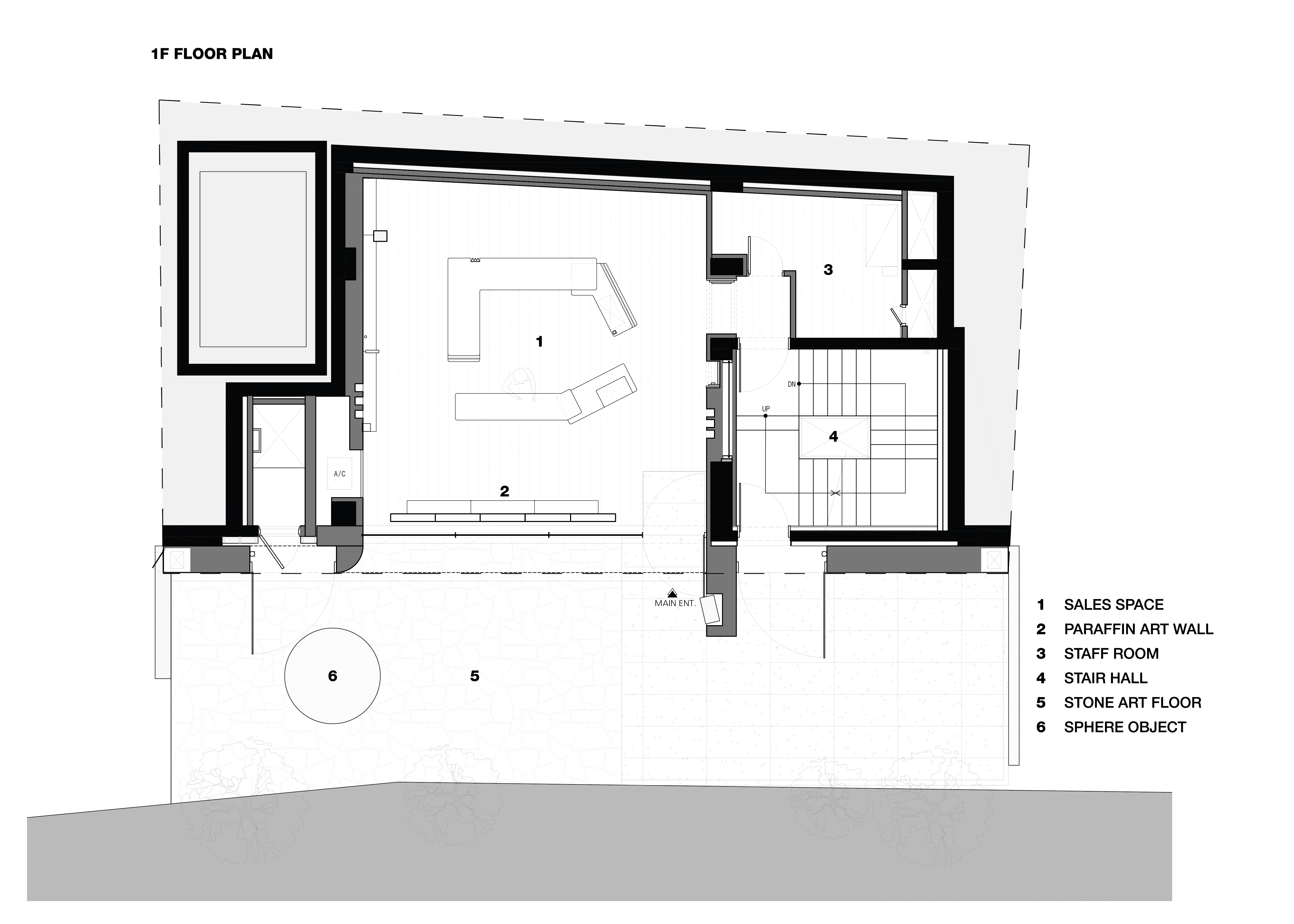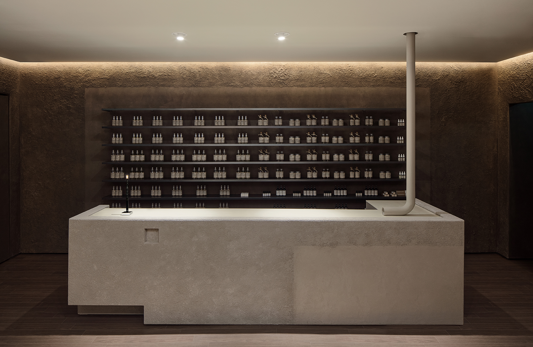 사이트가 가진 특성상 전면 창에 비치는 남서향의 햇빛이 너무 강하여 1층 매장 내부로 과하게 쏟아지는 빛을 막고자 어떠한 공간적 장치가 필요하였다. 그 공간적 장치는 빛을 머금고 내부 공간을 보드랍게 감싸줄 수 있는 무엇이라고 생각했다.파라핀이 굳혀진 모습을 보고 우리는 파라핀으로 만든 벽(길이 5m / 높이 2m)을 세워 외부 환경을 걸러내고자 하였다. 초기 계획은 이 벽을 건축용 거푸집을 사용해 뜨겁게 녹인 파라핀을 한 번에 부어 완성하고자 하였으나, 시공 당시는 가장 추운 혹한기여서 온도에 취약한 파라핀이 금이 가거나 안전사고에 위험이 생길 수 있기에 우리는 블록 타입으로 생산 방식을 교체하여 우리의 사무실에서 직접 생산하게 되었다. 1층과 지층으로 나뉜 매장의 특성상, 그랑핸드 디자인 팀은 물리적 연결보다는 감각의 체험 장치를 연결하여, 일층에서 구매한 제품을 플라스틱 공에 넣어 지하층으로 보내는 장치를 통해 지층의 매장까지 경험토록 제안을 하였으며, 우리는 그 아이디어를 파이프에 공을 흘려 보내는 방식으로 디자인하게 되었다. 파라핀으로 만든 입구의 큰 벽 외에도 벽 조명이나 손잡이, 오브제 등으로 사용되었으며, 잉고 마우러의 플라잉 캔들이나 디지털 캔들 같은 조명을 이용해 초의 다양한 해석을 하고 싶었다. 마지막으로, 외부 파사드의 거대한 구는 한 가지의 질감이 시간에 따른 다양한 각도에 여러 가지 거친 질감을 한 번에 보여줄 수 있는 도구이며, 내부 공간을 암시하는 장치이기도 하다.
