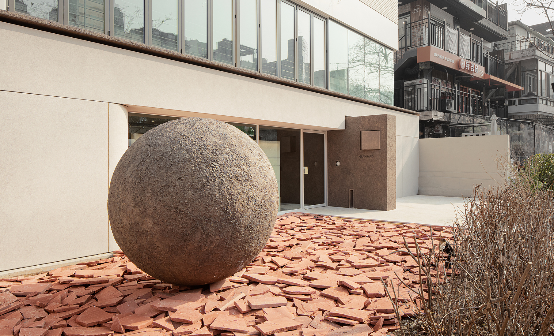 Due to the nature of the site, the southwest sunlight reflected in the front window was so strong that some spatial devices were needed to prevent excessive light from pouring into the store on the first floor. The spatial device was thought to be something that could hold light and gently wrap the interior space.When we saw the paraffin hardened, we tried to filter out the external environment by building a wall made of paraffin (5 m long / 2 m high). The initial plan was to complete the wall by pouring hot-melted paraffin using building molds at once, but at the time of construction, it was the coldest cold season, so we replaced the block type production method and produced it directly in our office. Due to the nature of the store, the Grand Hand design team proposed connecting sensory experience devices rather than physical connections to experience products from the ground floor in plastic balls and sending them to the ground floor, and we designed the idea by letting them flow into pipes. In addition to the large wall of the paraffin entrance, it was used as wall lighting, handles, and objects, and wanted to use lighting such as Ingo Maurer's Flying Candles and Digital Candles to interpret the candle in various ways. Finally, the giant sphere of the outer fa드의ade is a tool that allows one texture to show multiple rough textures at different angles over time, and is also a device that implies an interior space.