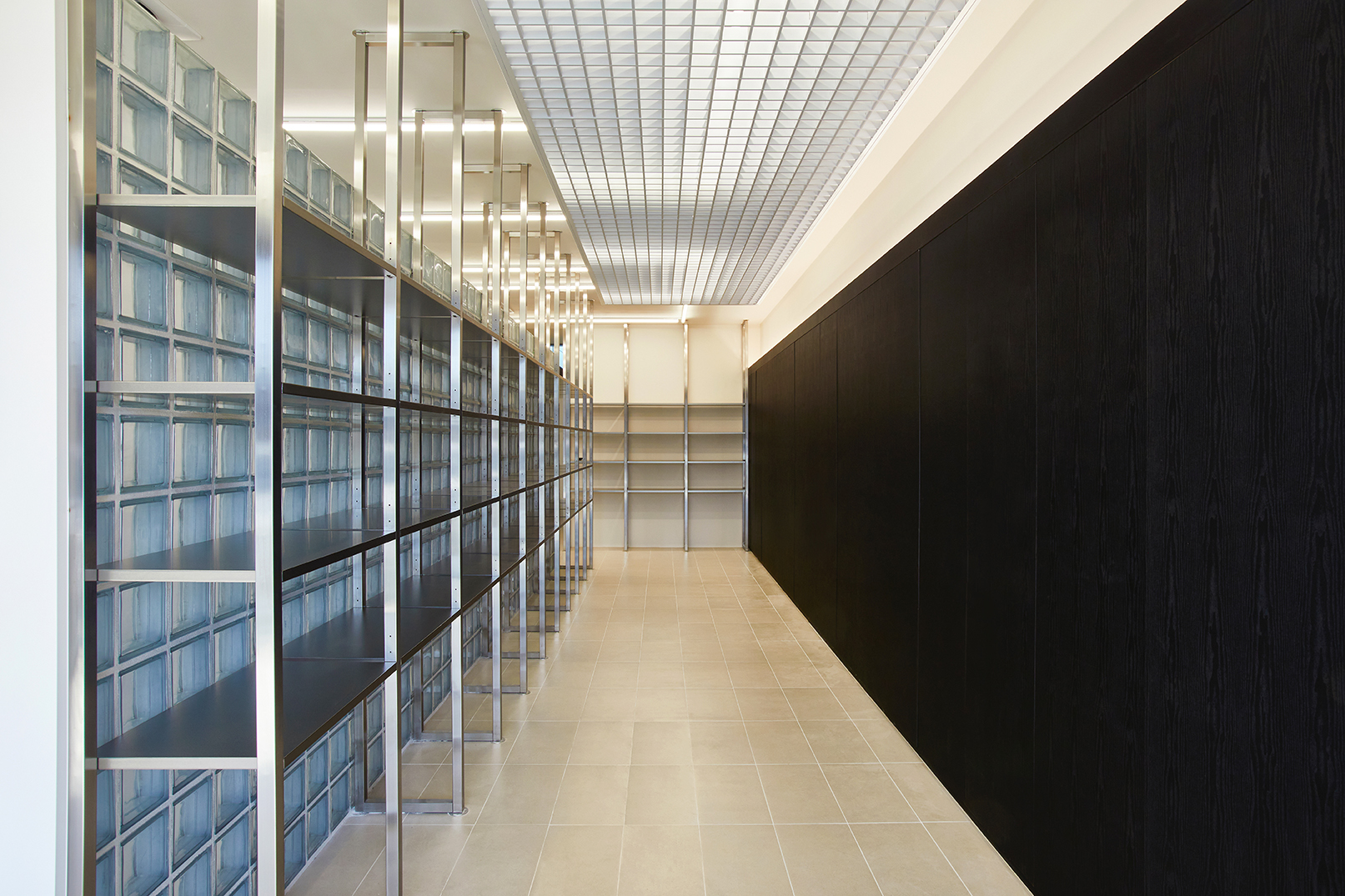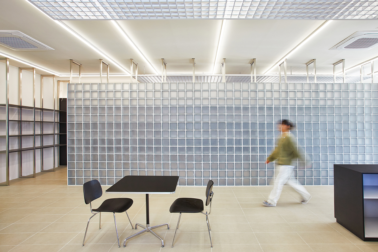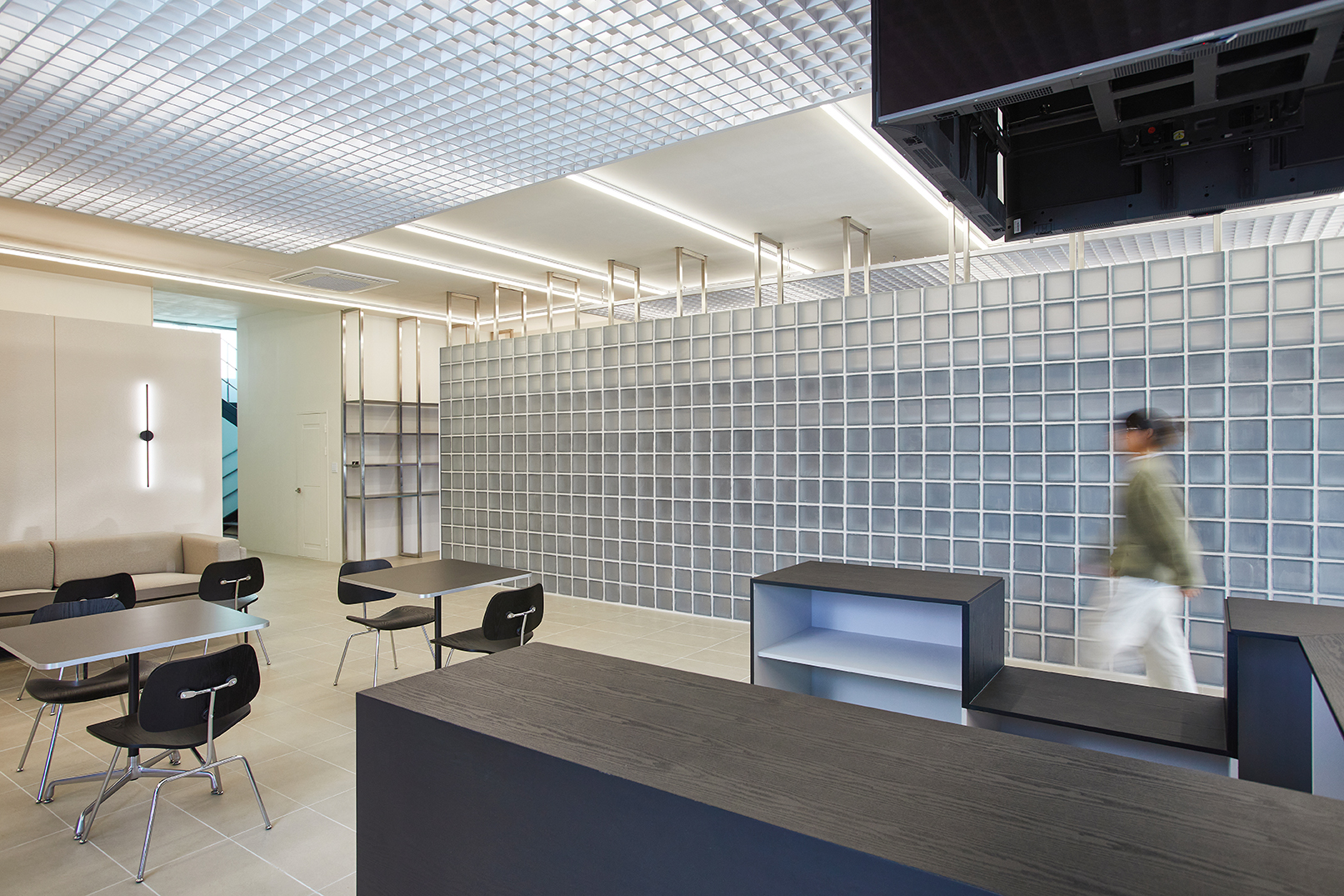 It provides a cool sense through a straight glass block and projects objects inside with translucent silhouettes to induce consumer curiosity. In addition, a connection with the glass block is formed through the grating of the ceiling, thereby forming a stable feeling. The counter and furniture in the center of space use black to balance the overall weight of the space.