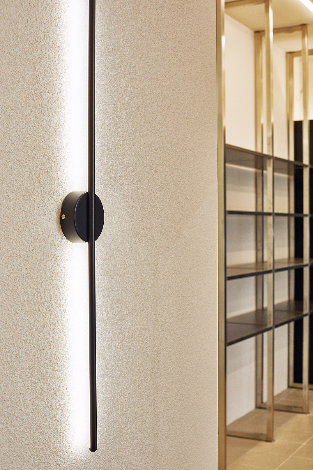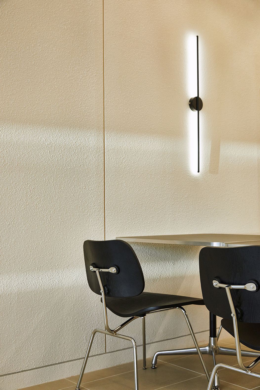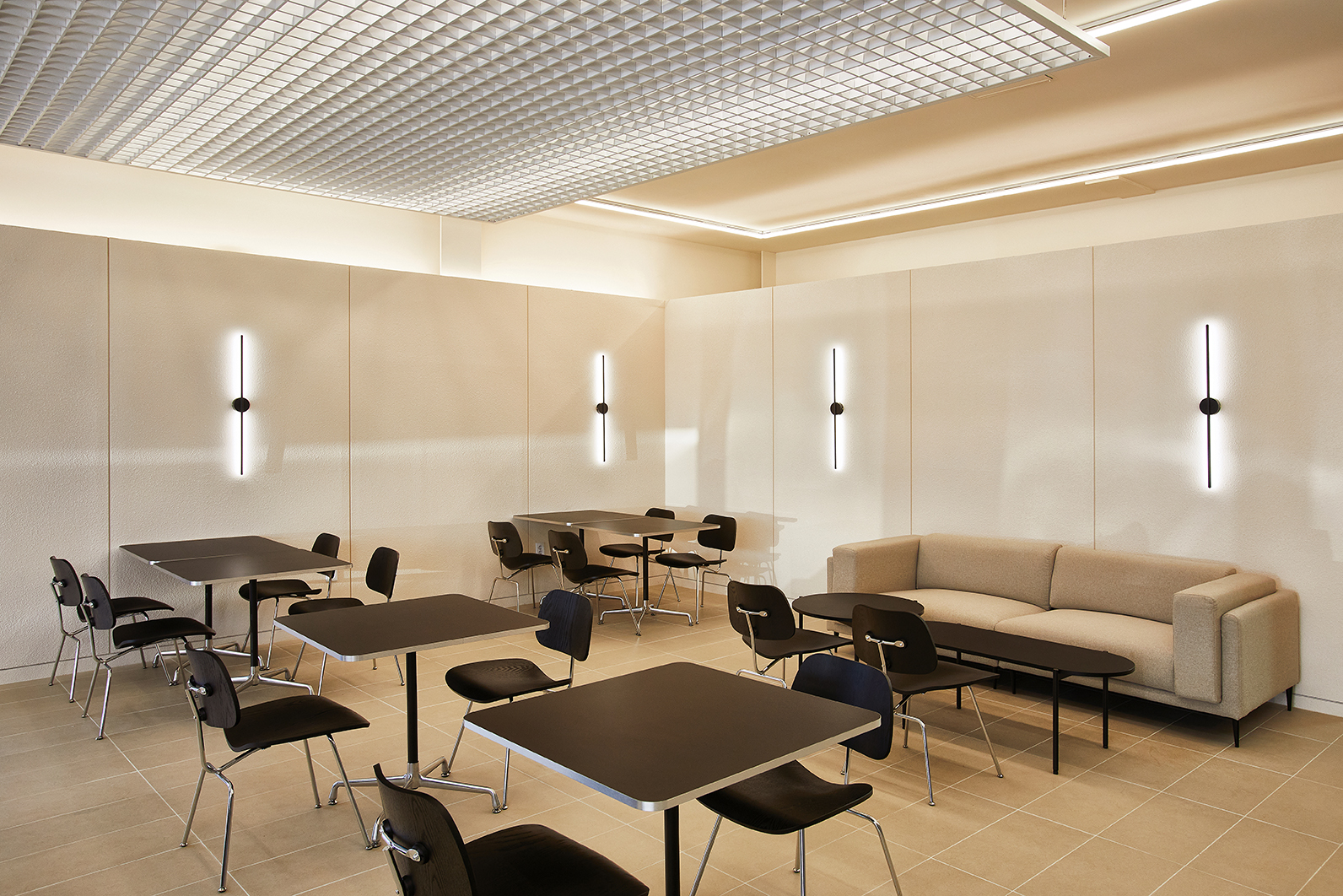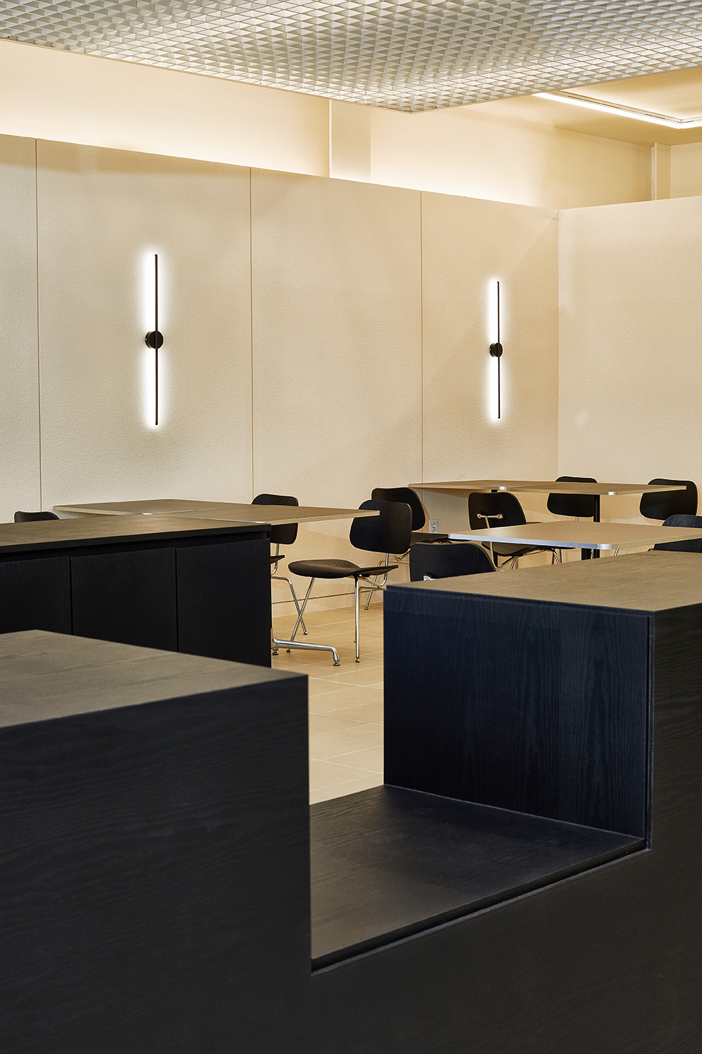It provides a cool sense through a straight glass block and projects objects inside with translucent silhouettes to induce consumer curiosity. In addition, a connection with the glass block is formed through the grating of the ceiling, thereby forming a stable feeling. The counter and furniture in the center of space use black to balance the overall weight of the space.