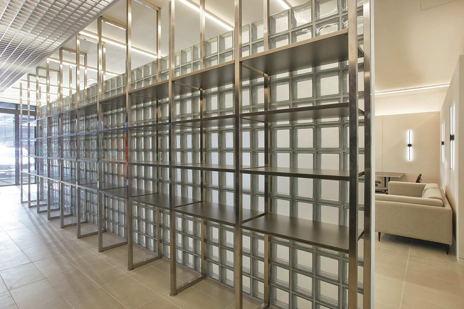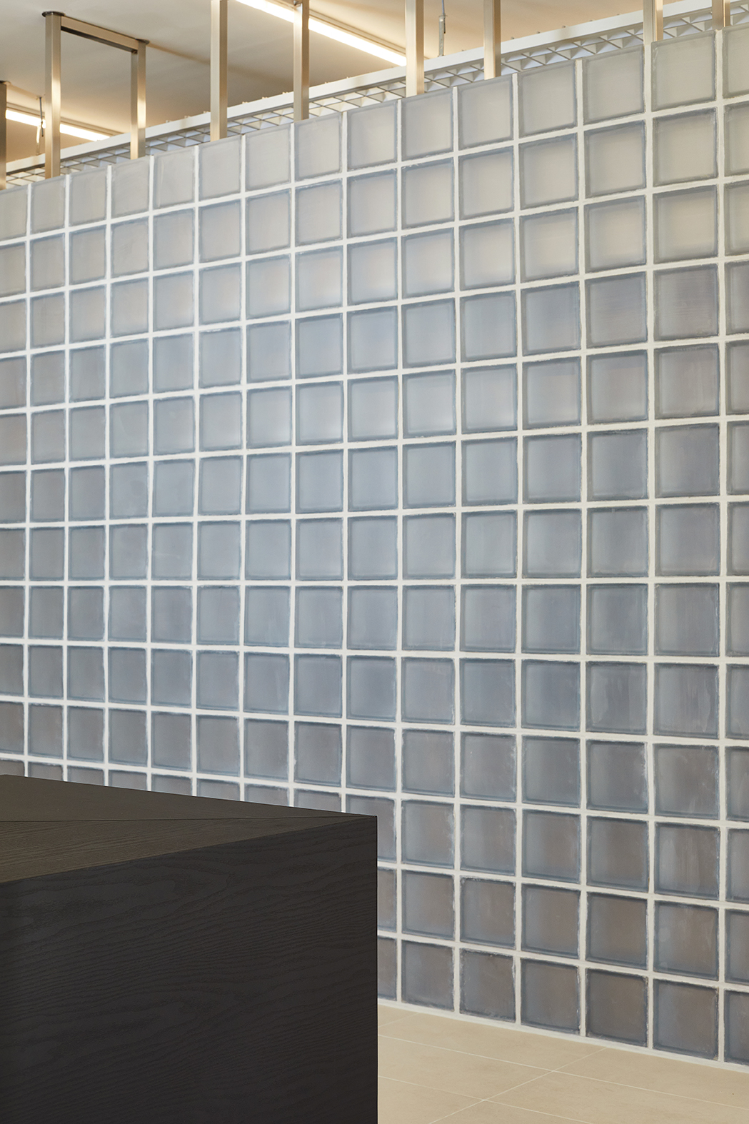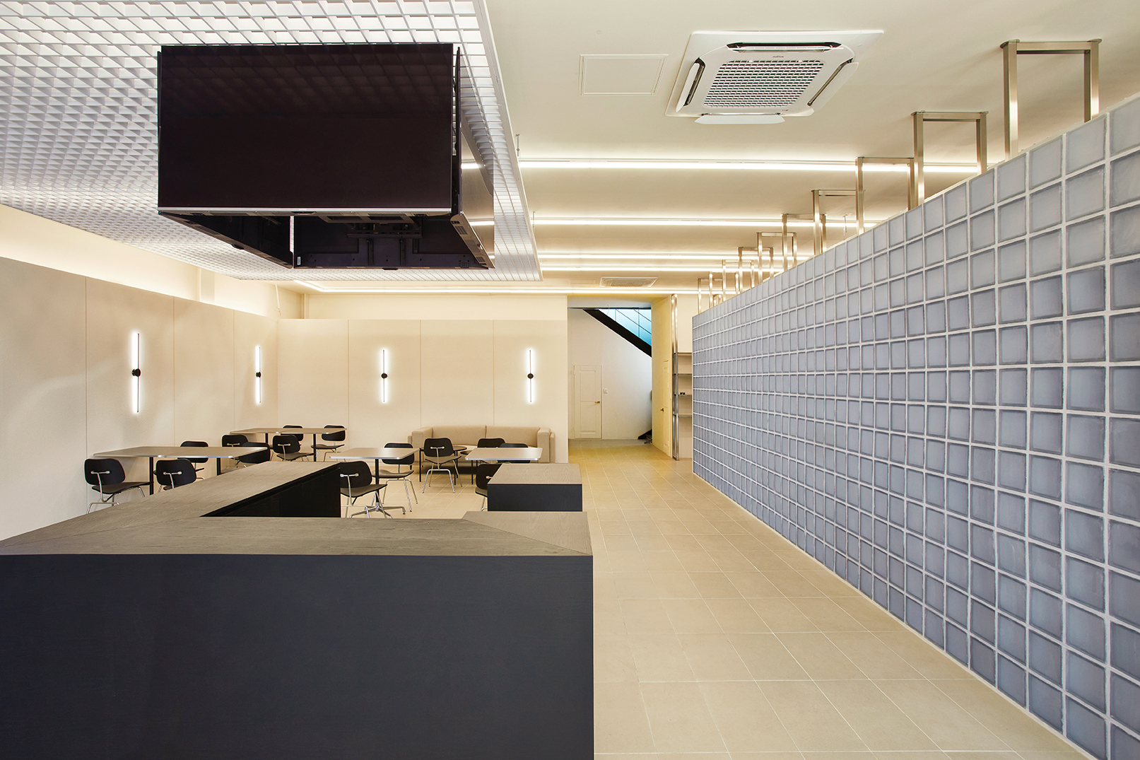 It provides a cool sense through a straight glass block and projects objects inside with translucent silhouettes to induce consumer curiosity. In addition, a connection with the glass block is formed through the grating of the ceiling, thereby forming a stable feeling. The counter and furniture in the center of space use black to balance the overall weight of the space.