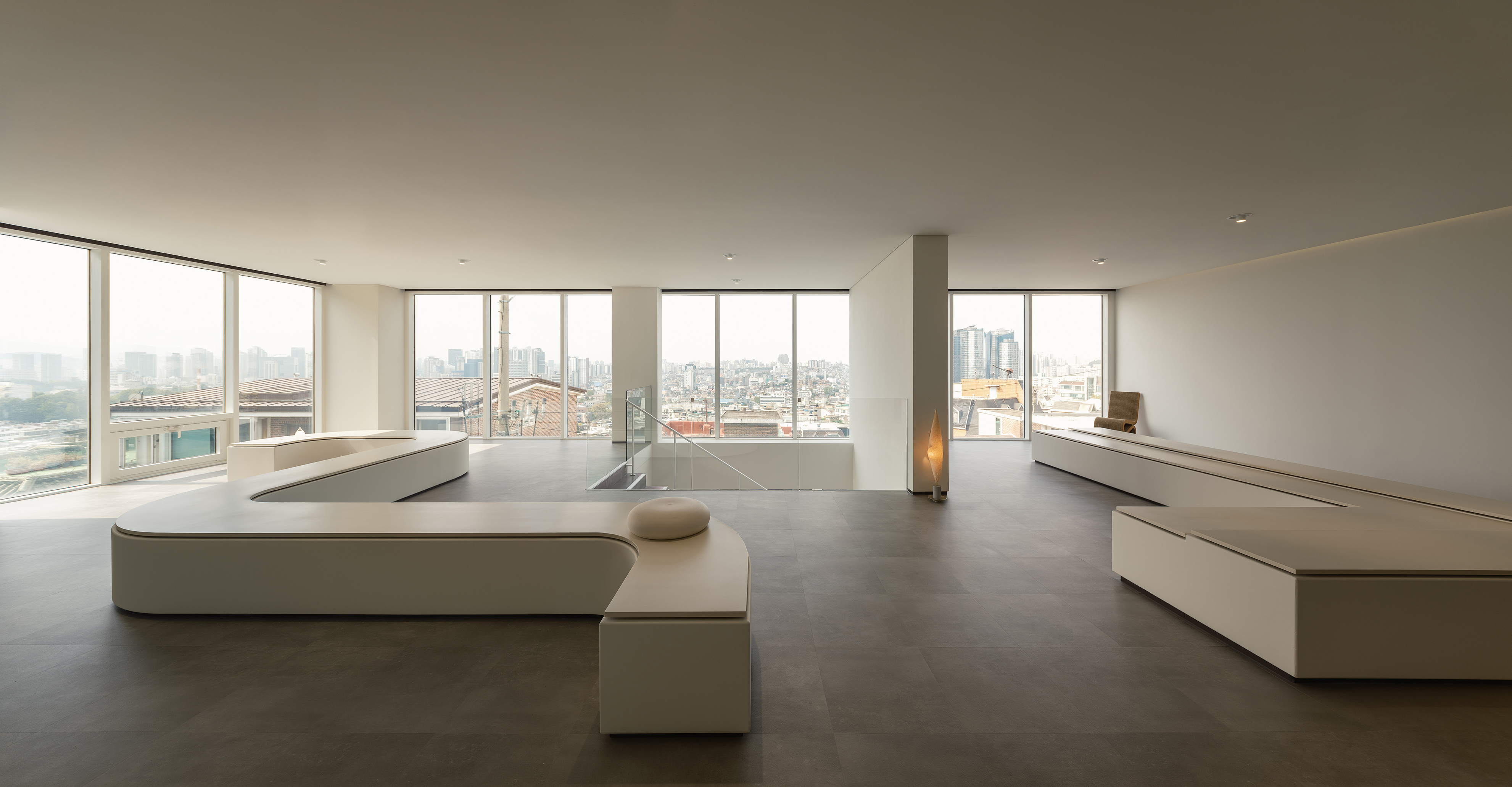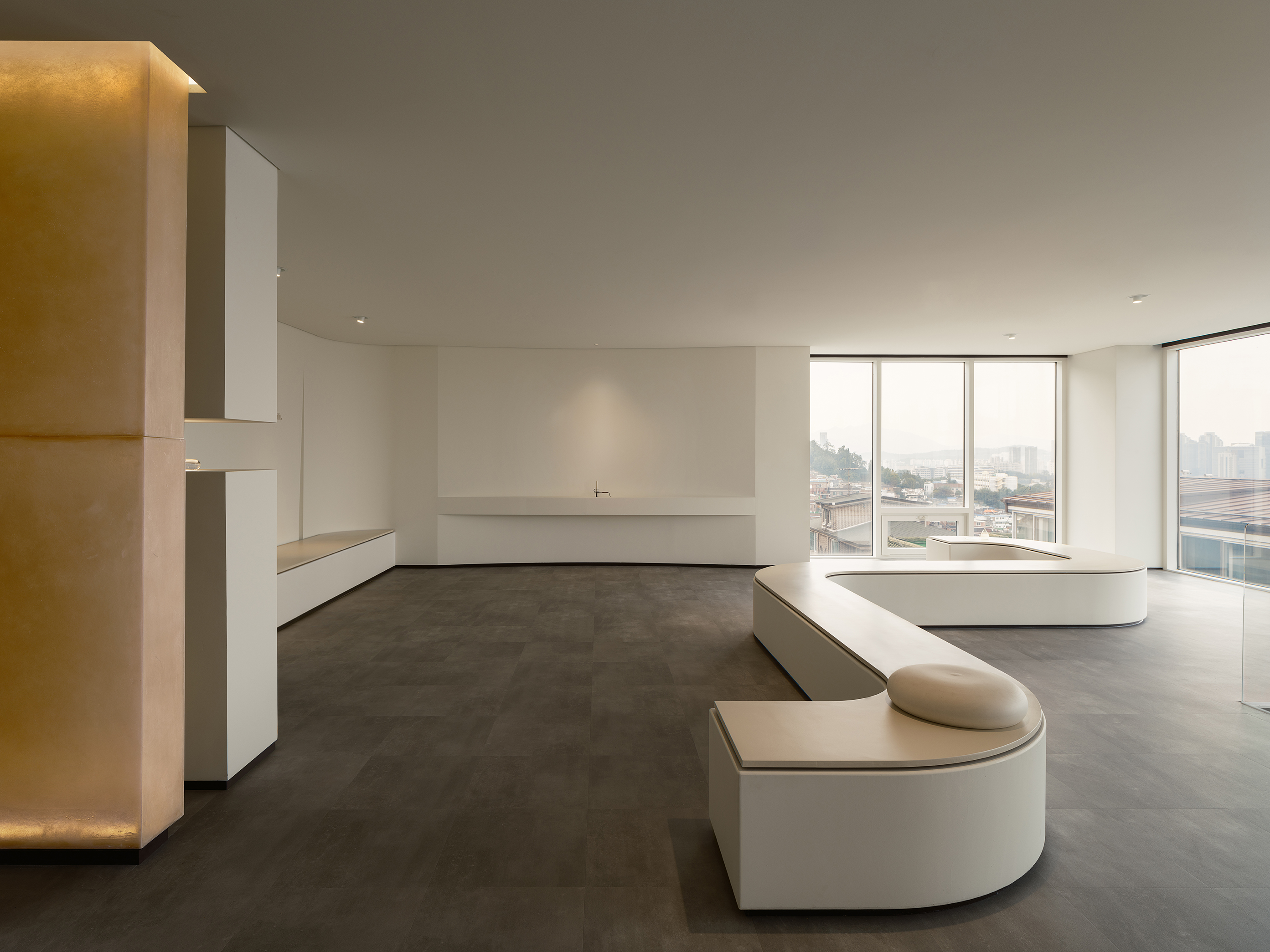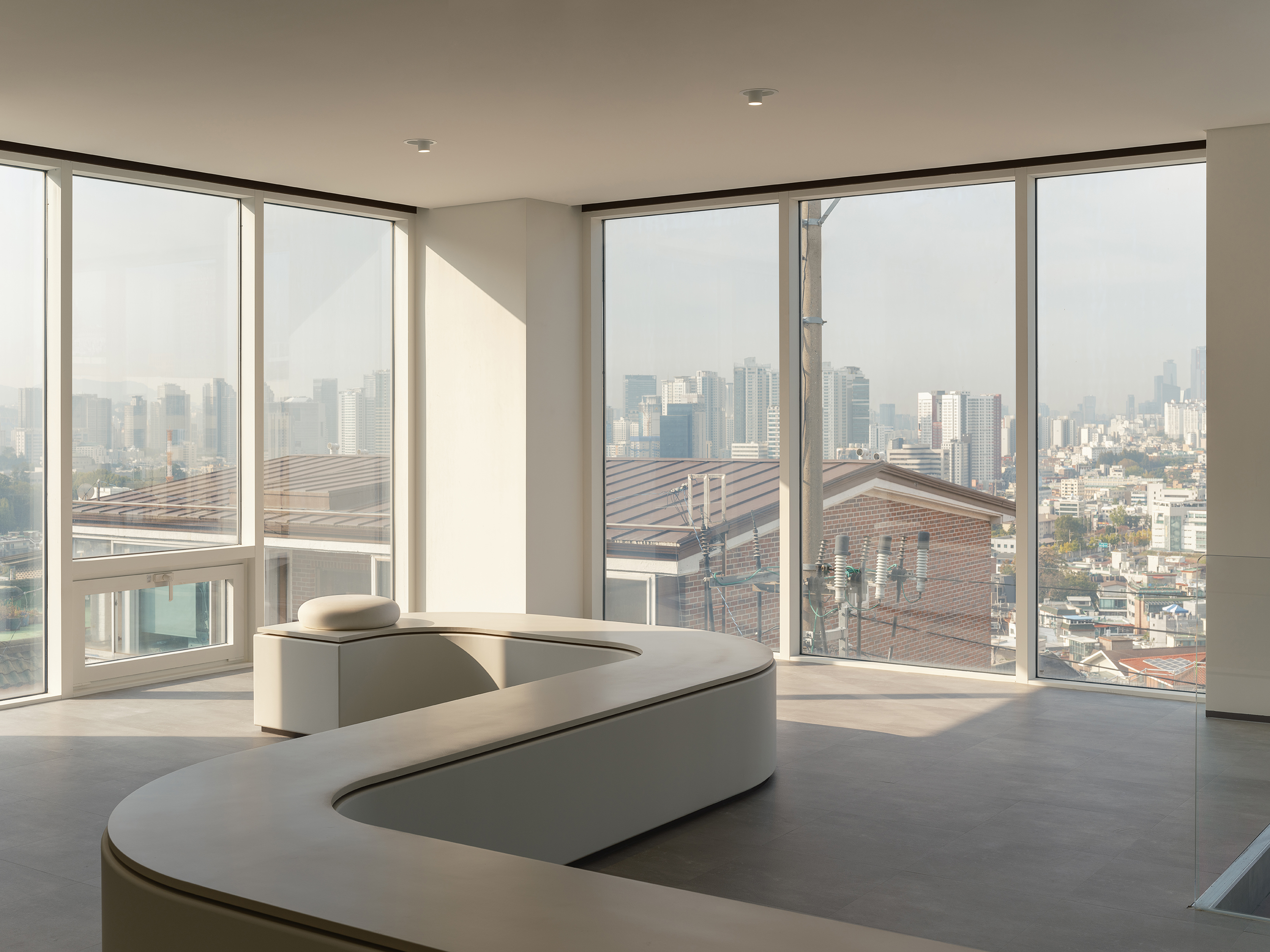 판매 공간과 유휴 공간으로구분되어있으며, 중앙에는 두공간을 분리하는 반투명 소재의 FRP 벽이있다. 명확하게 나눠지지 않은 공간구획으로 공간 사이에 틈이 발생한다. 그 틈은 고객들로 하여금 궁금증을 유발하여 벽 뒤의 공간으로 동선을 유도한다. 측면의 불필요한 시각적요소를 차단하여 서울이 내려다보이는 티룸전면의 전경에 보다 집중할 수 있도록 한다.