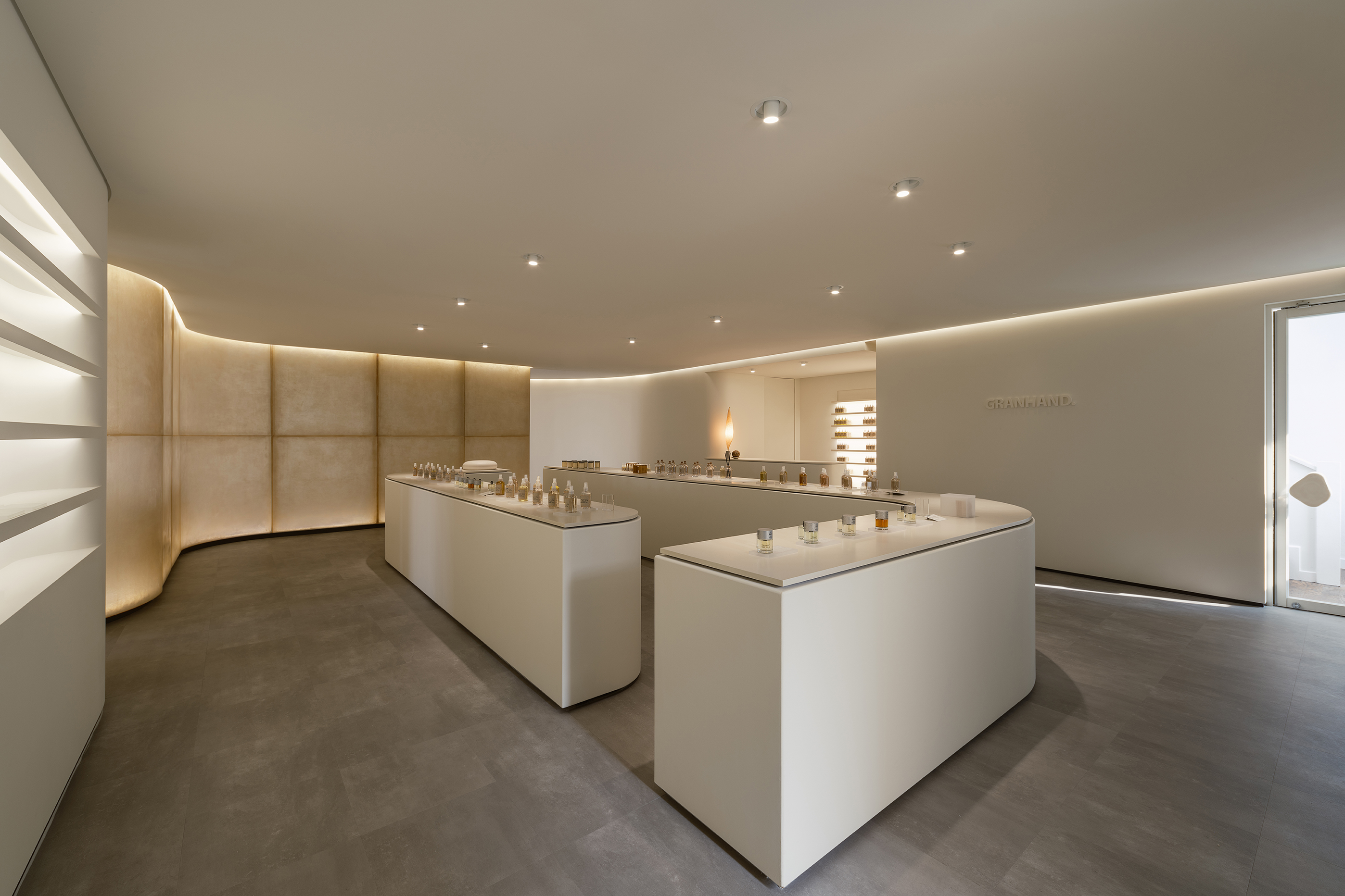 향을파는 공간은어쩌면, 기억을파는 공간일지도모른다. 밤을 지새우고맡았던 “푸른새벽공기의향"과 초여름 비가 내린 후 “풀밭의 향“, 나른한 일요일 오후 “바짝마른 이불향“, 그리고 “어머니 장롱속향“. 이런 모든 기억의 잔향들을 공간속에 담백하게 담아내고 싶었다. “물건을 팔지 않는 상점” 우리가 처음 이곳을 규정하고 제안한 문장이었다. 남산까지 어렵게 찾아와 제품만 사는 것 보다는 그곳에서의 좋은 기억을 담아가는 것에 더 큰의미를 두고 싶었다. 이제는 원한다면 어떤 물건이든 쉽게 배송받을 수 있는 시대이다. 따라서 브랜드가 갖고 있는, 눈에 보이지 않는 “기억의잔향(殘香)”을 판매하자고 제안하였다. 그렇게 그랑핸드 남산점은 제품을 시향하고 판매하는 공간과 차분한 공기속에 잠시 머무르며 차 한잔 마시며 쉴 수 있는 “유휴의공간”으로 분리하여 구성하였다. 이번 프로젝트에서는 모든 디자인요소를 빼내고 빼내어 더 이상 디자인 뺄 것 없이 은은한 기억의 잔향만 남아있는 공간을 만들어 내는 것에 집중하였다.