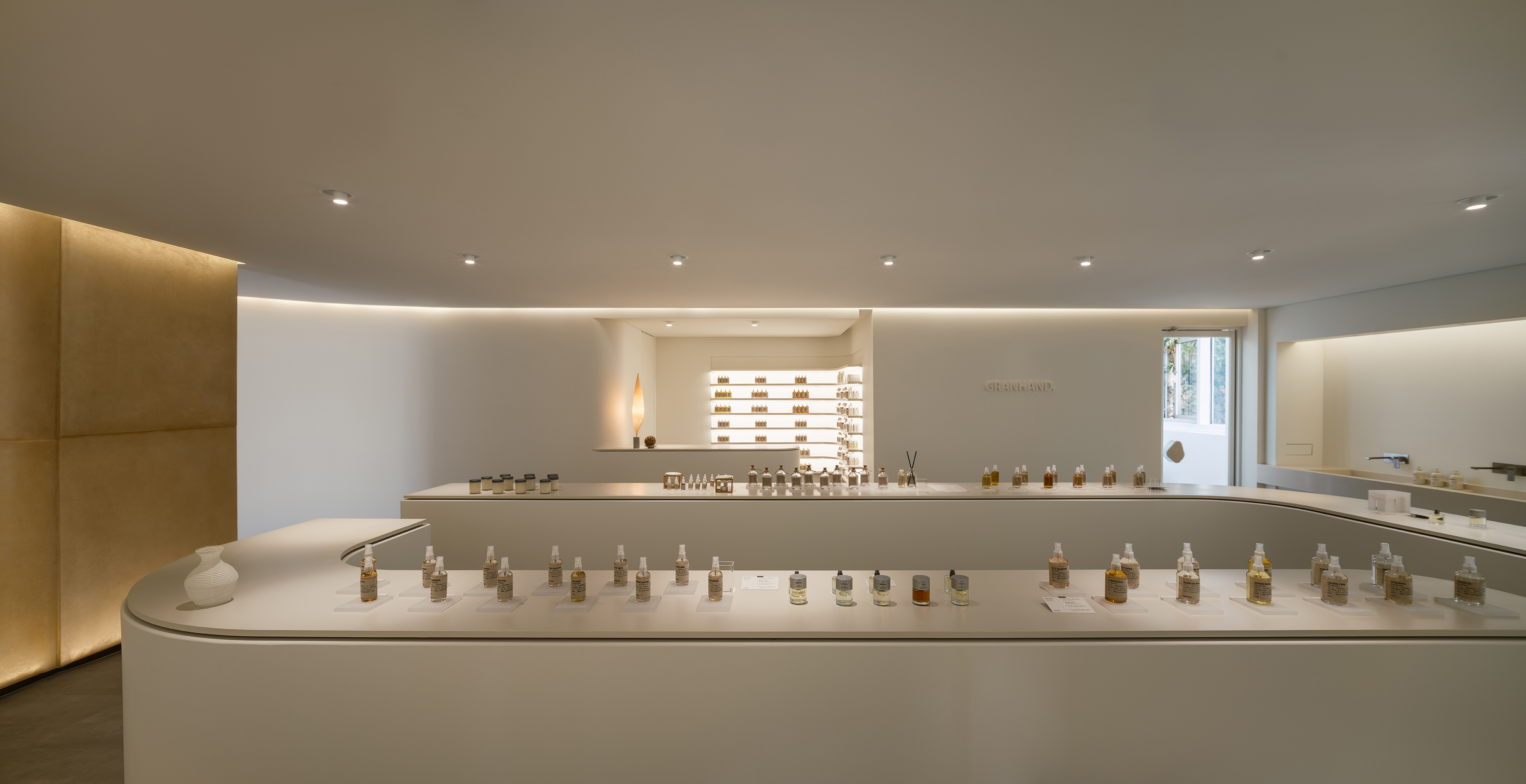 향을파는 공간은어쩌면, 기억을파는 공간일지도모른다. 밤을 지새우고맡았던 “푸른새벽공기의향"과 초여름 비가 내린 후 “풀밭의 향“, 나른한 일요일 오후 “바짝마른 이불향“, 그리고 “어머니 장롱속향“. 이런 모든 기억의 잔향들을 공간속에 담백하게 담아내고 싶었다. “물건을 팔지 않는 상점” 우리가 처음 이곳을 규정하고 제안한 문장이었다. 남산까지 어렵게 찾아와 제품만 사는 것 보다는 그곳에서의 좋은 기억을 담아가는 것에 더 큰의미를 두고 싶었다. 이제는 원한다면 어떤 물건이든 쉽게 배송받을 수 있는 시대이다. 따라서 브랜드가 갖고 있는, 눈에 보이지 않는 “기억의잔향(殘香)”을 판매하자고 제안하였다. 그렇게 그랑핸드 남산점은 제품을 시향하고 판매하는 공간과 차분한 공기속에 잠시 머무르며 차 한잔 마시며 쉴 수 있는 “유휴의공간”으로 분리하여 구성하였다. 이번 프로젝트에서는 모든 디자인요소를 빼내고 빼내어 더 이상 디자인 뺄 것 없이 은은한 기억의 잔향만 남아있는 공간을 만들어 내는 것에 집중하였다.