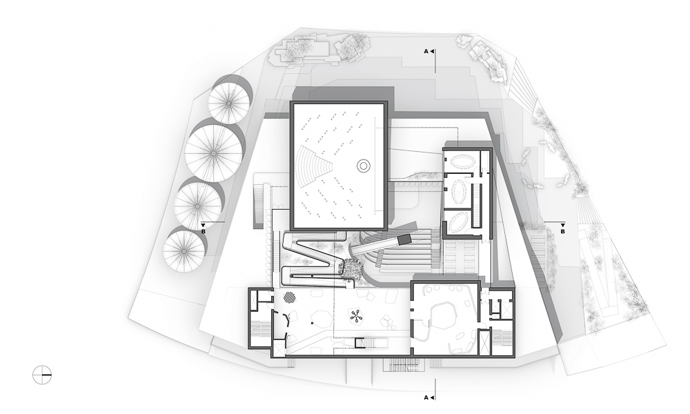 최소한의 재료를 사용하여 최대 볼륨을 만들었기에 처음부터 지속 가능성의 원칙을 적용했다. 세 개의 큐브는 추상적인 풍경으로 형성된 다른 기능(레스토랑, 프리쇼, 사무실, 뒷마당)과 함께 기단 위에 두었다. 이것이 중앙에 큰 볼륨을 만들고 지붕의 역할을 하는 기술적인 구름은 그늘과 편안함을 만들어낸다. 자연과 기술 사이에 사람이 있다.