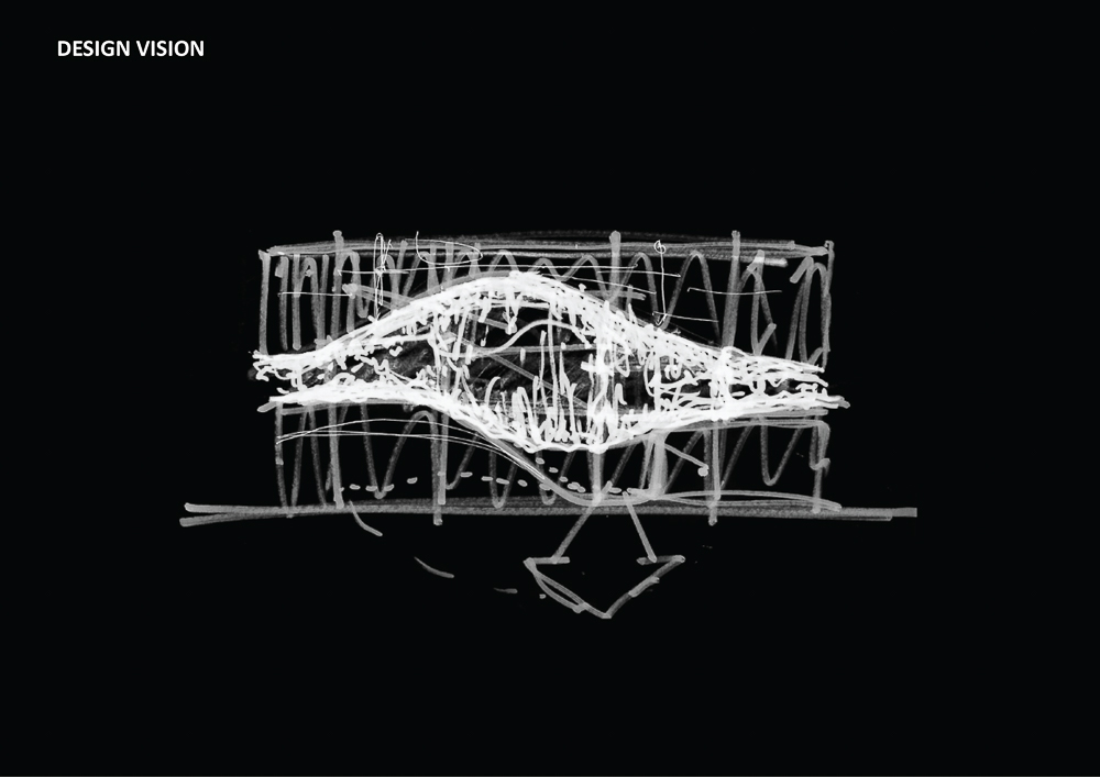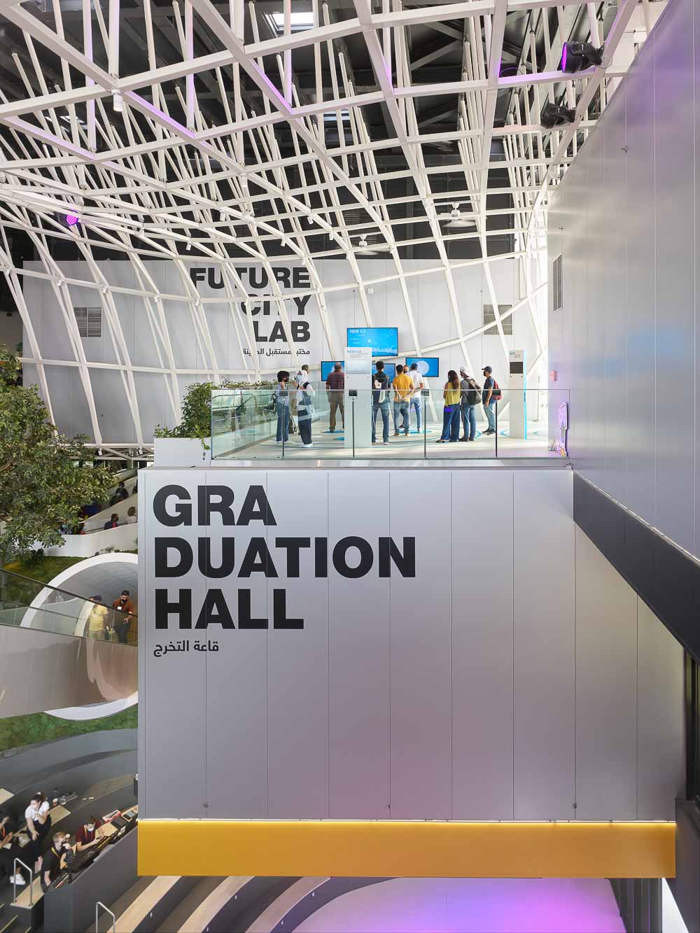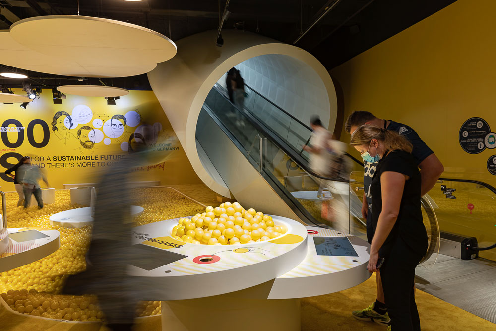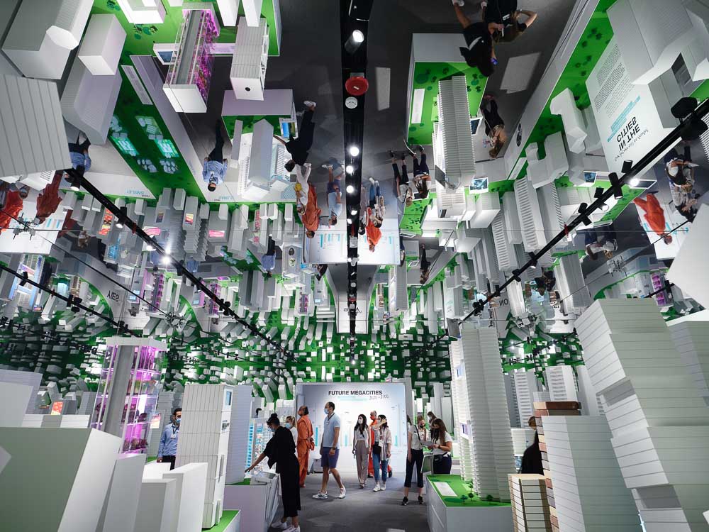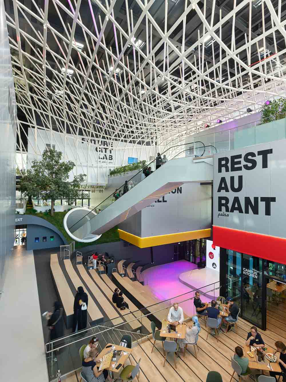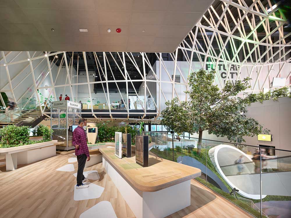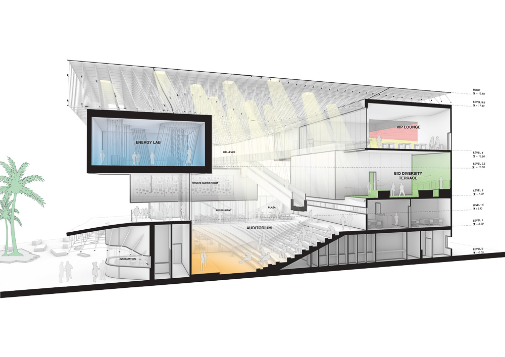 캔틸레버 큐브의 위치는 넓은 중앙 아트리움 및 이벤트 공간을 생성한다. 방문자 경험의 중심에 있는 이 지붕 덮인 수직 공간은 모든 기능 영역을 시각적으로 연결하고, 길 찾기를 도우며, 다양한 시각적 관계와 접근 지점을 생성하고, 많은 방문자 수 관리를 가능하게 한다. 방문자 동선은 사람들을 계속해서 테라스(입방체 공간 위)로 안내한다. 그들은 과거와 미래의 궤적을 보고 다른 사람들과 교류하며 엑스포 현장의 전망을 즐긴다. 사실과 허구로 디자인된 전시 공간(에너지 연구실, 미래 도시 연구실, 생물다양성 연구실)은 큐브 내부에서 개별적인 몰입형 경험을 제공하며 테라스 전시는 그룹형태의 상호작용의 장으로 초대한다.