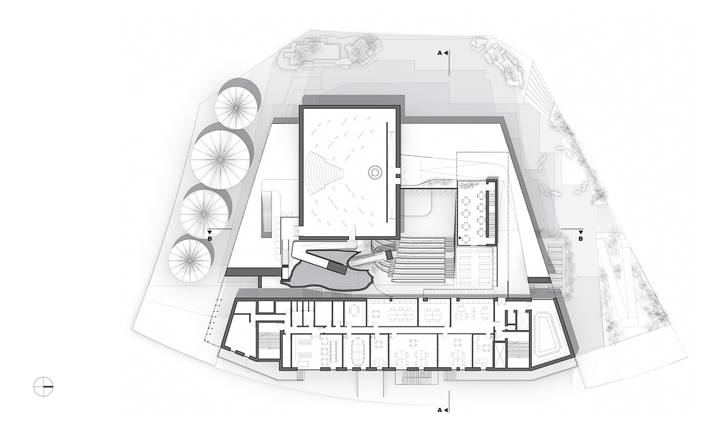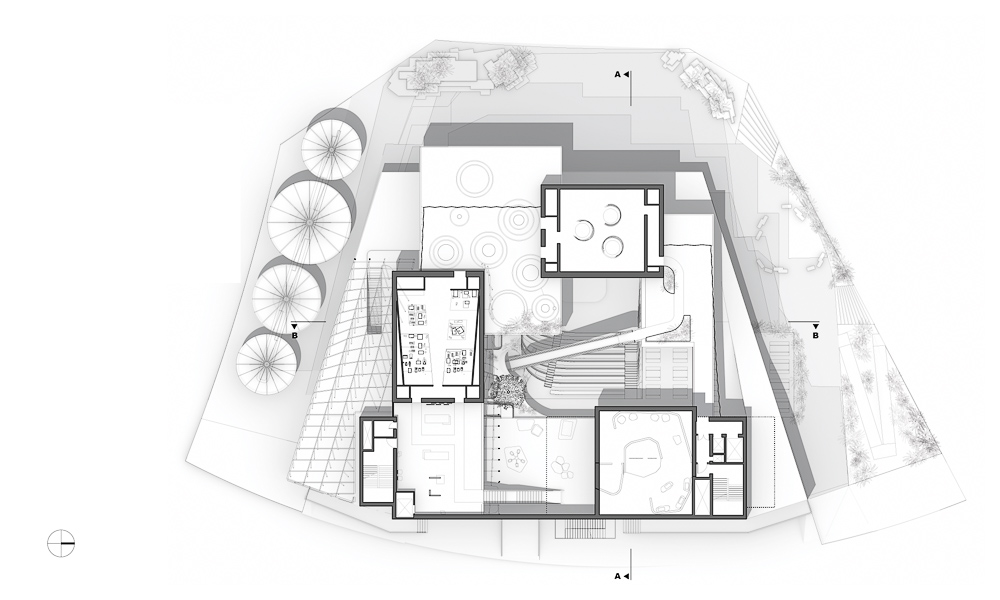 최소한의 재료를 사용하여 최대 볼륨을 만들었기에 처음부터 지속 가능성의 원칙을 적용했다. 세 개의 큐브는 추상적인 풍경으로 형성된 다른 기능(레스토랑, 프리쇼, 사무실, 뒷마당)과 함께 기단 위에 두었다. 이것이 중앙에 큰 볼륨을 만들고 지붕의 역할을 하는 기술적인 구름은 그늘과 편안함을 만들어낸다. 자연과 기술 사이에 사람이 있다.