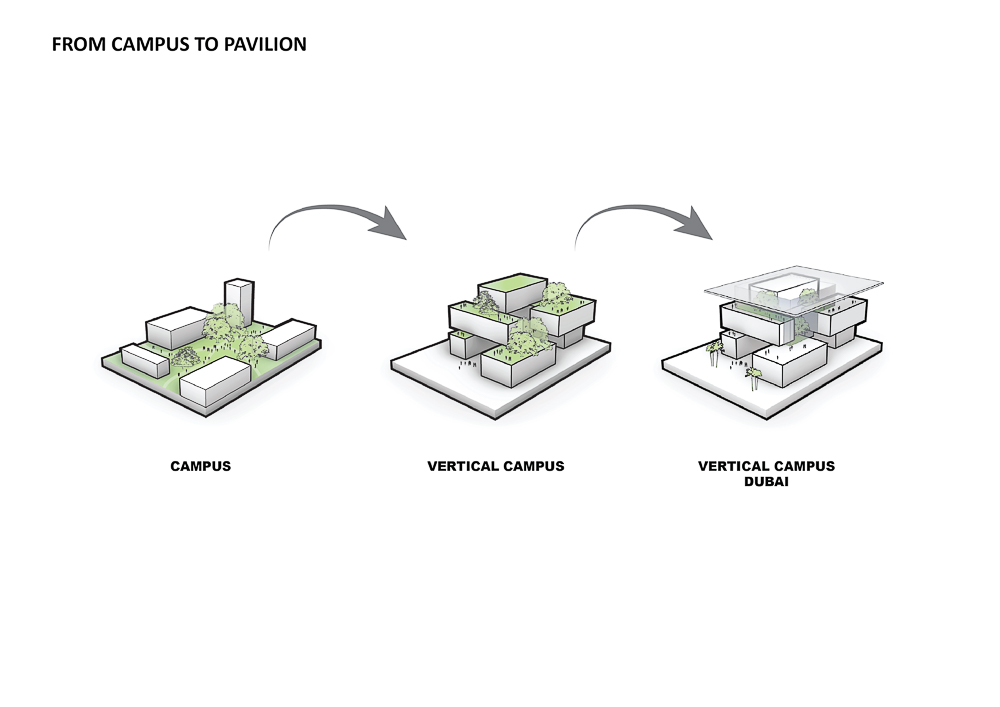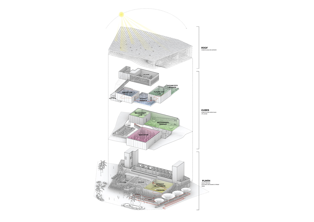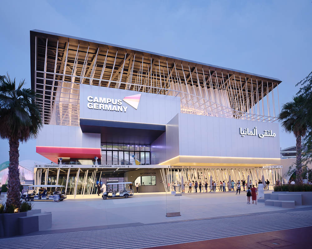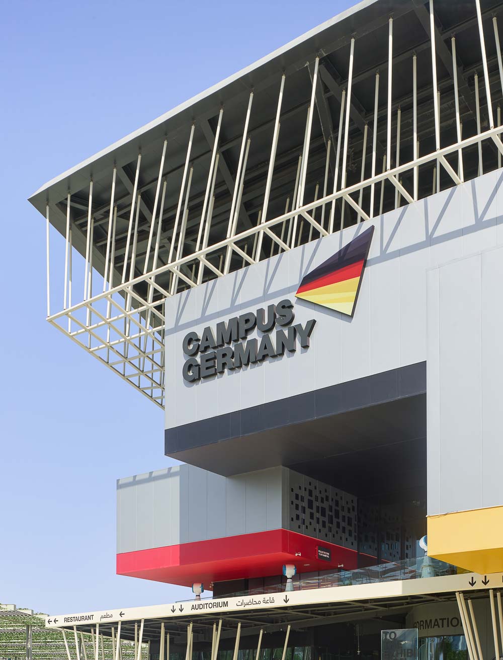 건물 디자인은 전시의 일부이며 사람을 연결하는 도구이다. 우리는 엑스포 모토인 ‘Connecting Minds, Creationing Minds, Creating the Future(마음의 연결, 미래의 창조)’라는 주제를 다루고 싶었기 때문에 독일관을 지식, 아이디어 및 혁신의 교환을 위한 열린 장소인 ‘캠퍼스’로 선택했다. 건물을 대지에 수평으로 배치하는 대신 세 개의 매달린 큐브가 수직으로 조립된다. 이 느슨하고 다공성의 볼륨을 쌓아 올린 방식은 단일 형식이 아닌 앙상블로서 상호 연결성을 암시한다.