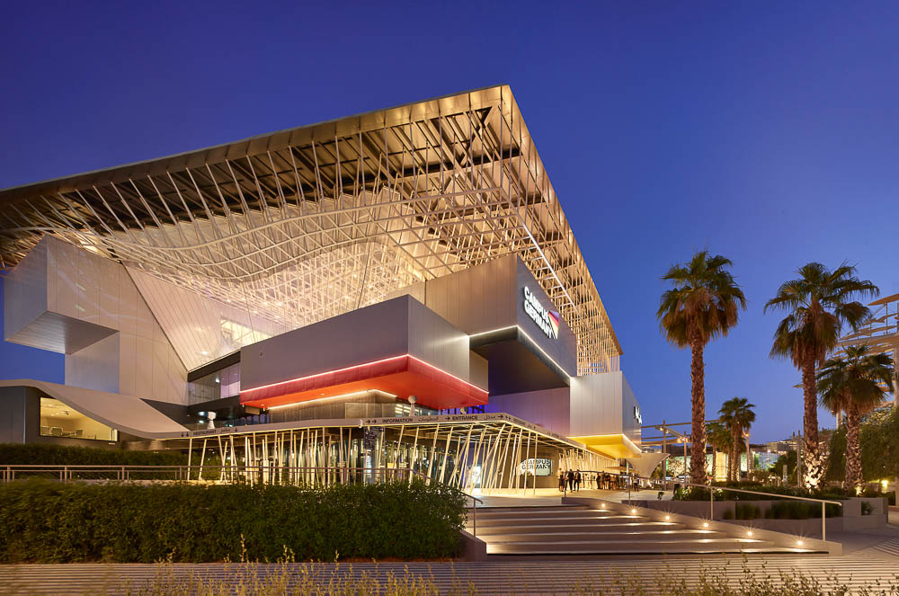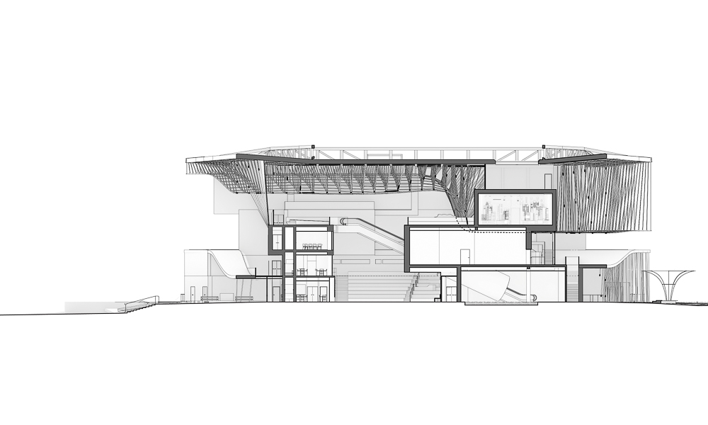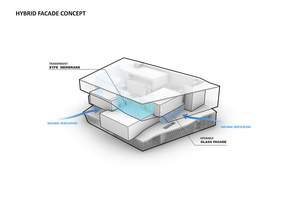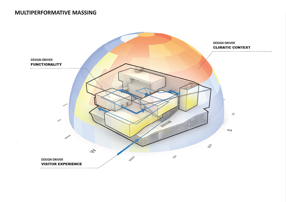 LAVA incorporated the principle of sustainability right from the start by using the minimum amount of material to create maximum volume. Three cubes were stacked on top of a plinth with other functions (restaurant, pre-show, office, back-of-house) formed as an abstract landscape. This created a large volume at the center, and a roof creates shade and comfort – a technical cloud. People between nature and technology. The clever positioning of the stacked cubes is driven by local climate and features passive energy-saving features that reduce the impact of direct sunlight, generate natural shade, decrease the heat load and optimize the indoor climate. A hybrid facade minimizes the sense of building bulk and creates an iconic framing of the space. At the upper level a dynamic arrangement of 900 vertical steel poles, a forest of trees swaying in the wind, creates movement. With gradually changing angles they frame the central atrium space and modulate light.